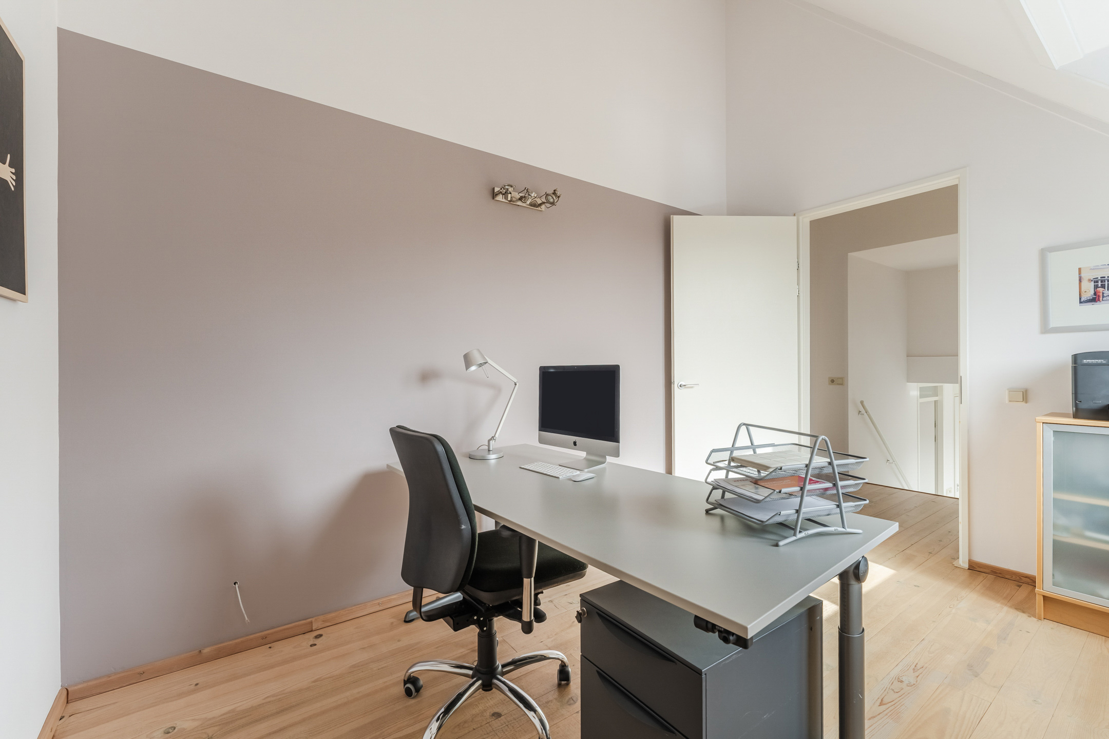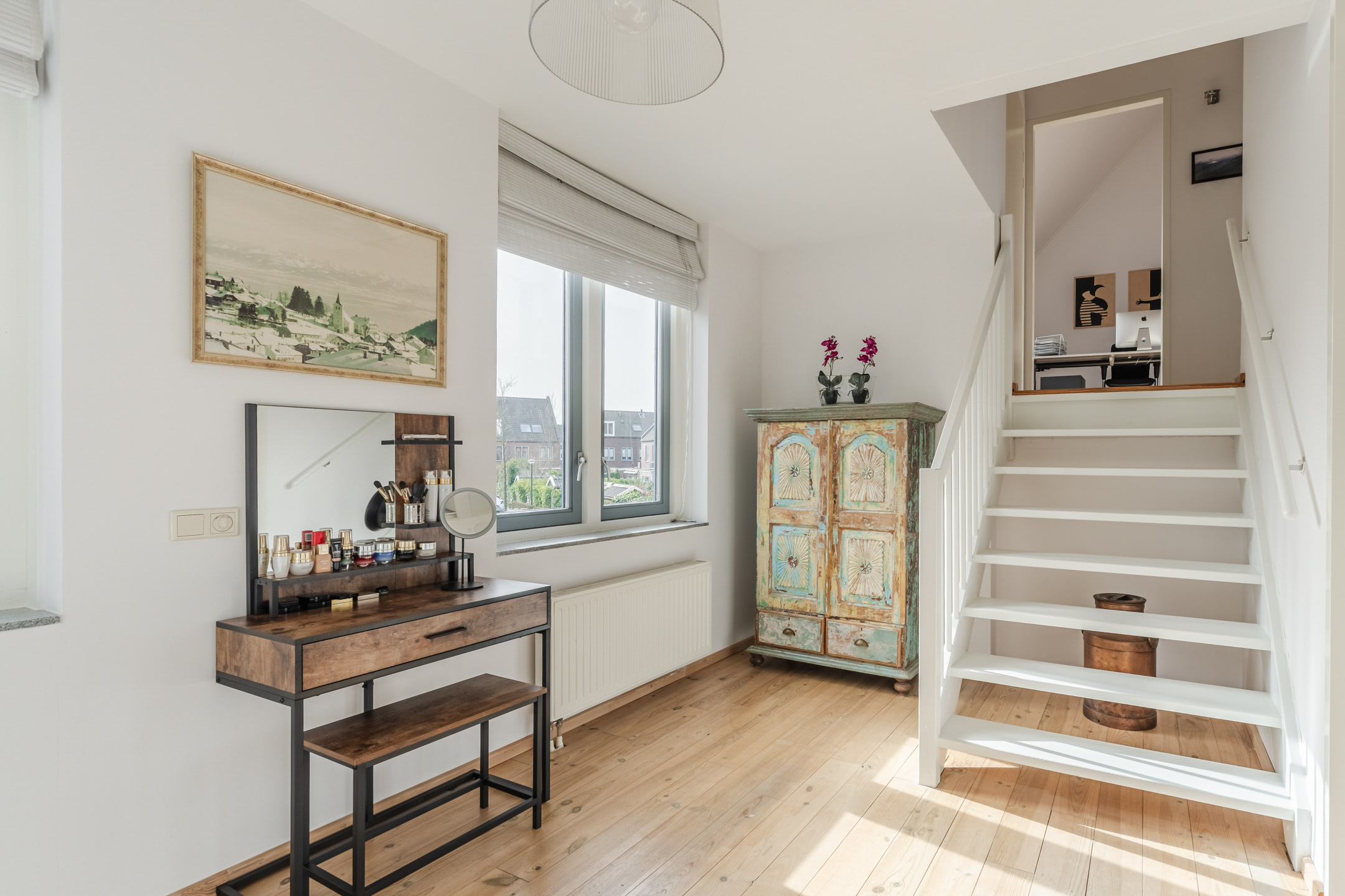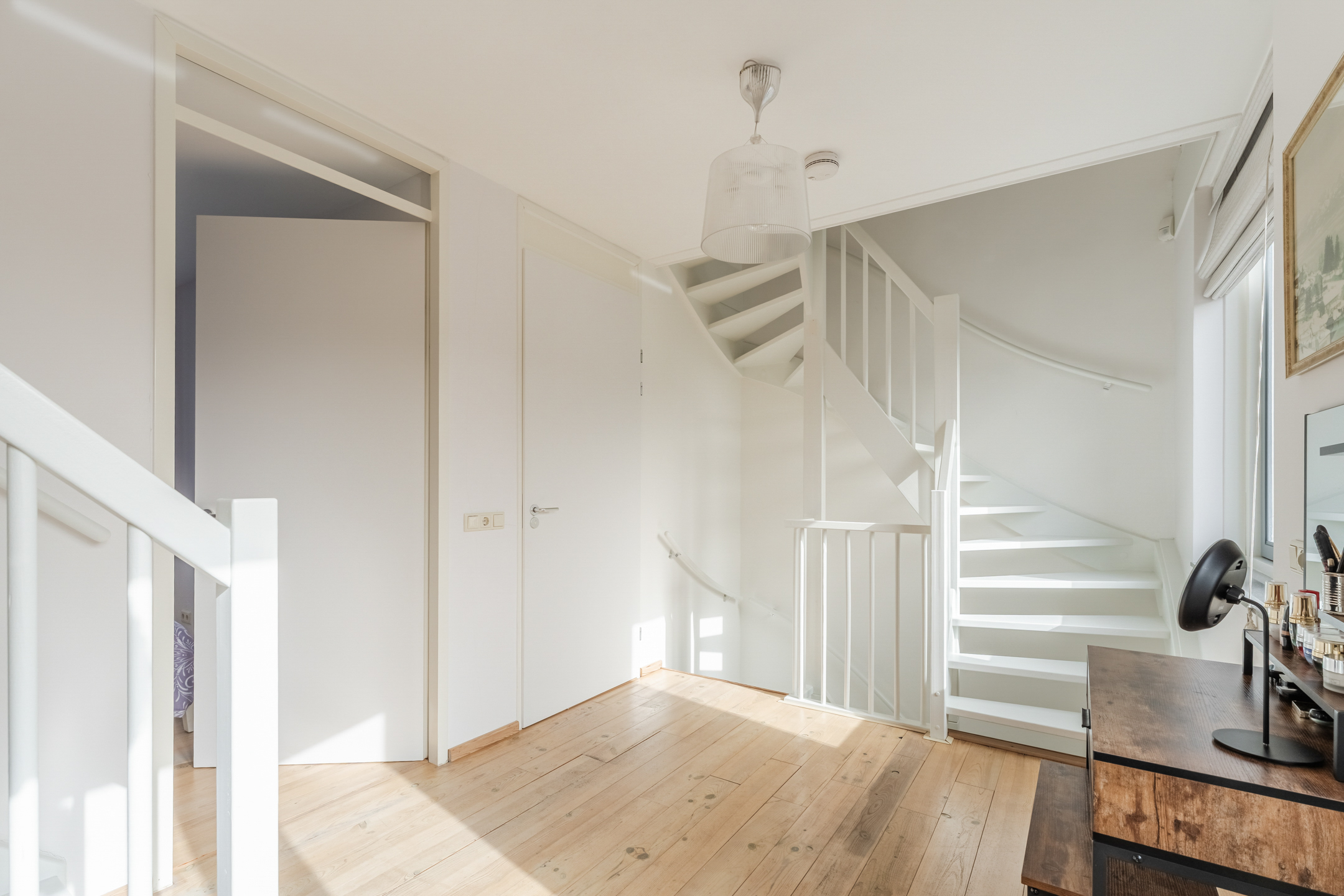 De gehele eerste verdieping is voorzien van lichte grenen lamelparket en strak gestucte wanden en plafonds.