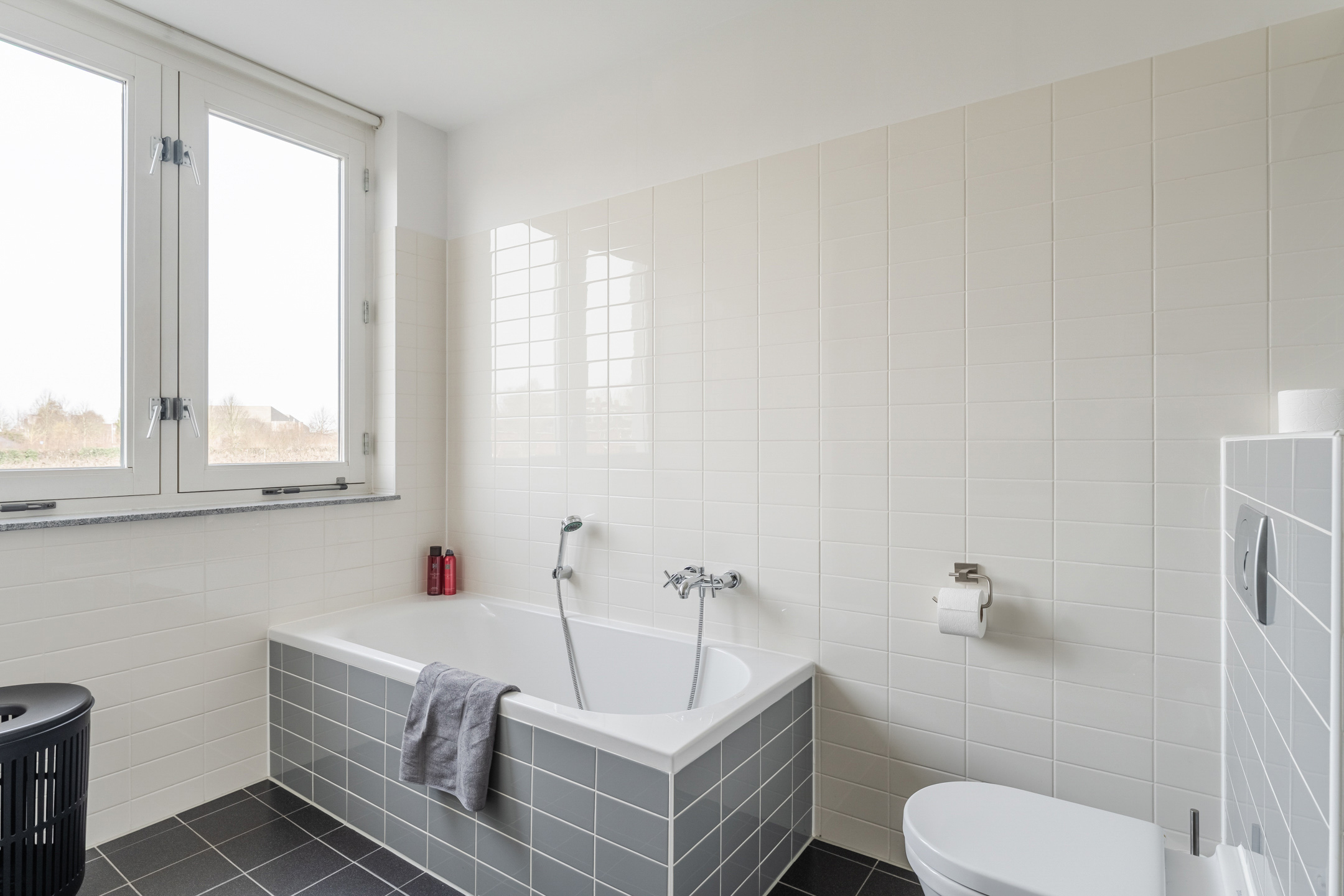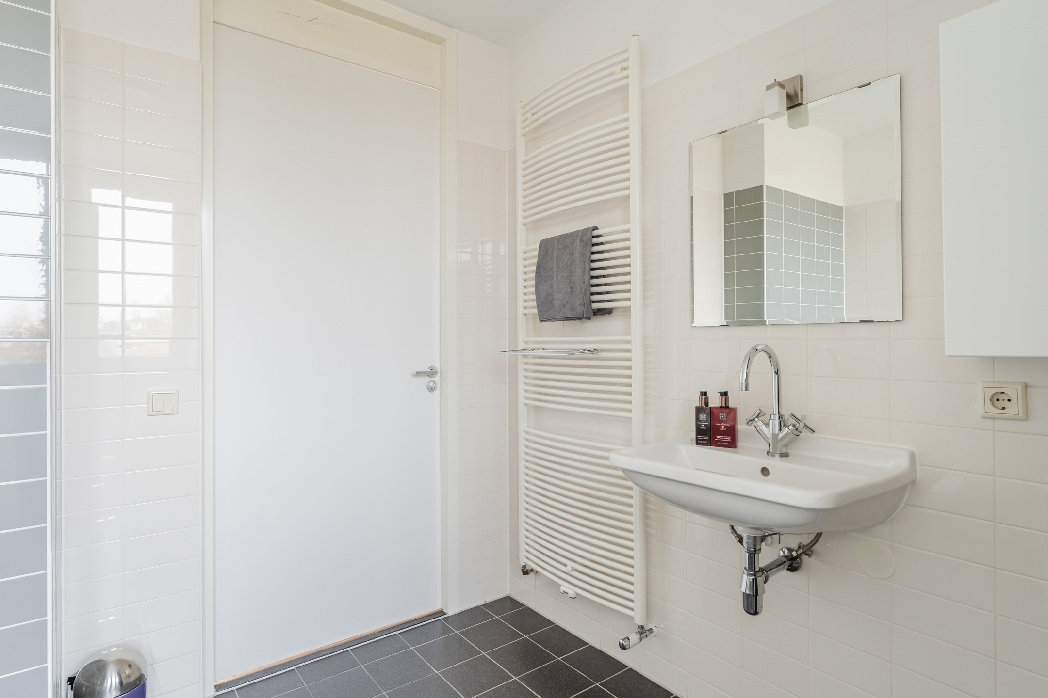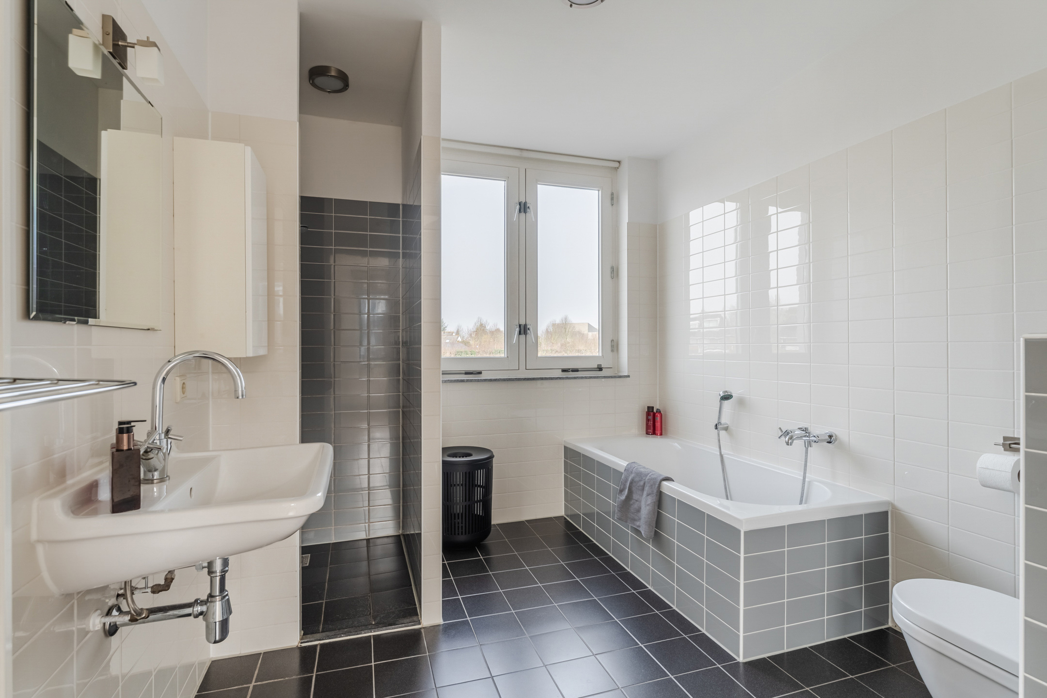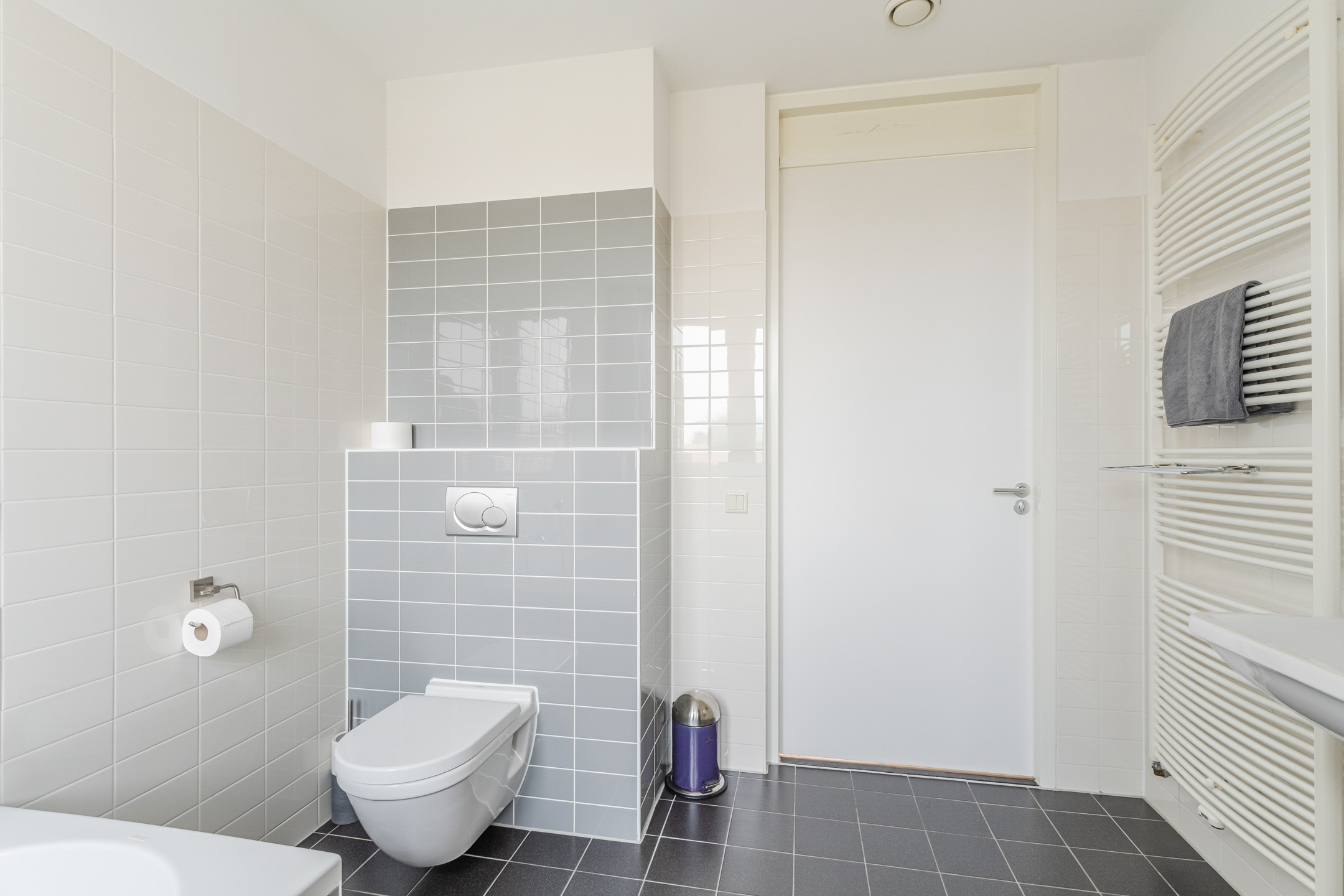 Ook tref je aan de voorzijde van de woning de royale en moderne badkamer (ca. 2.63 x 3.23 m). Deze ruimte is afgewerkt met een zwarte vloertegel met witte spikkels en lichtgrijze wandtegels in de douche, rondom het bad en achter het toilet, gecombineerd met witte wandtegels. De badkamer heeft een inloopdouche, een ligbad, een wastafel, een design radiator, mechanische ventilatie en een raam voor daglicht en natuurlijke ventilatie.