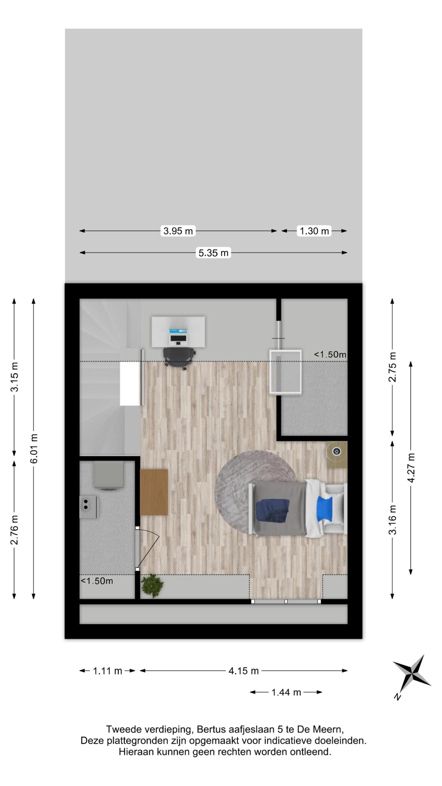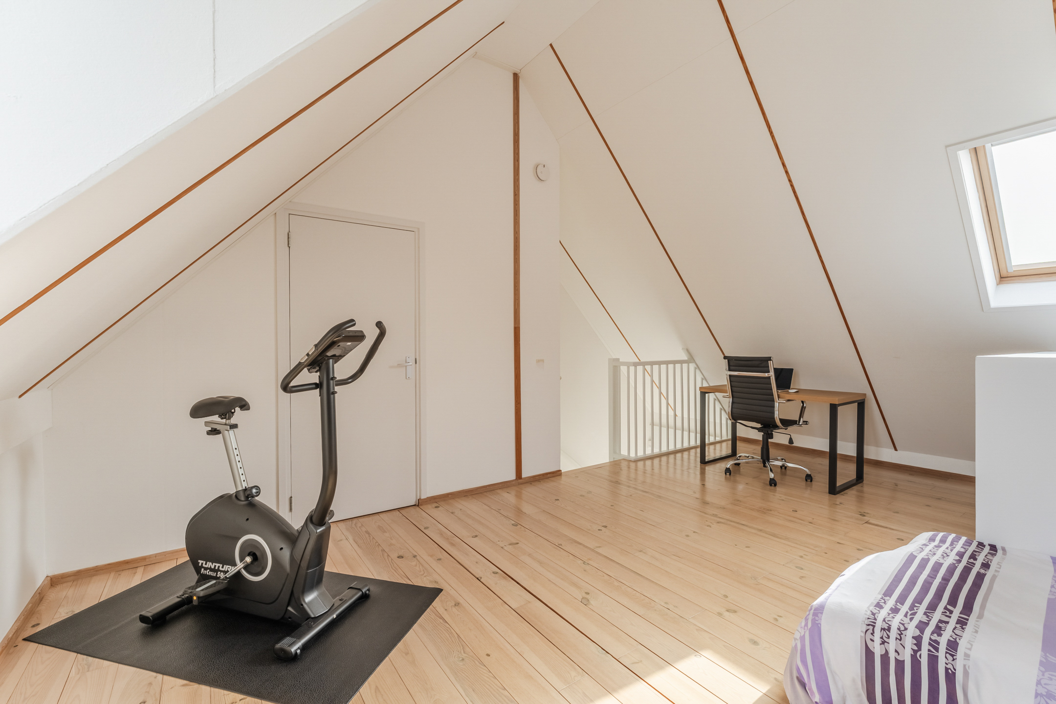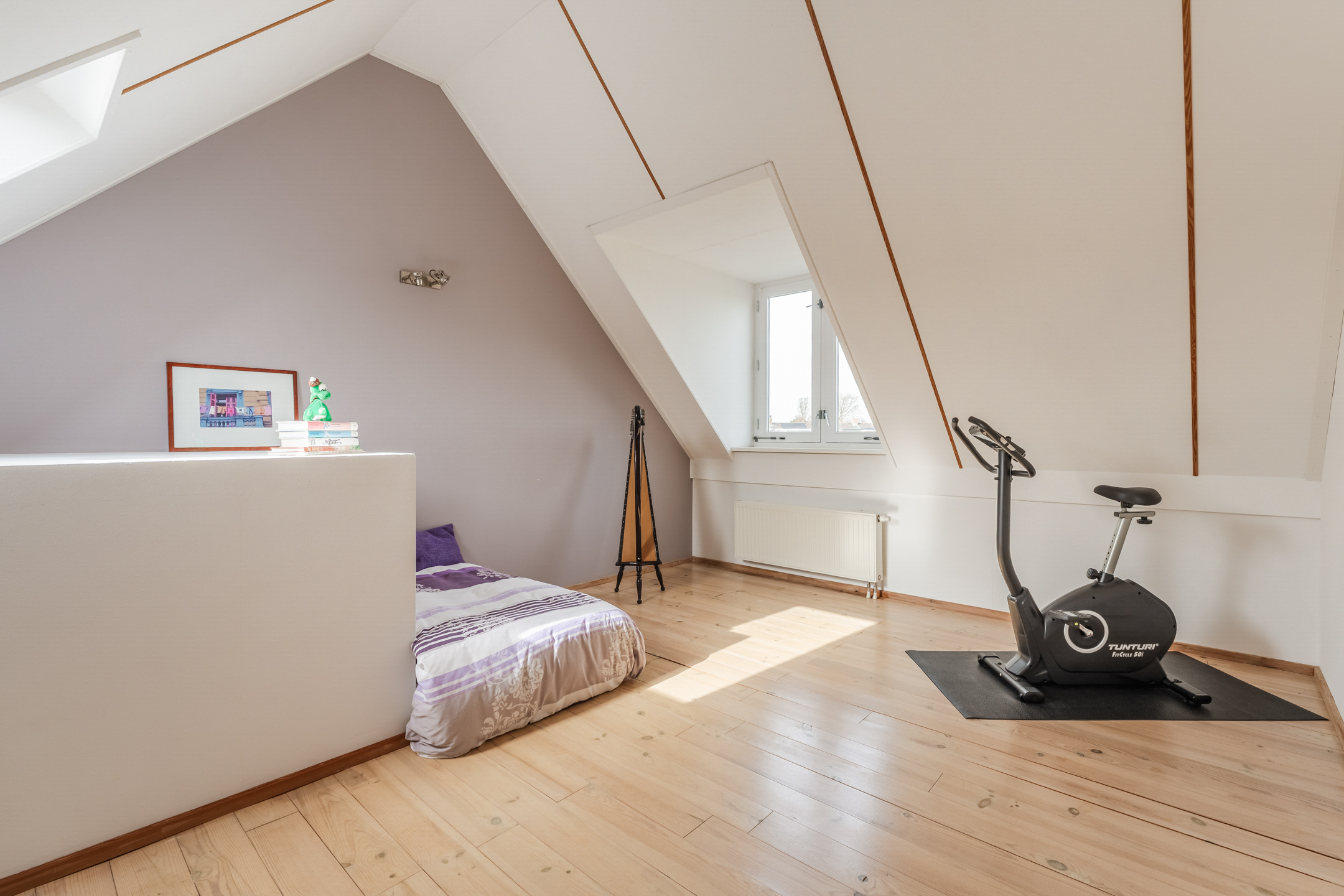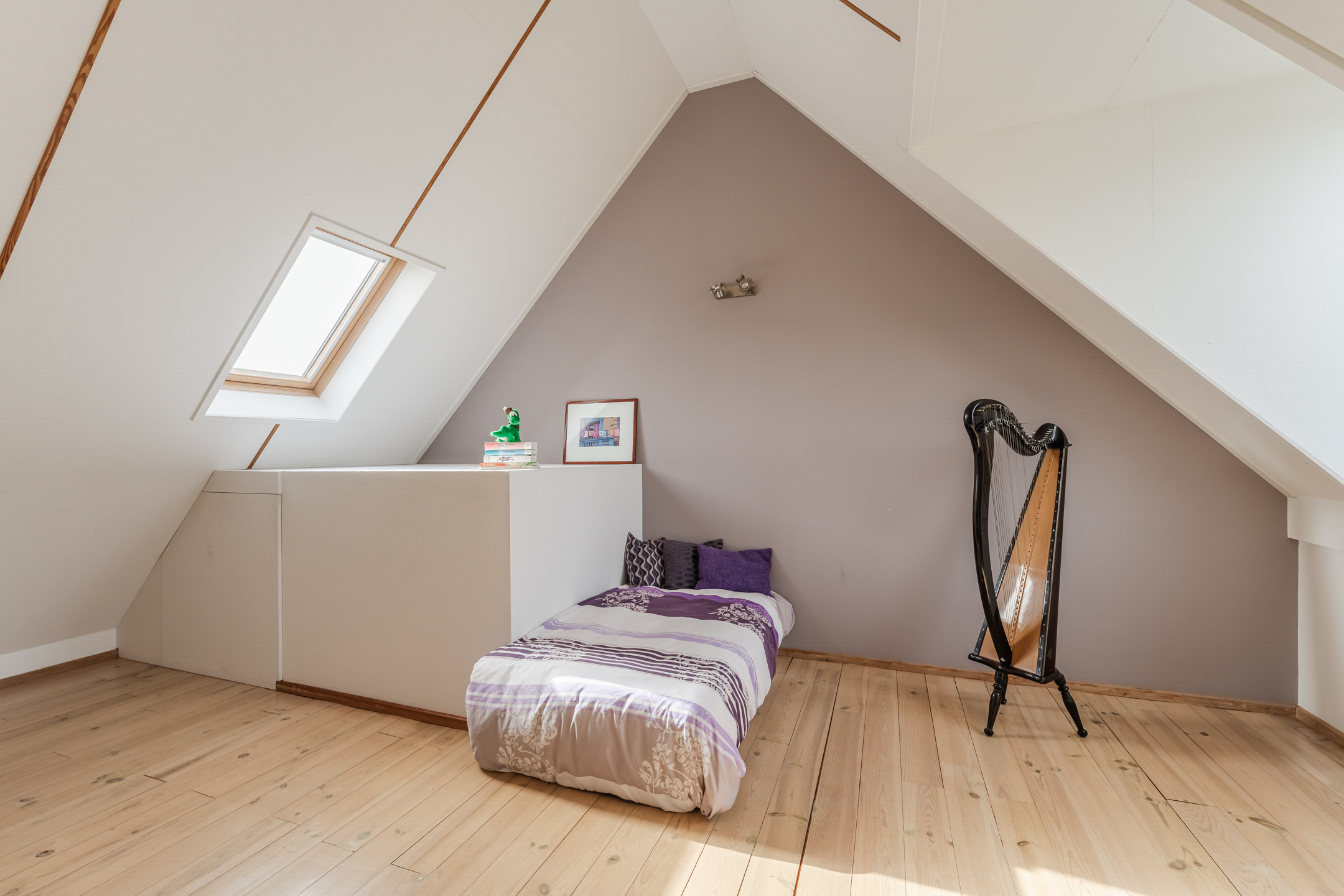 Via de vaste trap bereik je de tweede verdieping (ca. 4.27/3.16 x 5.35 m). Deze verdieping bestaat uit een royale, open ruimte met veel daglicht dankzij de plaatsing van een groot Velux dakraam en een dakkapel. Wat direct opvalt is dat de slaapkamer, door de hoge nokhoogte, ontzettend ruimtelijk aanvoelt.