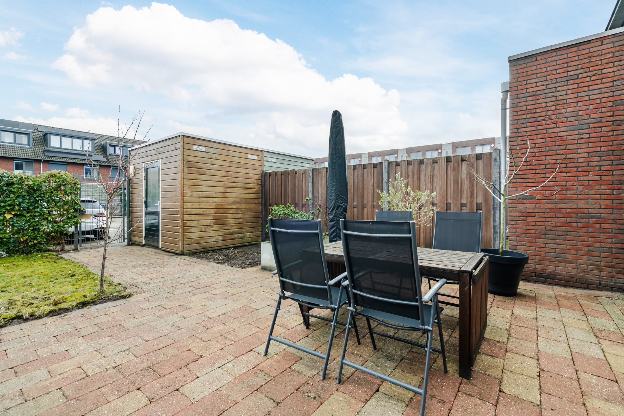 Middels de openslaande deuren in de woonkamer, bereik je de ruime achtertuin. De achtertuin, gelegen op het oosten (ochtend-/ middagzon!), is een heerlijke plek om te genieten van het buitenleven.