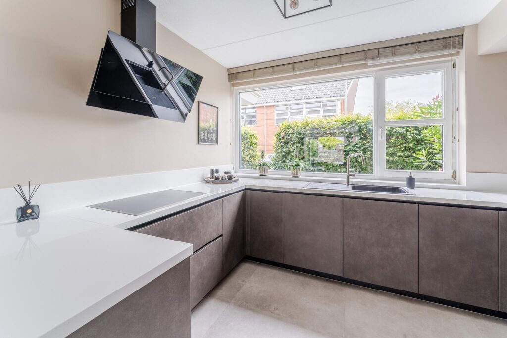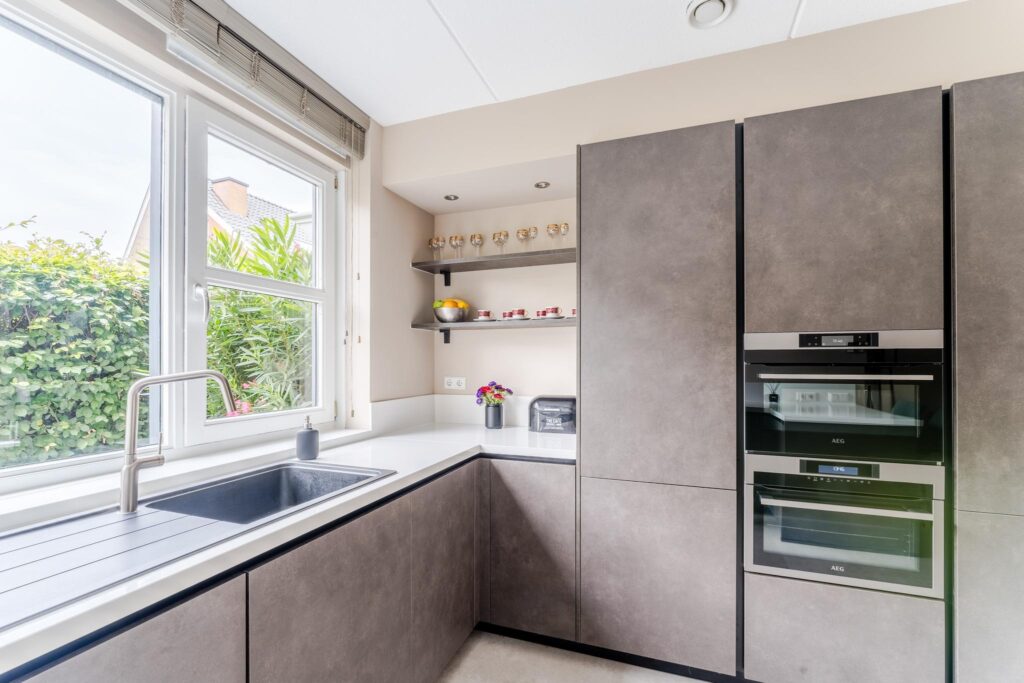Aan de voorzijde van de woning bevindt zich de verzorgde en compleet uitgeruste keuken (ca. 11m2), die werkelijk een lust voor het oog is. Deze moderne keuken (vernieuwd in 2022), uitgevoerd in een chique U-opstelling met een gezellige bar, is voorzien van alle wenselijke apparatuur. Denk aan een inductiekookplaat, een elegante oven, een handige magnetron, een vaatwasser, een royale koel-/vriescombinatie en een moderne recirculatie afzuigkap. De keuken is uitgevoerd in een luxe, donkere kleurstelling, gecombineerd met een smaakvol licht composiet werkblad. Door de grote raampartij in de keuken komt er een overvloed aan natuurlijk licht binnen, wat zorgt voor een vrolijke en uitnodigende sfeer.