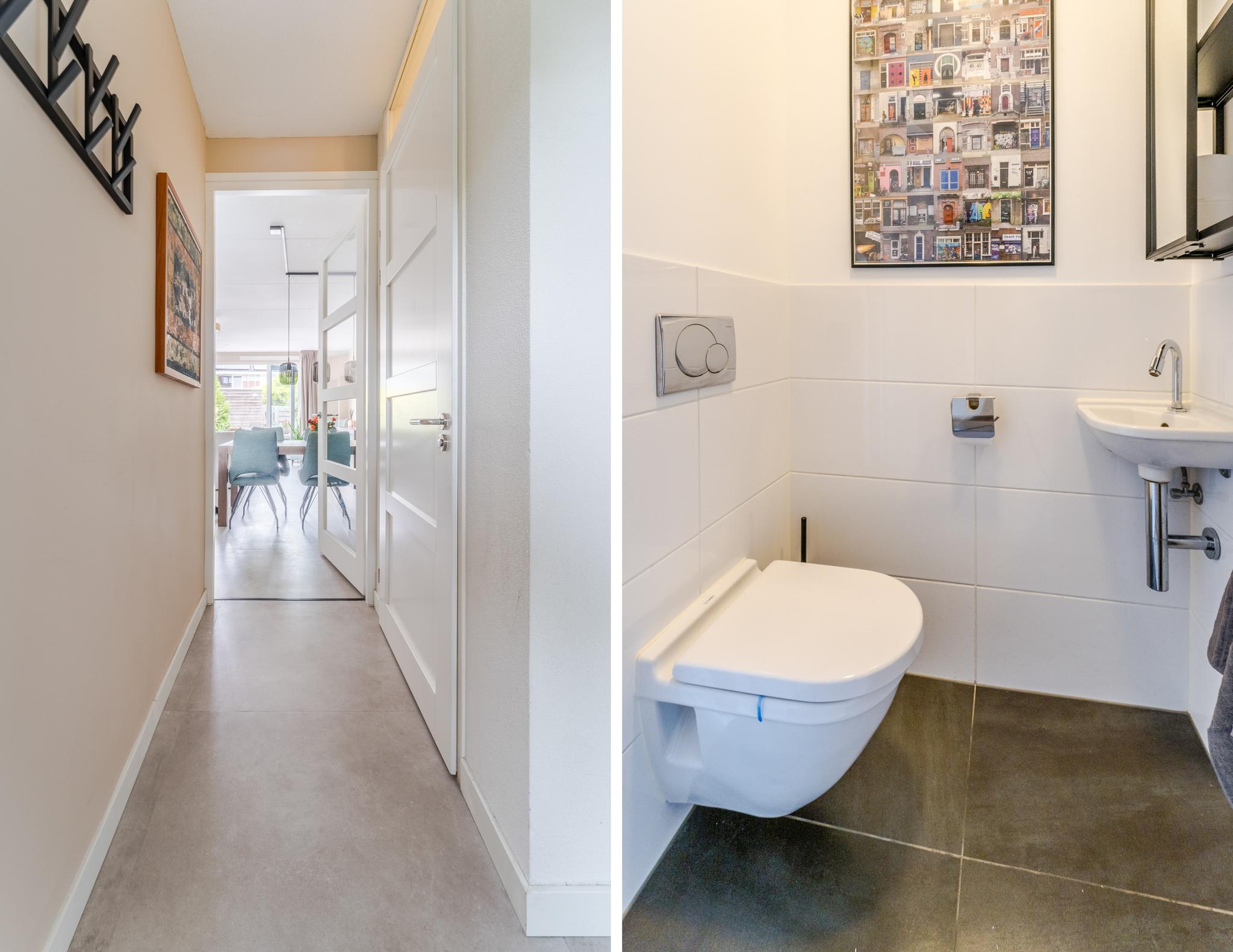 Bij binnenkomst word je verwelkomd in de prachtige en ruime entree, compleet met een handige garderobe, een overzichtelijke meterkast en een keurig afgewerkte toiletruimte voorzien van een fontein. Vanuit de hal betreed je de zeer royale en prachtig uitgebouwde living (ca. 41m2). Deze woonkamer is werkelijk een plaatje, badend in het zonlicht dankzij de grote, schitterende raampartijen en de mooie openslaande deuren naar de tuin. De trap naar de eerste etage bevindt zich ook in deze sfeervolle woonkamer, wat een speelse touch geeft aan de ruimte.