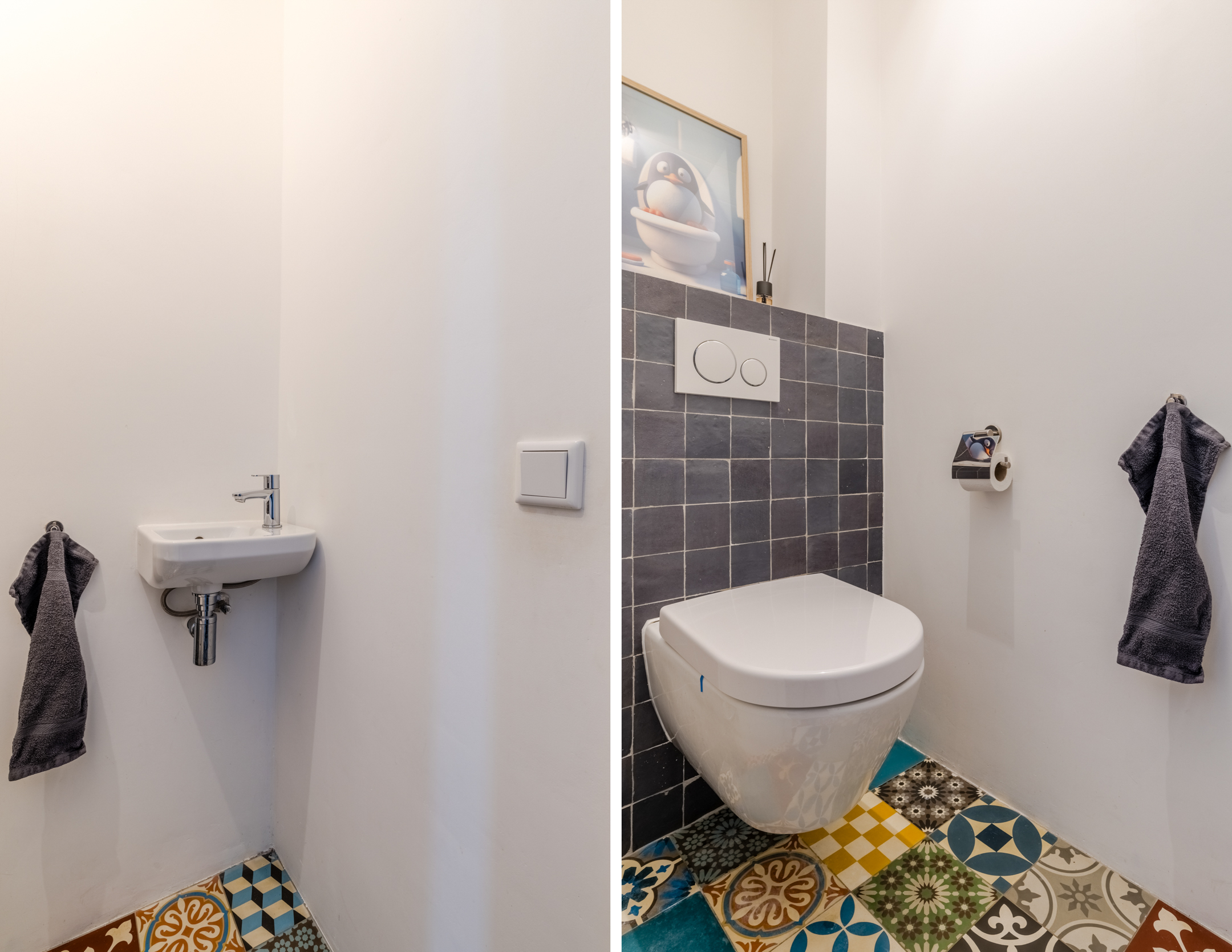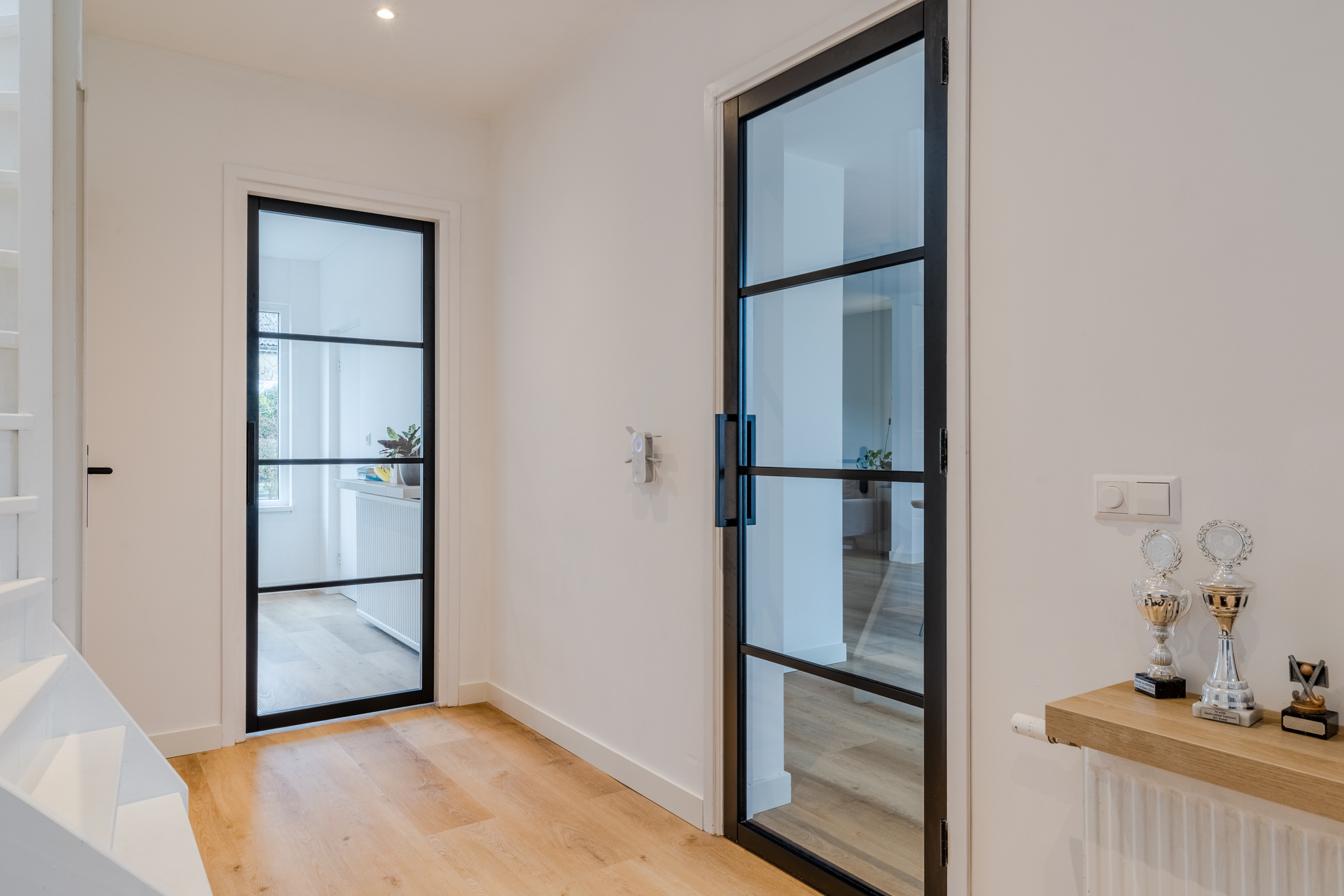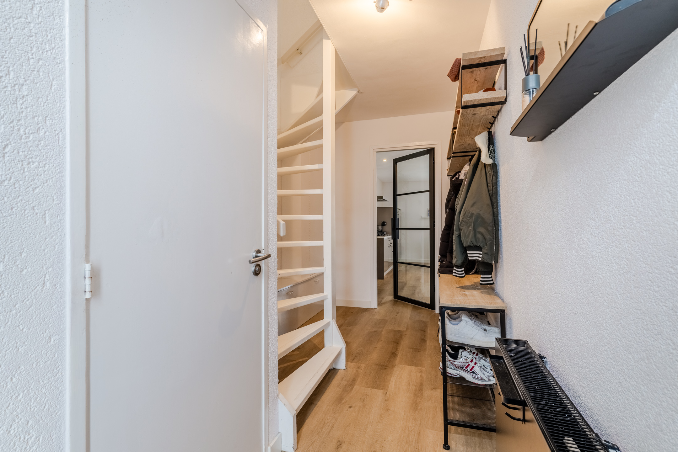 Entree, hal, meterkast, toiletruimte v.v. hangend toilet en fontein, trap naar de eerste verdieping, gave zwarte deur naar de keuken en woonkamer.