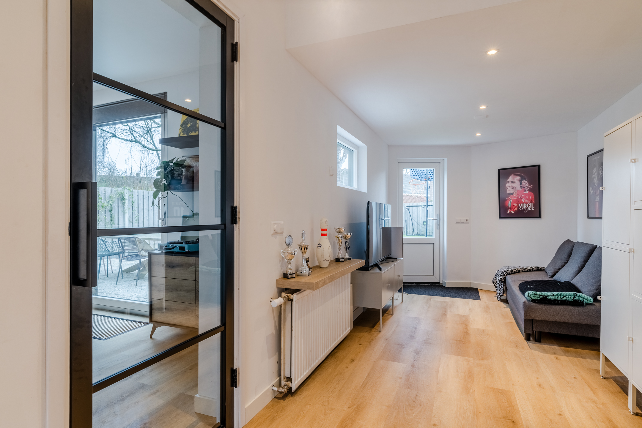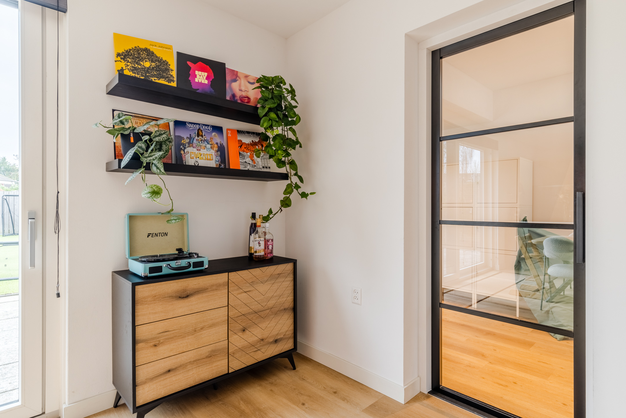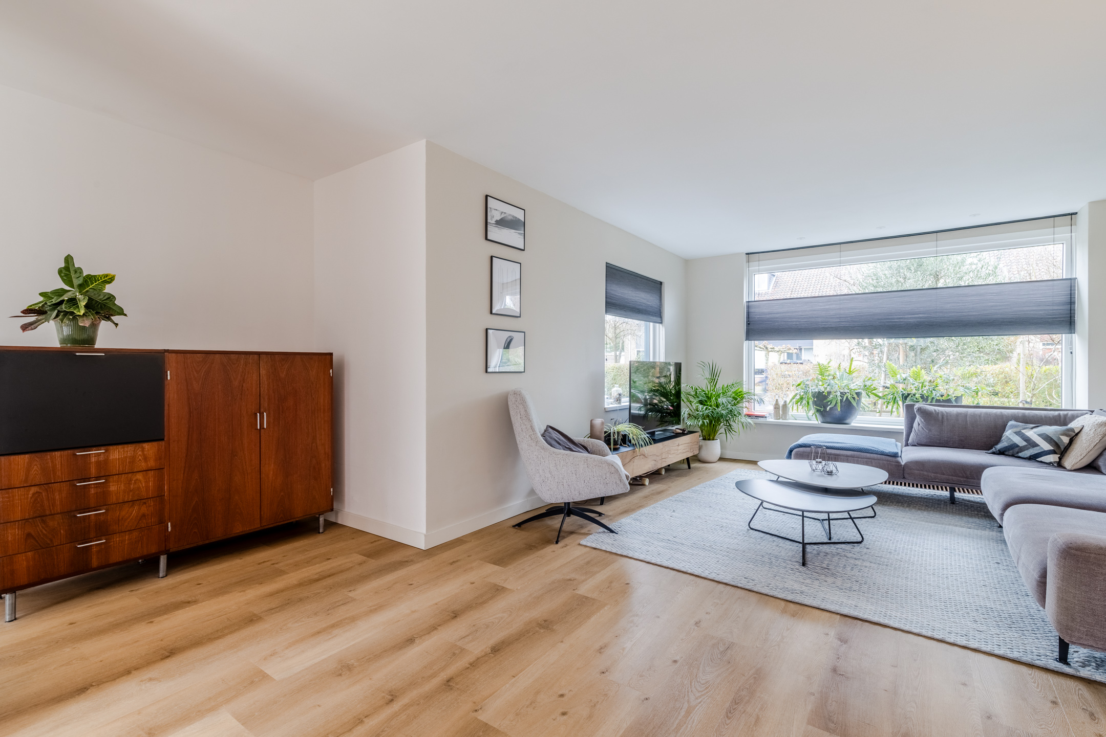 Wanneer je de ruimte betreedt word je overvallen door het gevoel van ruimte (groot, strak, licht!) dankzij de grote uitbouw, het strakke afwerkingsniveau alsmede de grote raampartijen in de voor- en achtergevel. Aan de voorzijde van de woning bevindt zich een heerlijke zitplek met uitzicht op de voortuin en de omgeving.