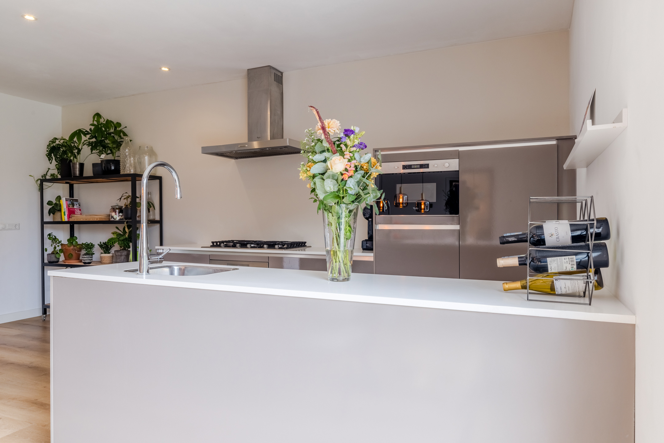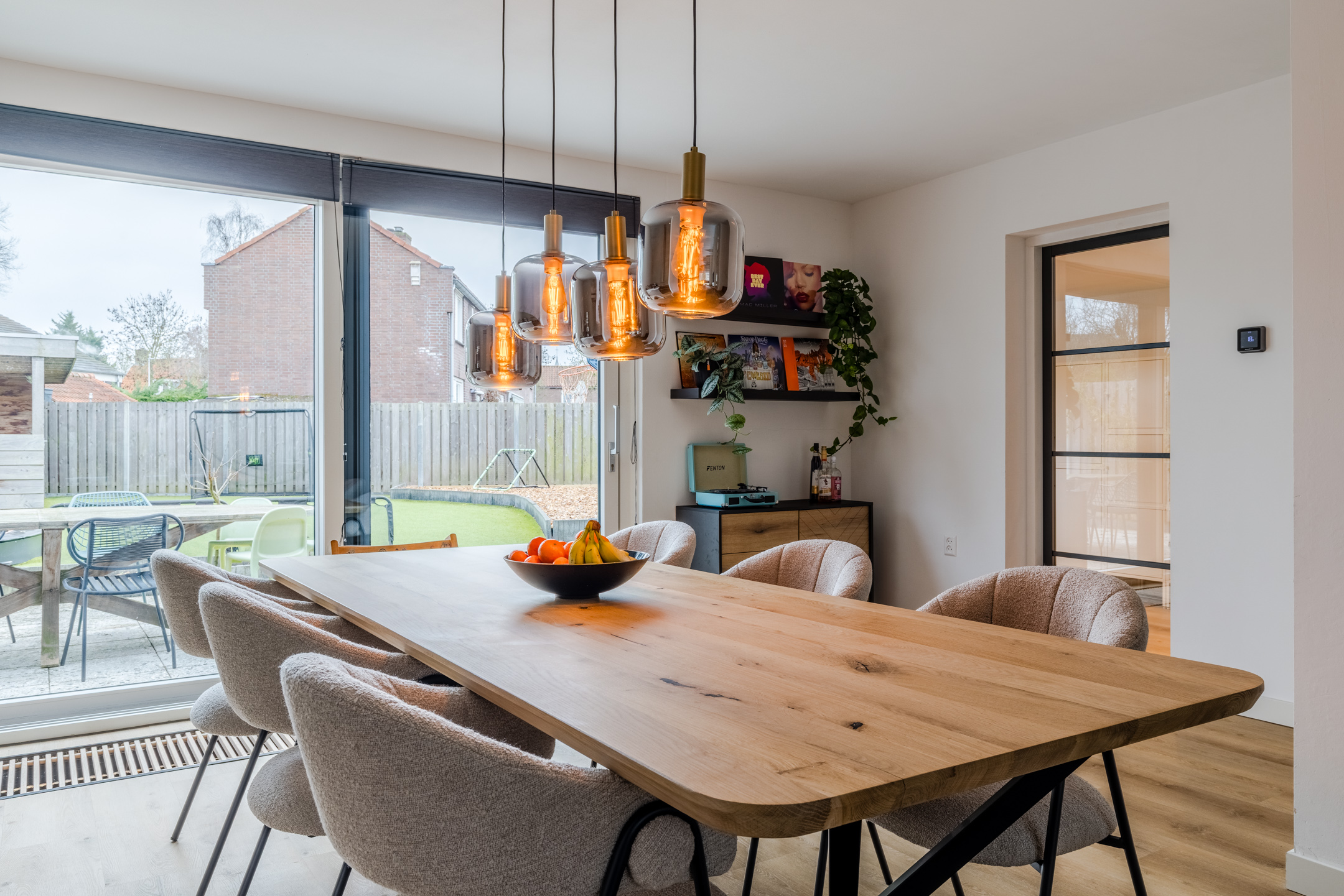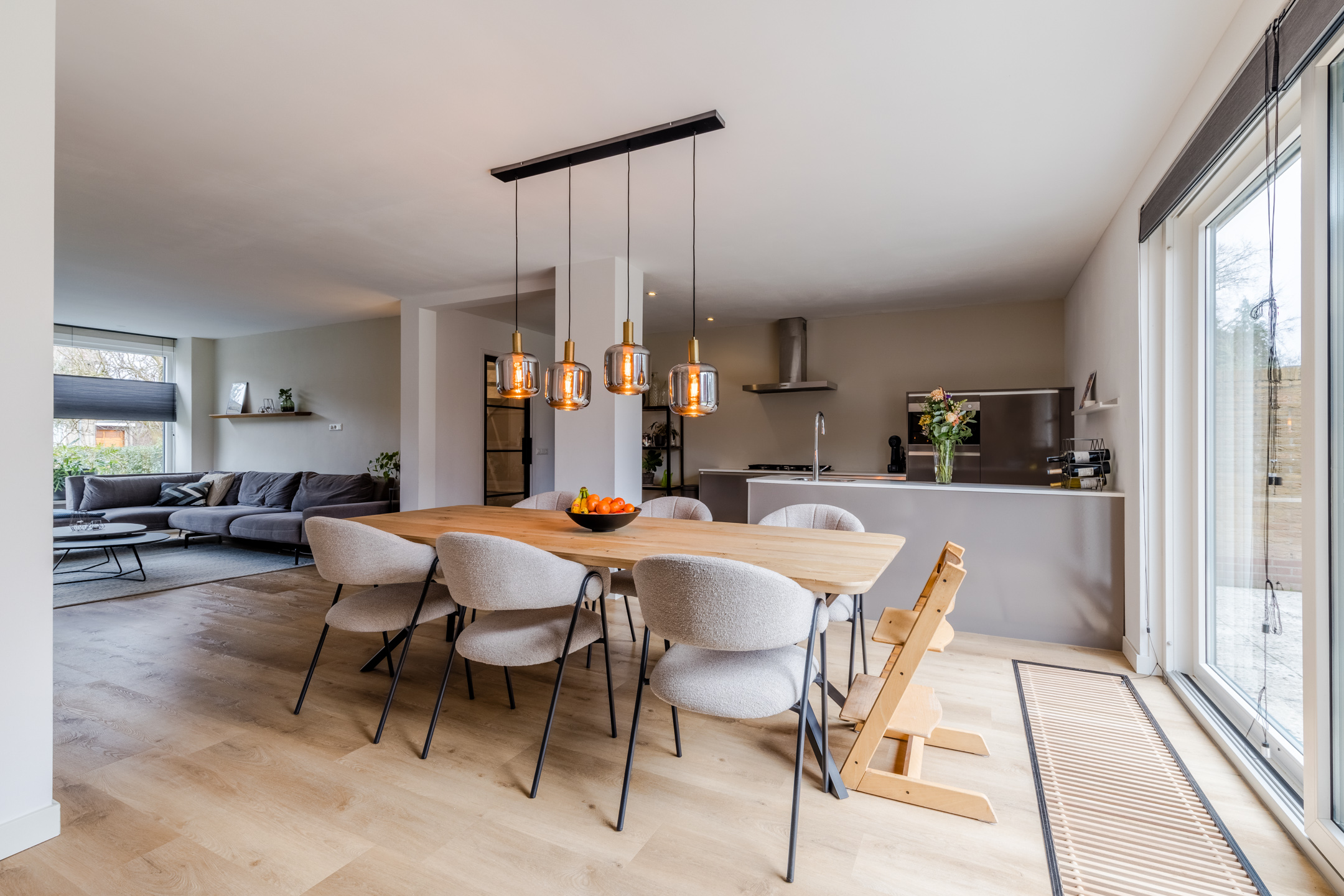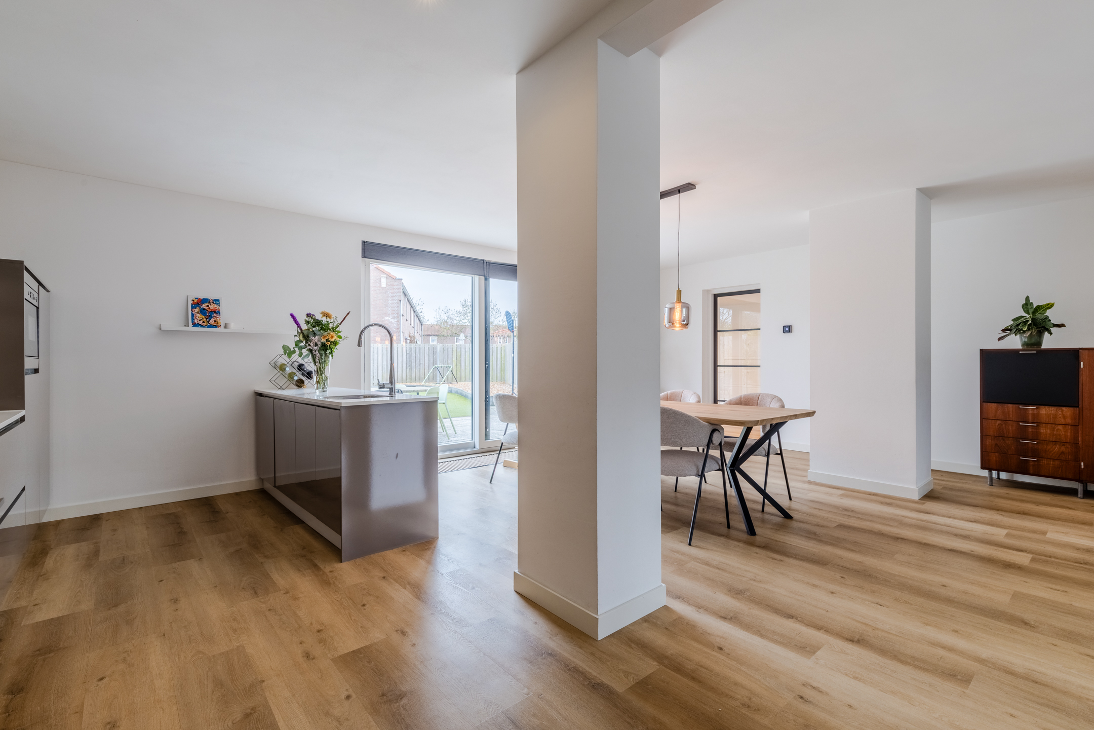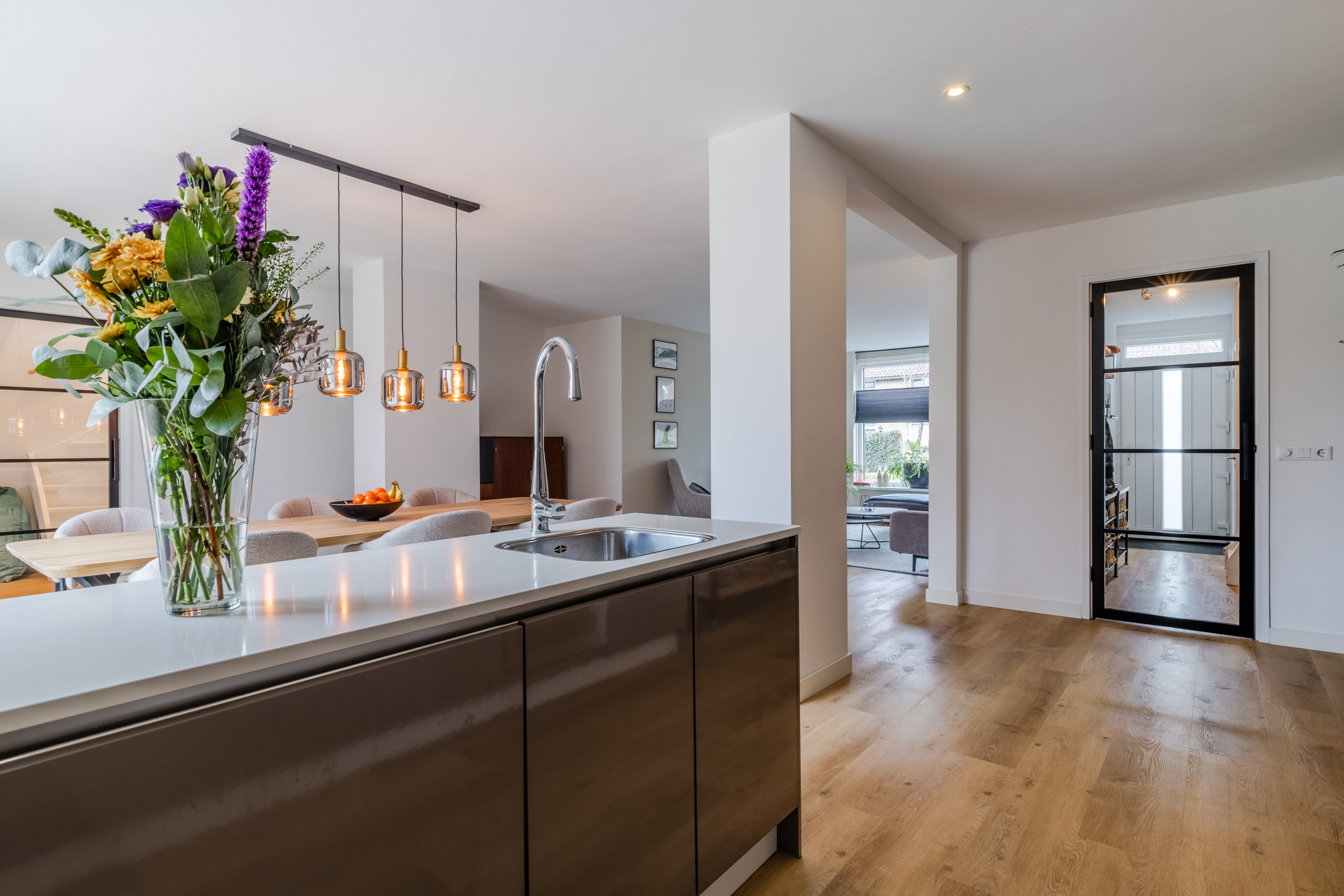 Aan de achterzijde vind je de grote uitgebouwde tuingerichte keuken-/ eetruimte (ca. 40 m2) voorzien van een schuifpui naar de tuin.