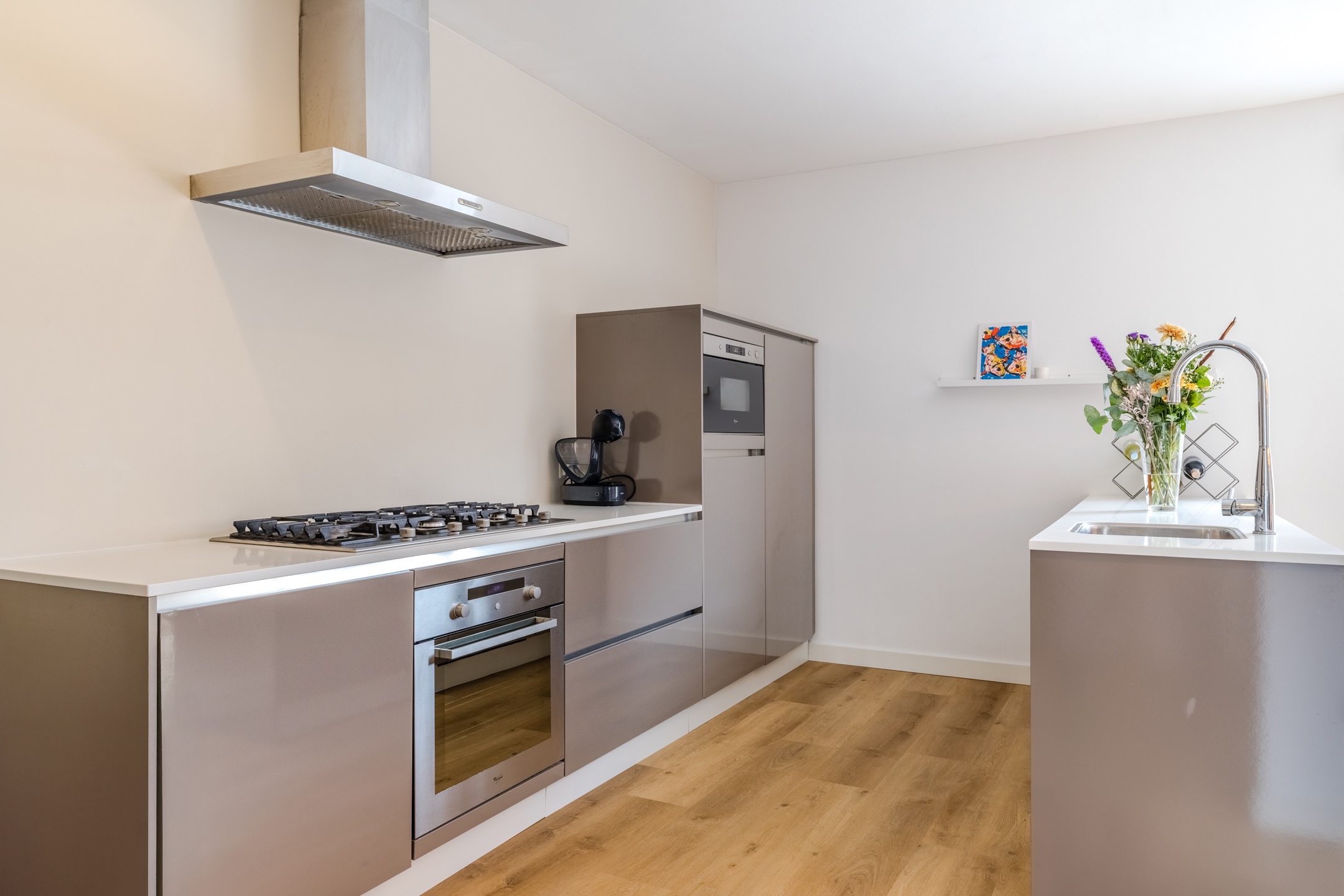 De moderne keuken is geplaatst in een wandopstelling met spoel-/ schiereiland en uitgevoerd in een neutrale grijs-/ bruine kleurstelling met een licht composiet werkblad. De keuken beschikt over alle wenselijke inbouwapparatuur, zoals een 5- pits gasfornuis, een oven, een magnetron, een vaatwasser, een koelkast, een vriezer en een rvs- afzuigkap.