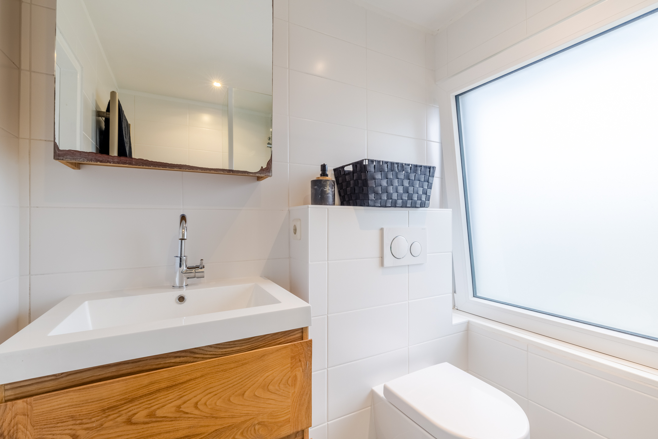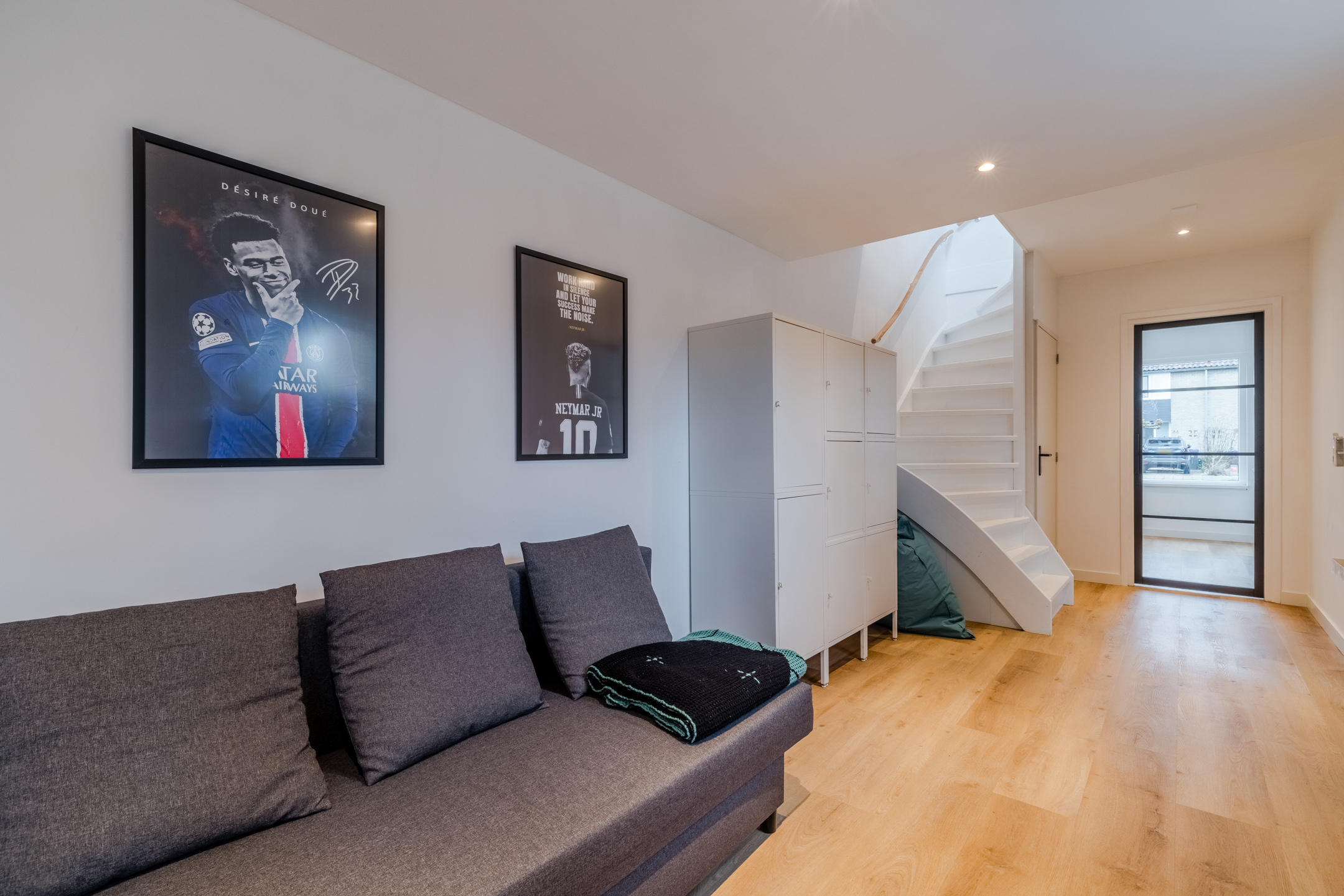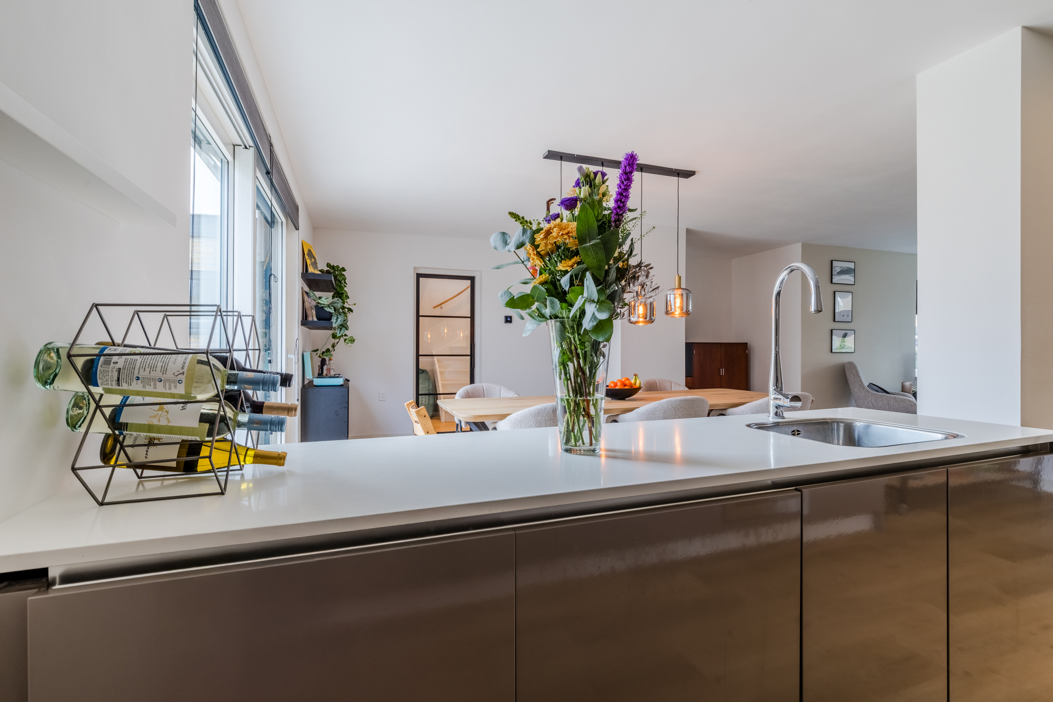 Deze gehele woonlaag is voorzien van een neutrale laminaatvloer en een strakke wand-/ en plafondafwerking.