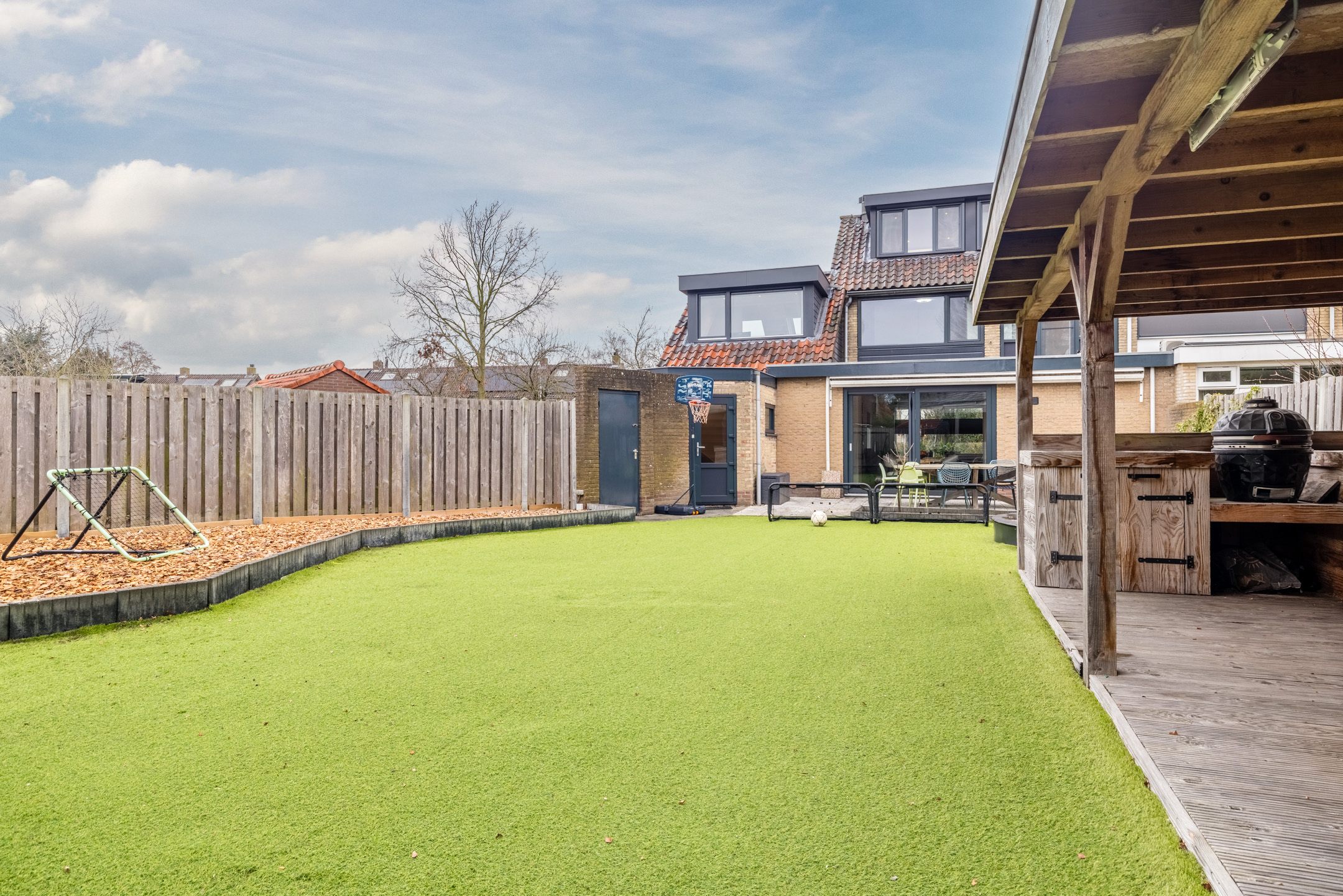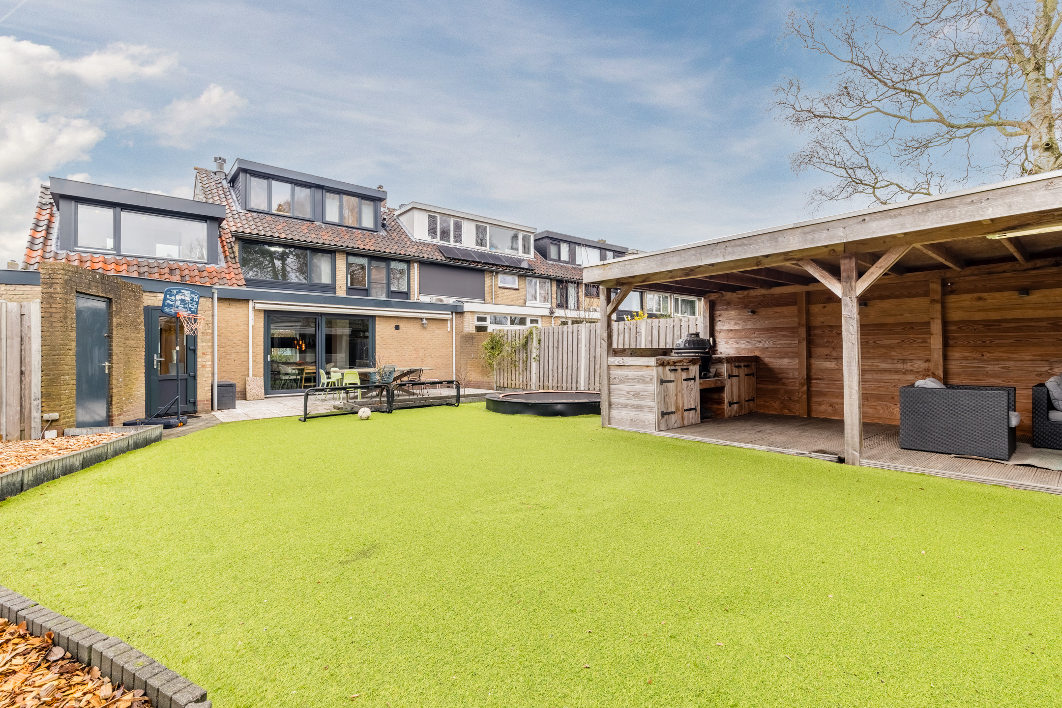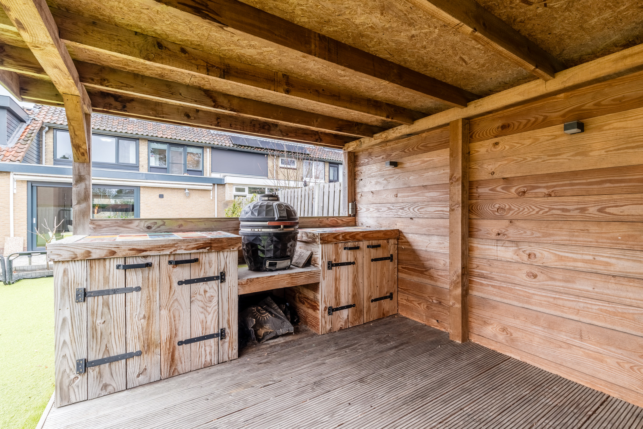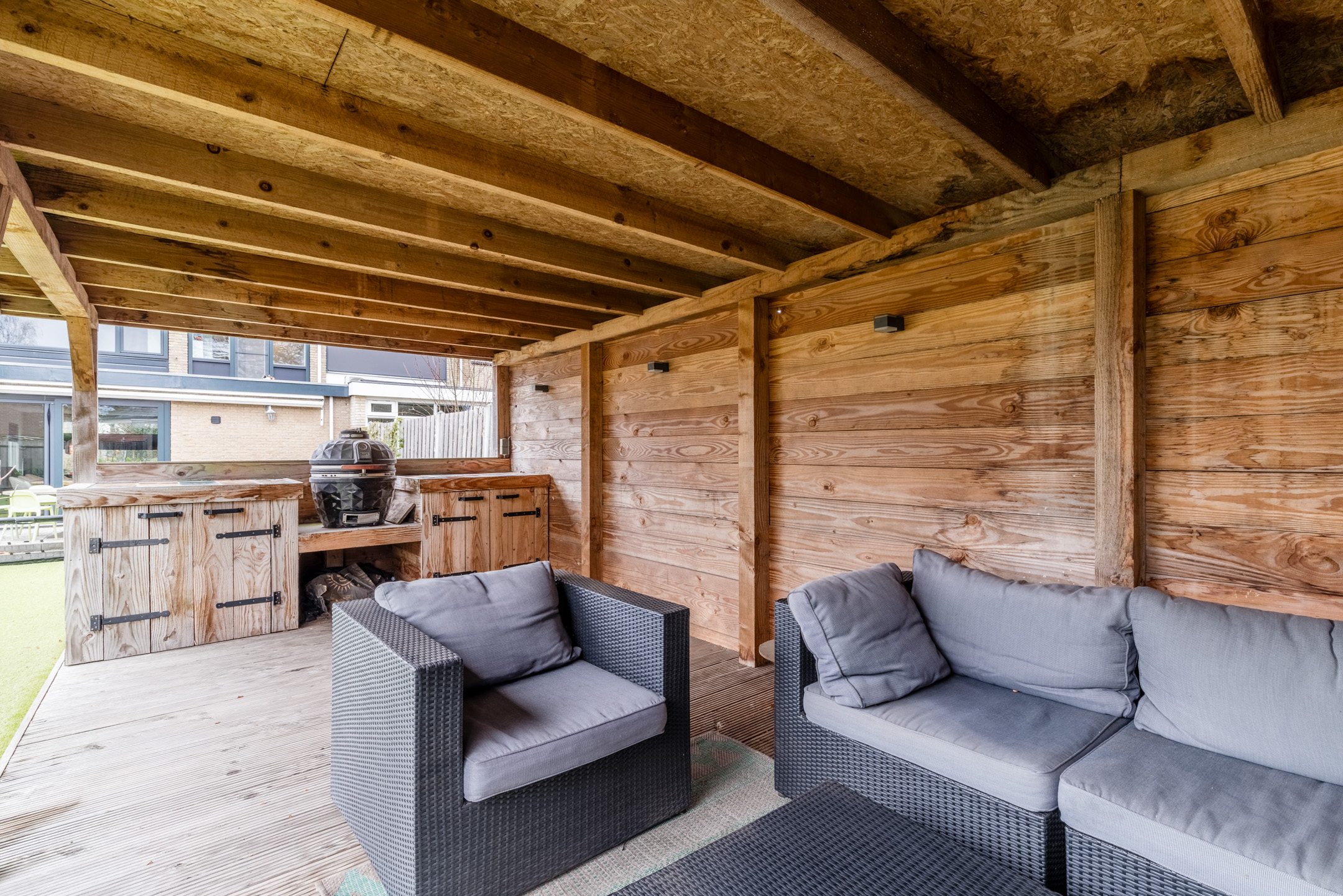 De achtertuin beschikt over een ruim terras, een groot kunstgrasgazon, diverse borders én een waanzinnige veranda. In de veranda bevindt zich momenteel de buitenkeuken. Een sfeervolle plek om in de zomer te genieten van een heerlijke BBQ-maaltijd met familie en/of vrienden.