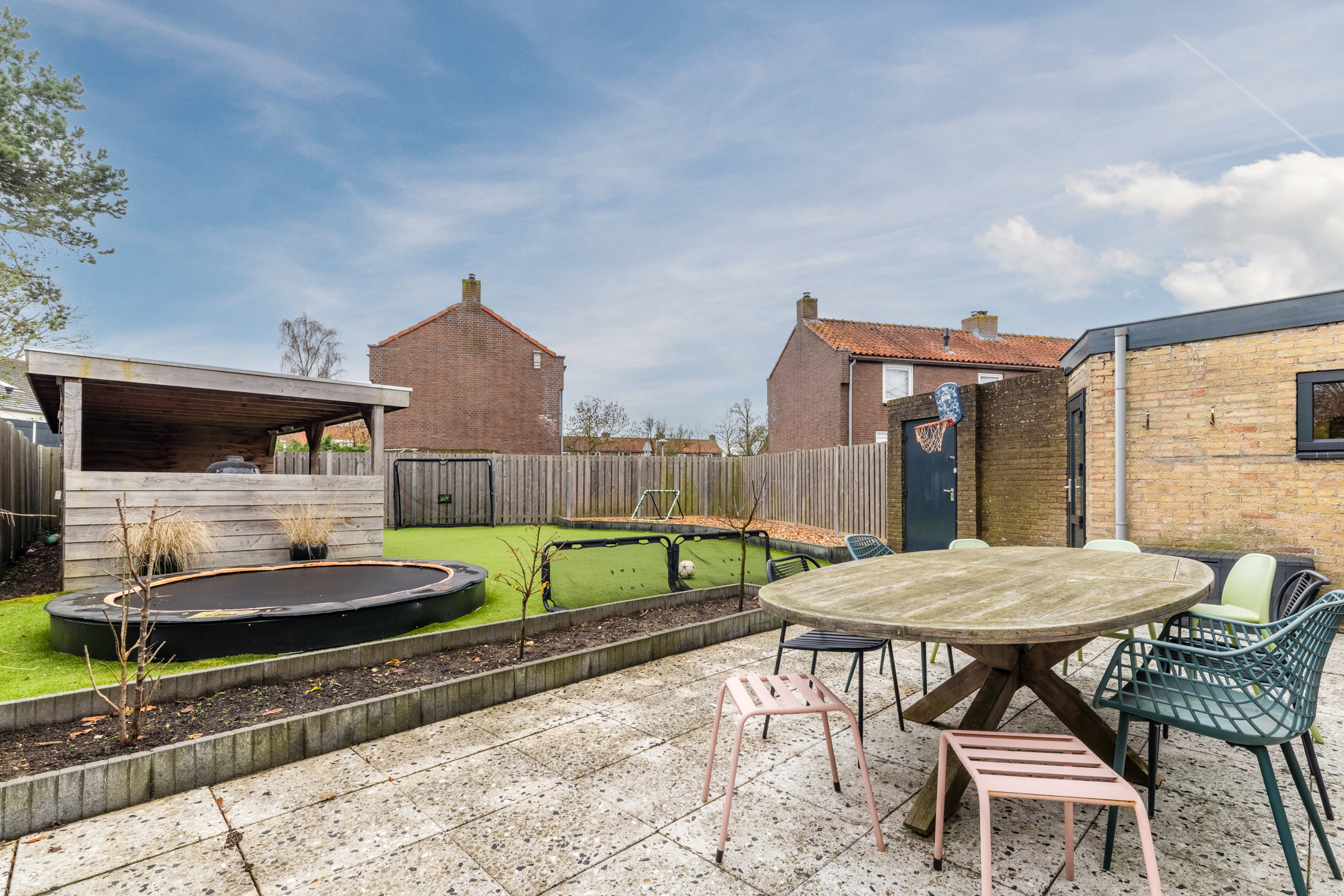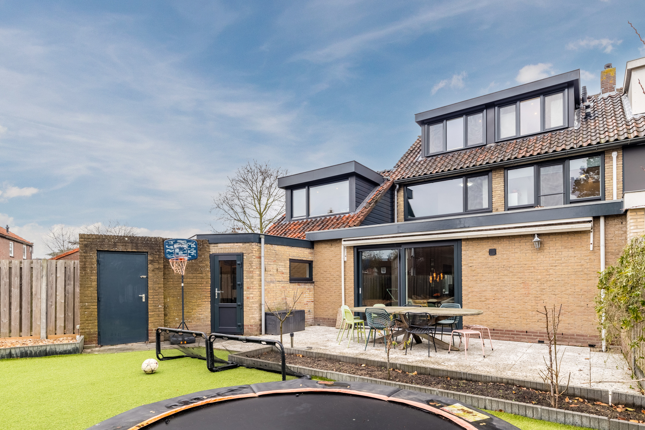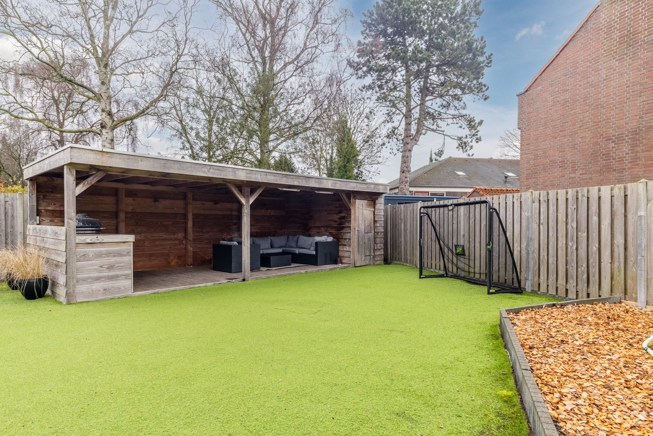 De achtertuin beschikt over een ruim terras, een groot kunstgrasgazon, diverse borders én een waanzinnige veranda. In de veranda bevindt zich momenteel de buitenkeuken. Een sfeervolle plek om in de zomer te genieten van een heerlijke BBQ-maaltijd met familie en/of vrienden.