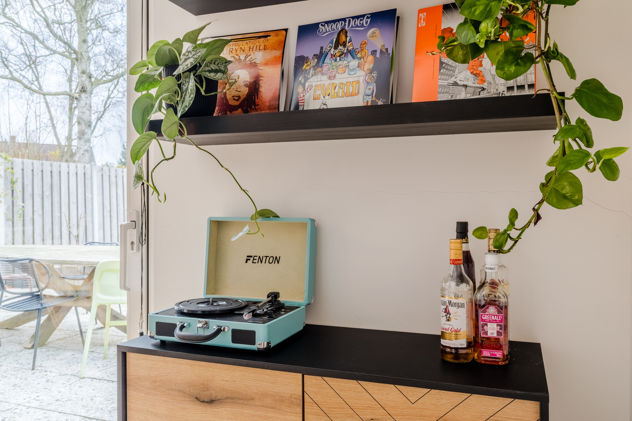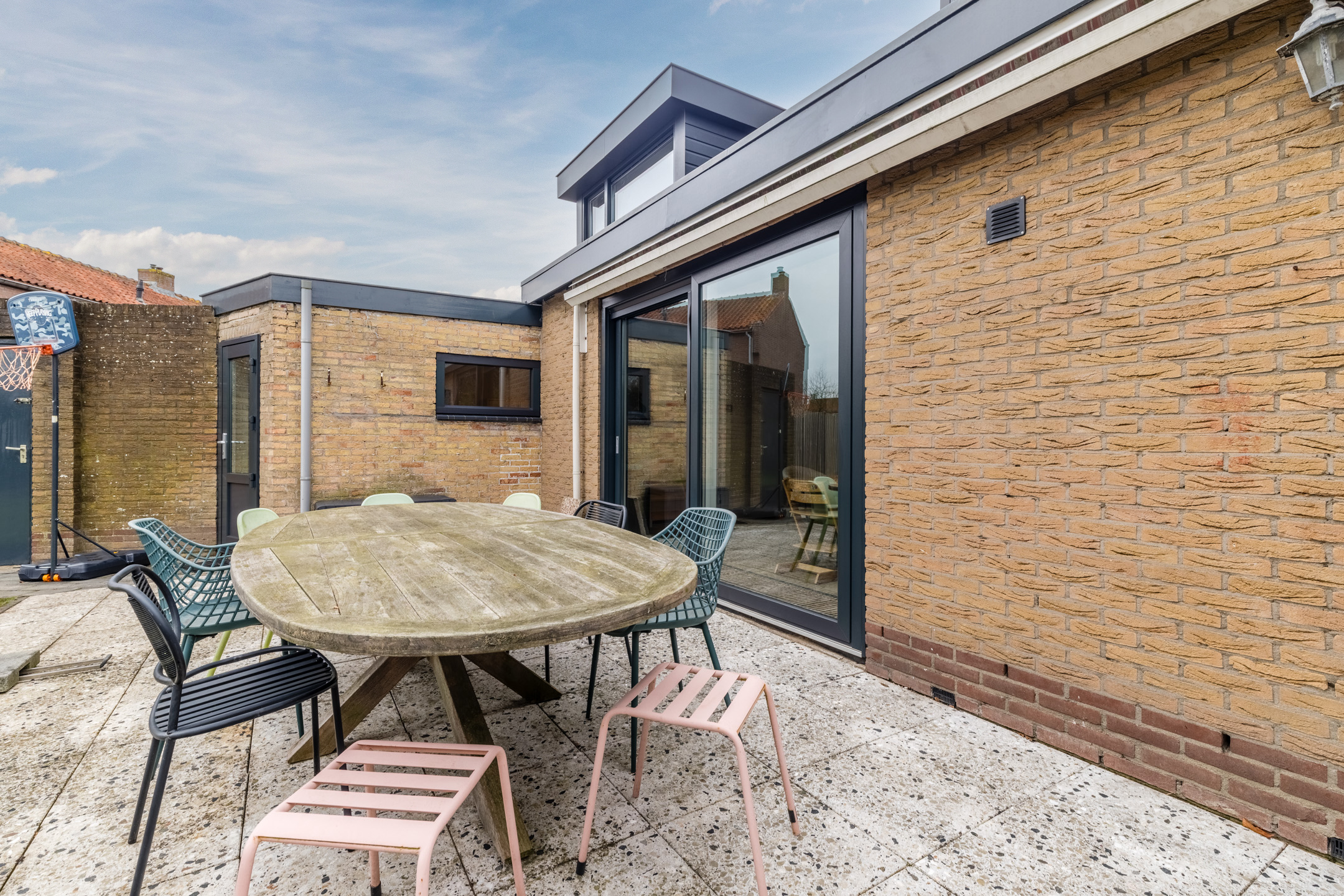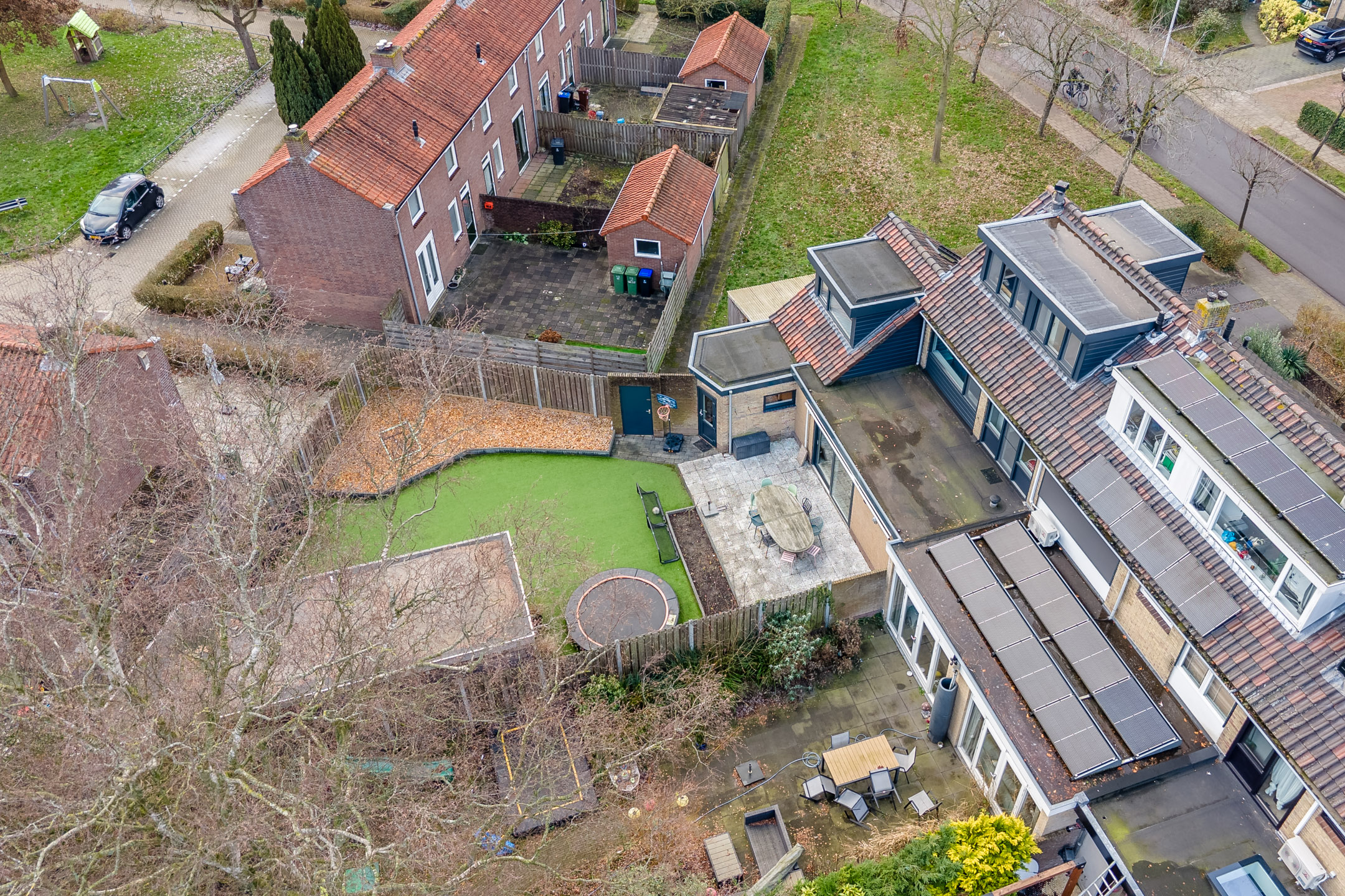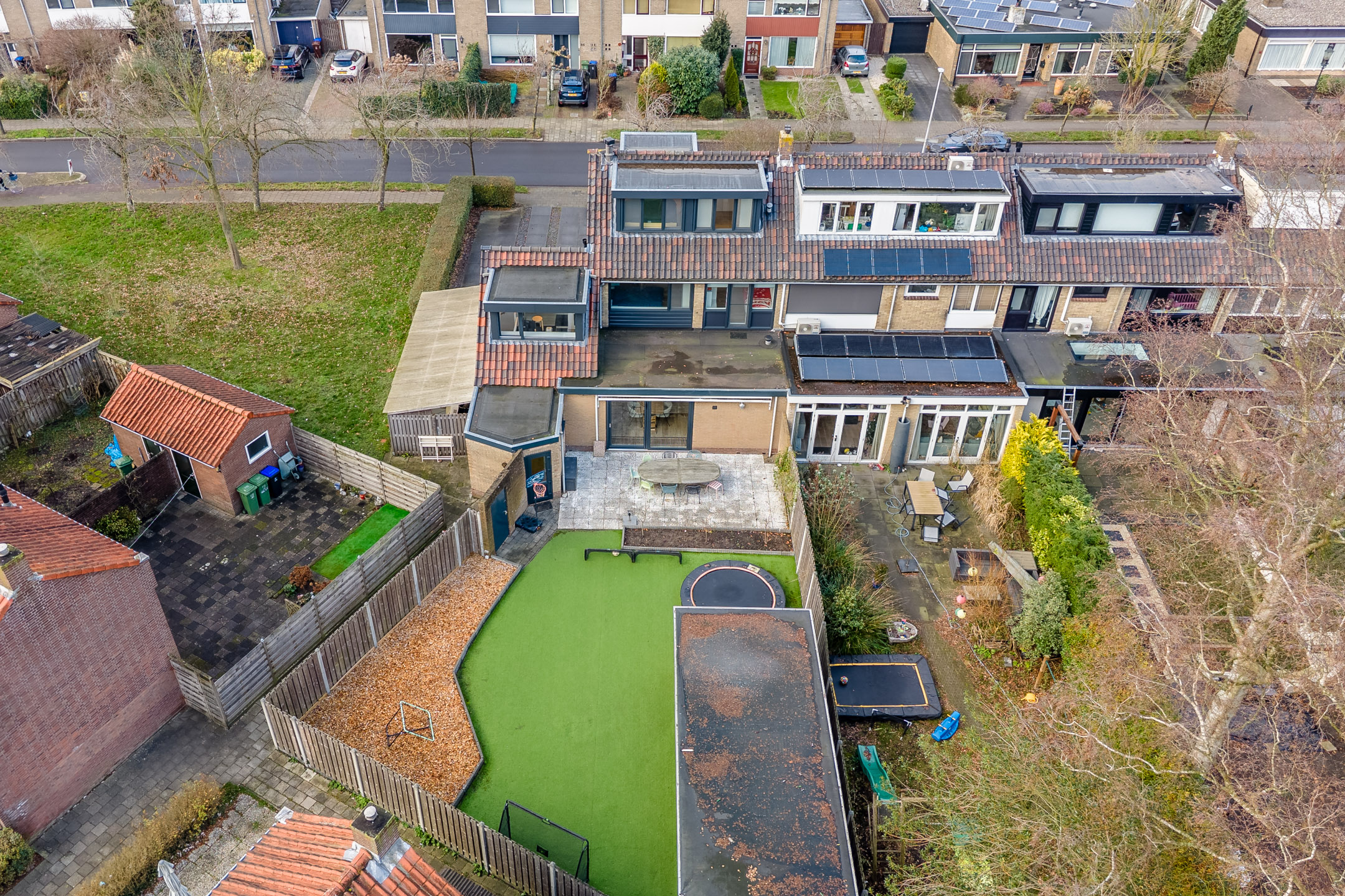 De achtertuin beschikt over een ruim terras, een groot kunstgrasgazon, diverse borders én een waanzinnige veranda. In de veranda bevindt zich momenteel de buitenkeuken. Een sfeervolle plek om in de zomer te genieten van een heerlijke BBQ-maaltijd met familie en/of vrienden.