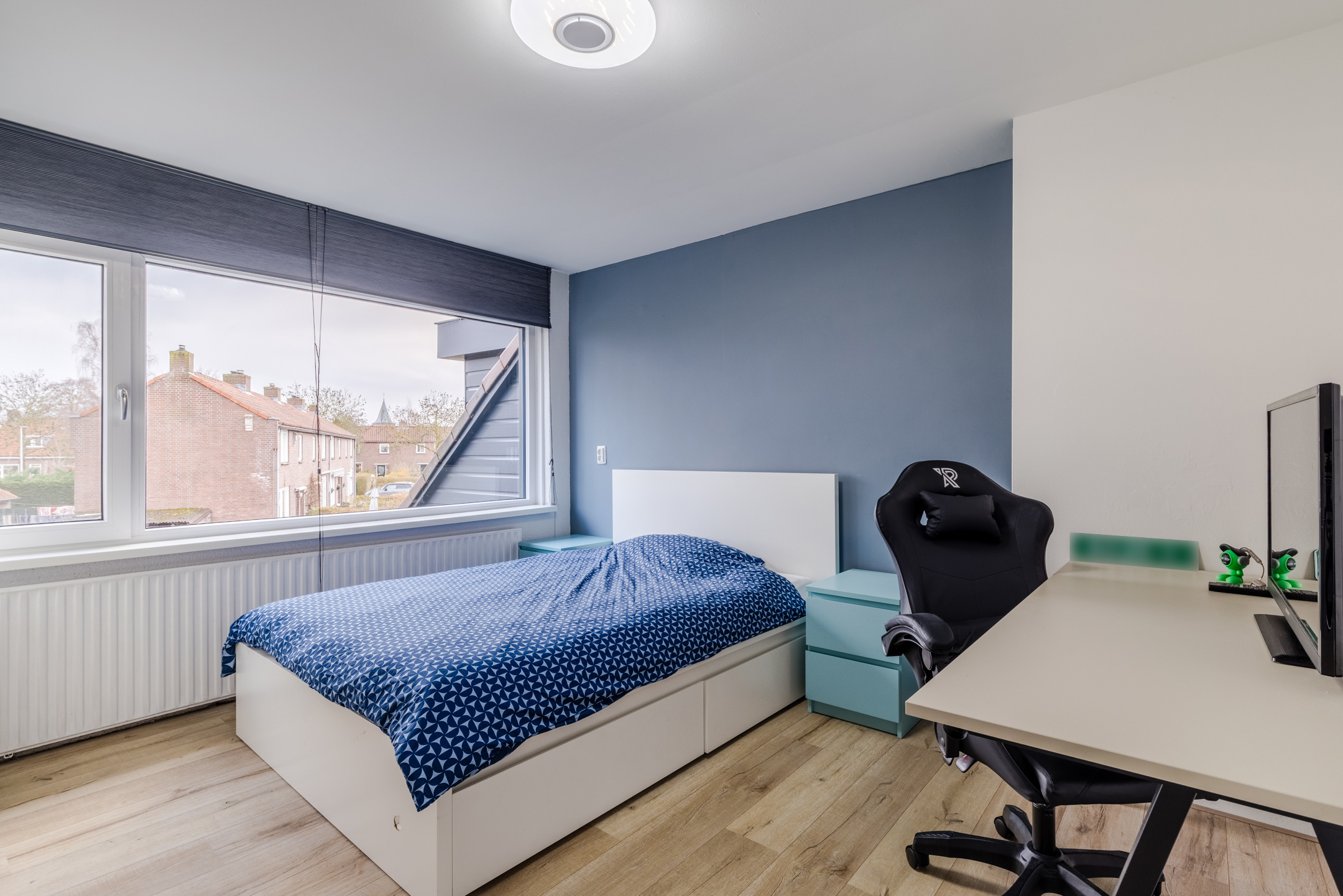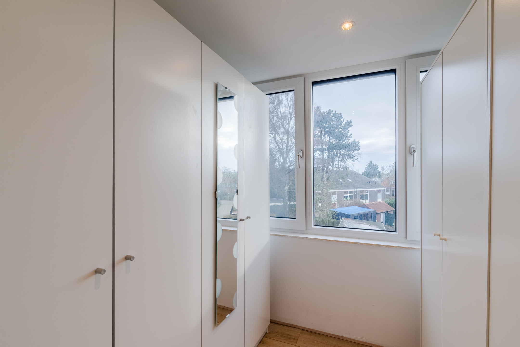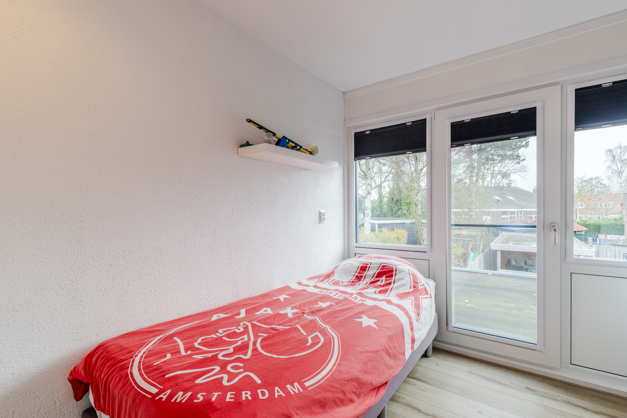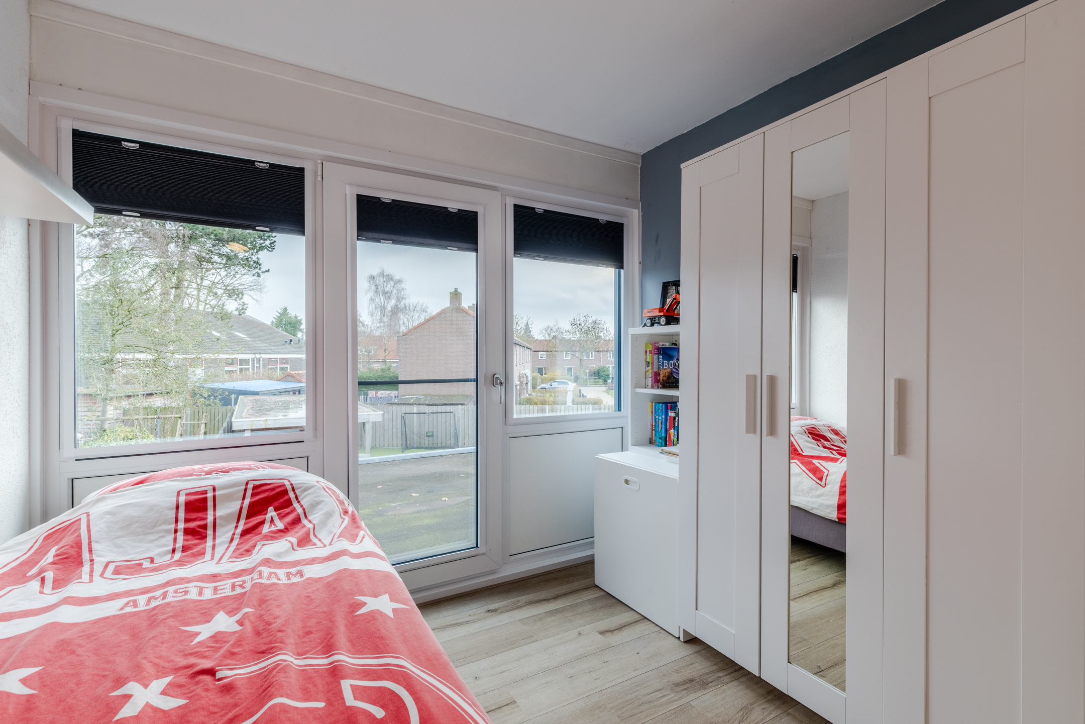 Aan de achterzijde tref je eveneens twee volwaardige en multifunctionele (slaap)kamers (ca. 8 & 13 m2). De kleinere slaapkamer is voorzien van een deur die toegang biedt tot het dak van de uitbouw. De grote slaapkamer beschikt over een mooie, grote raampartij met een draai-/ kiepraam. Beide slaapkamers beschikken over horren en kijken uit op de gezellige achtertuin.