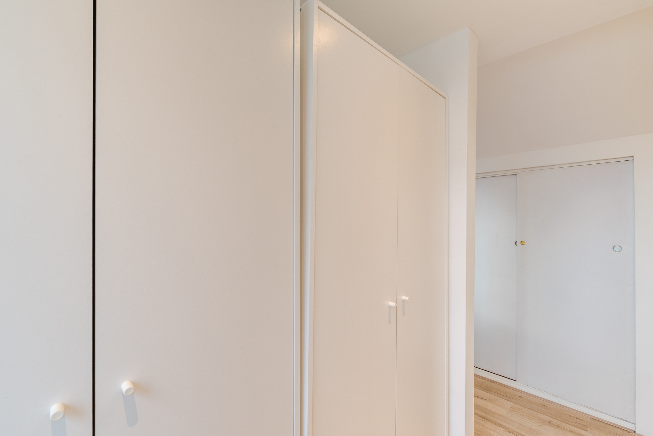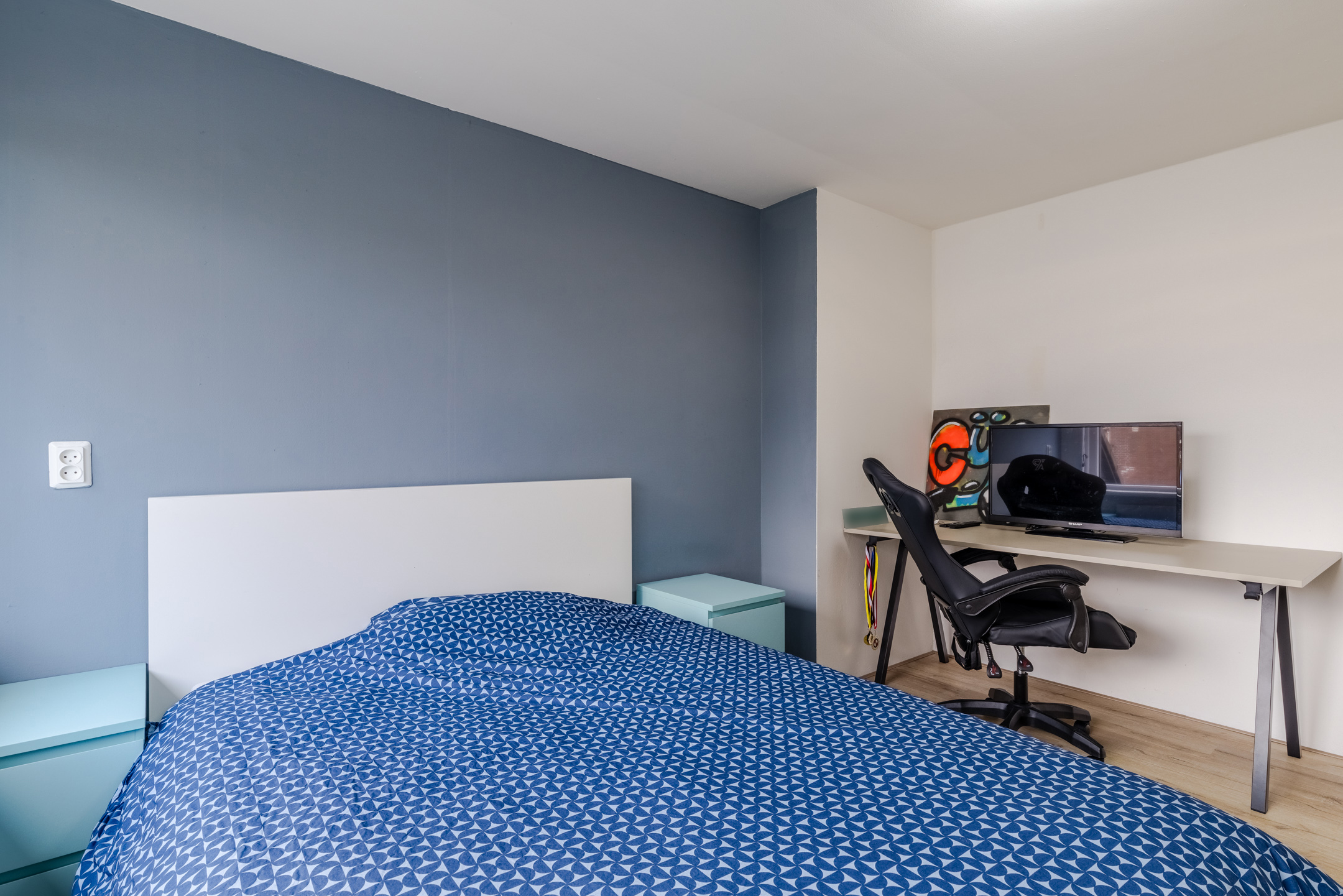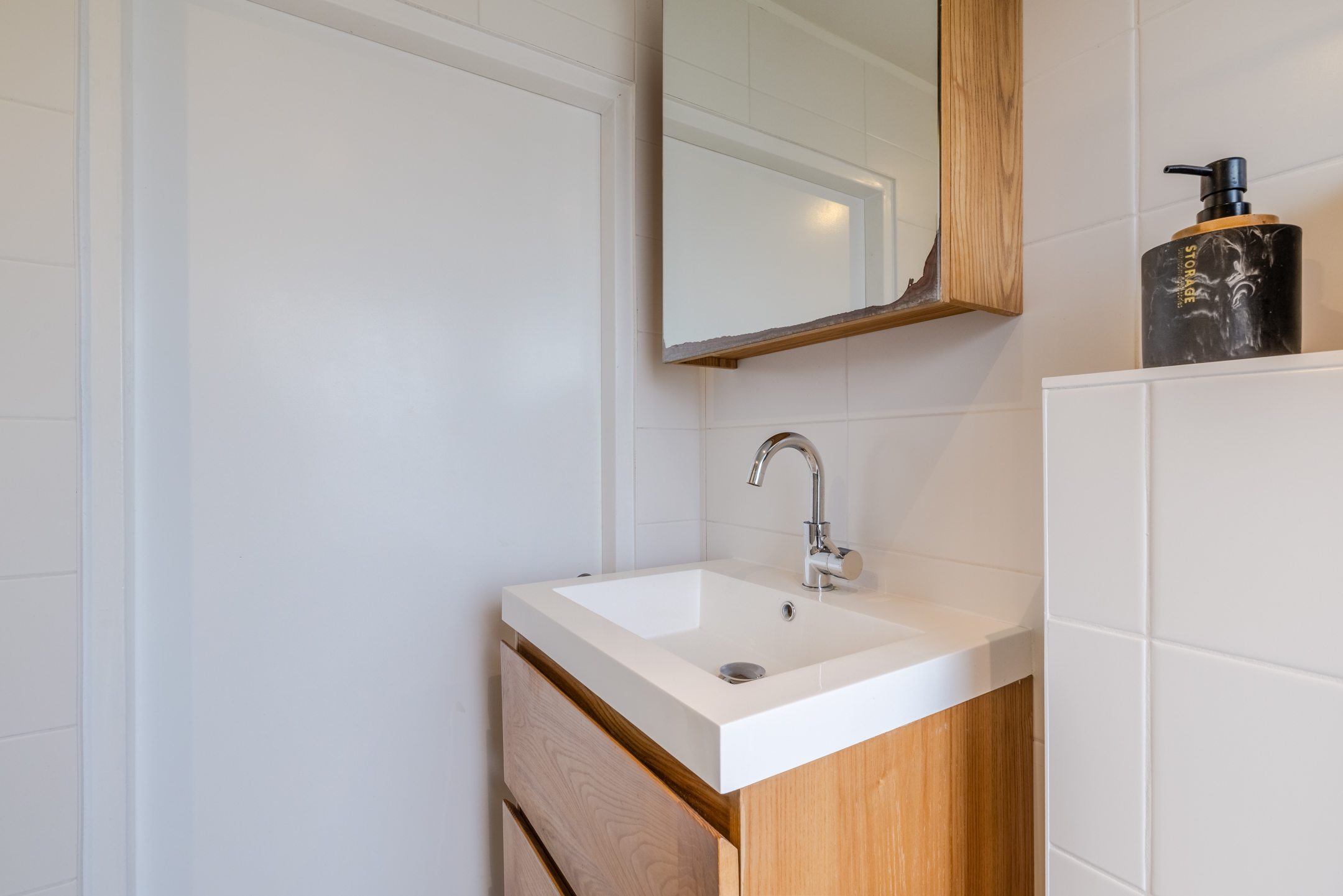 Aan de voorzijde zijn één slaapkamer en de badkamer gesitueerd. De slaapkamer is van een goed formaat (ca. 11 m2) en kijkt, middels een grote raampartij v.v. een hor, uit op de straat en de directe omgeving. De badkamer is uitgevoerd in een neutrale wit-/ grijze kleurstelling met houtlook accenten en beschikt over een inloopdouche met regendouche en handsproeier. Tevens bevinden zich in de badkamer een tweede hangend toilet en een wastafelmeubel met lades en spiegelkast.