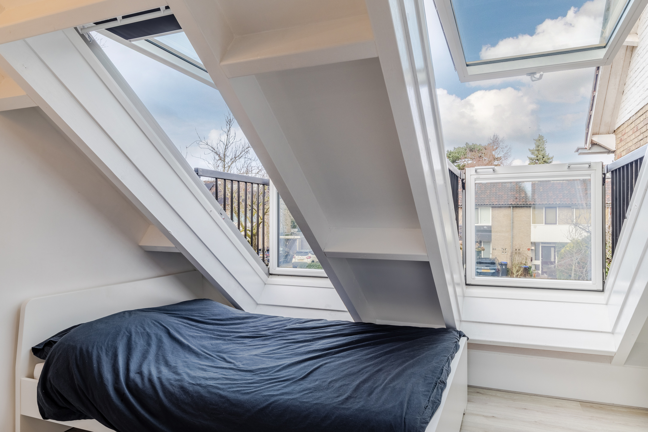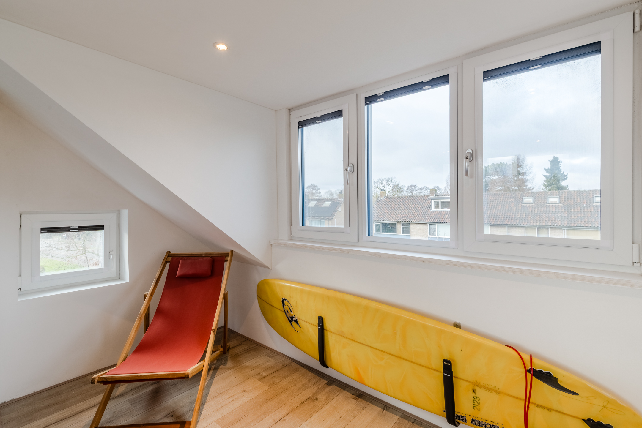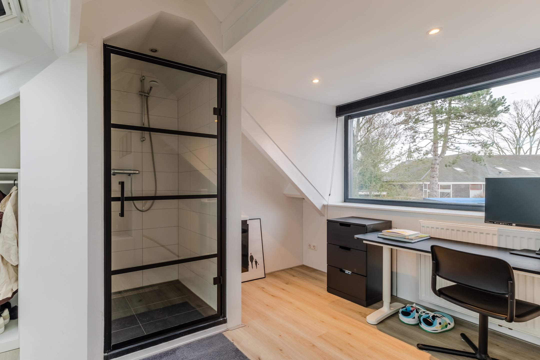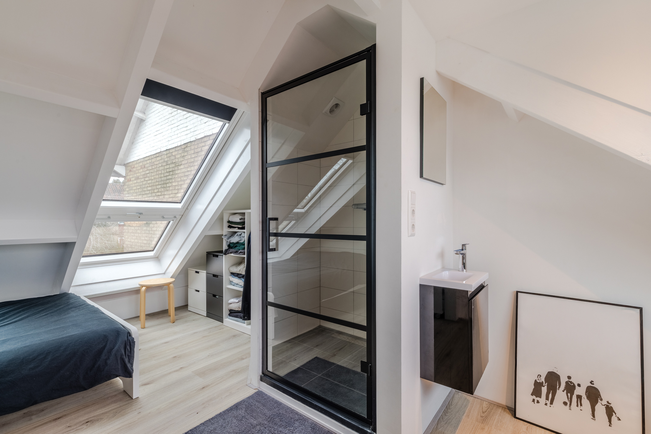 Via de ruimte aan de achterzijde van de woning bereik je, middels een vaste trap v.v. praktische trapkast, de multifunctionele (slaap)kamer op de uitbouw. Deze slaapkamer (ca. 17 m2) is praktisch ingedeeld en voorzien van grote dakramen die kunnen worden uitgeklapt tot een Frans balkon. Prachtig! Tevens beschikt deze slaapkamer over een eigen doucheruimte. Een ideale ruimte voor bijvoorbeeld tieners!