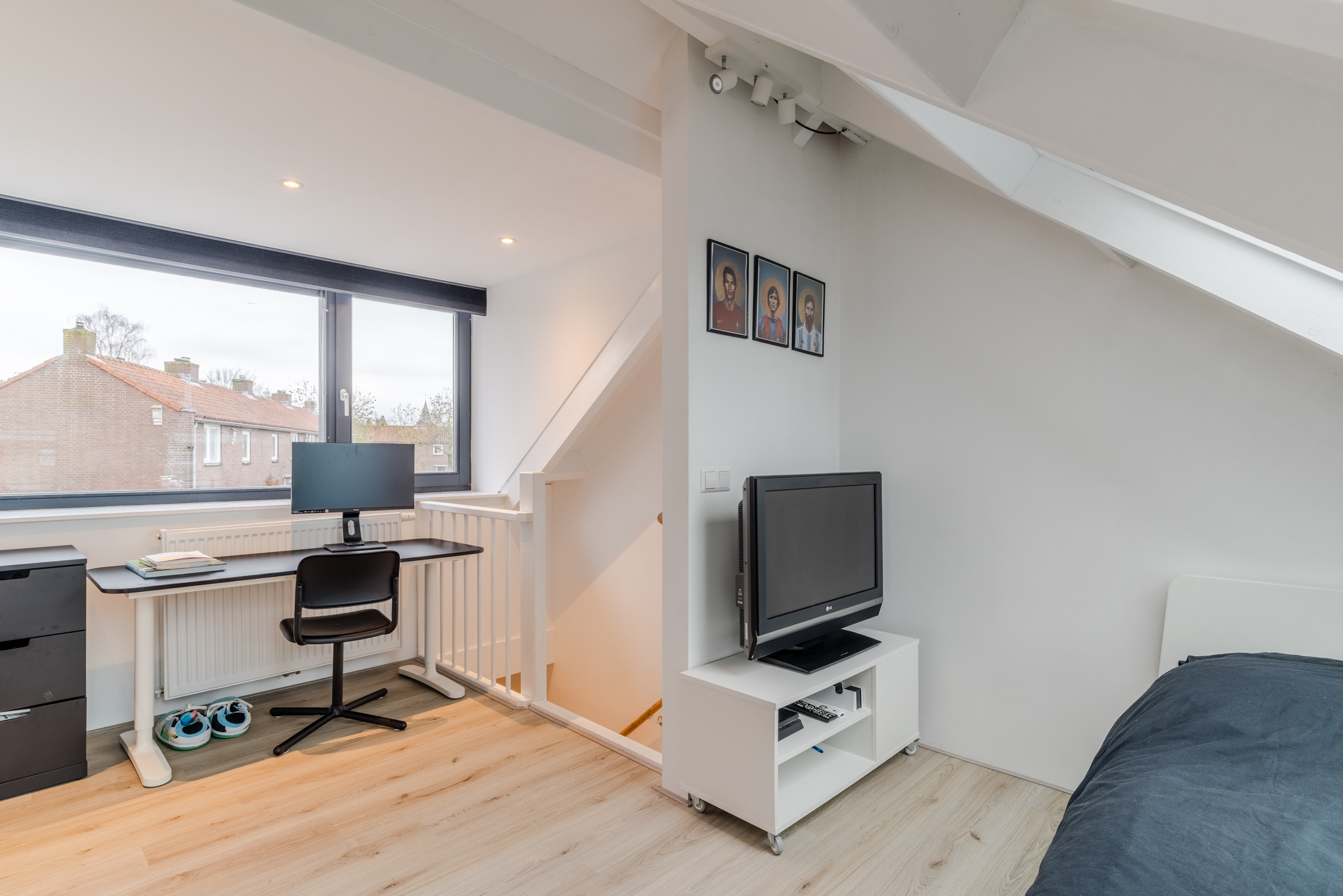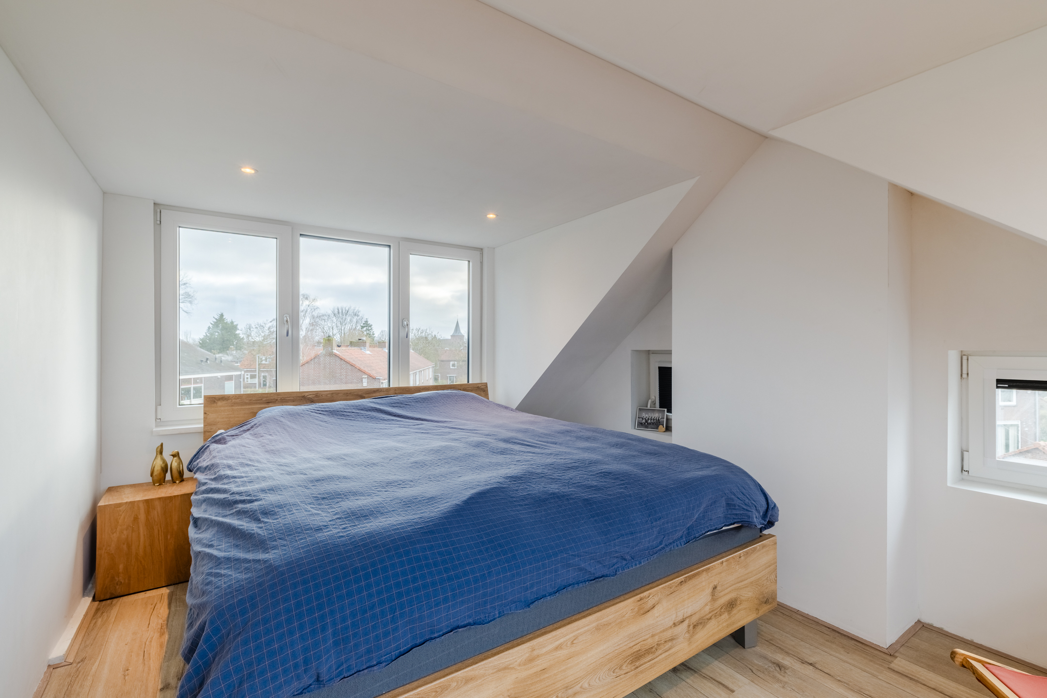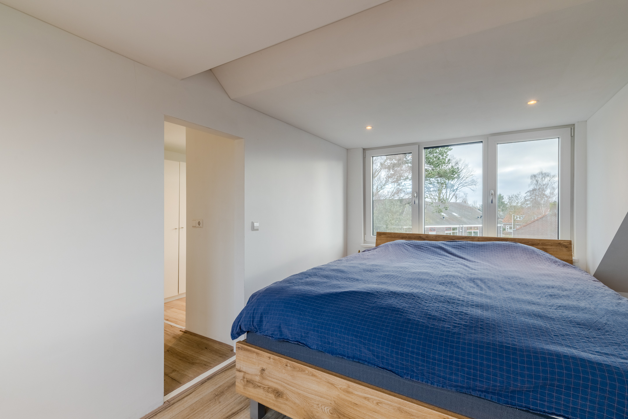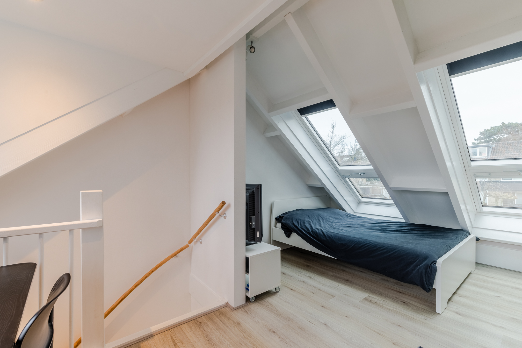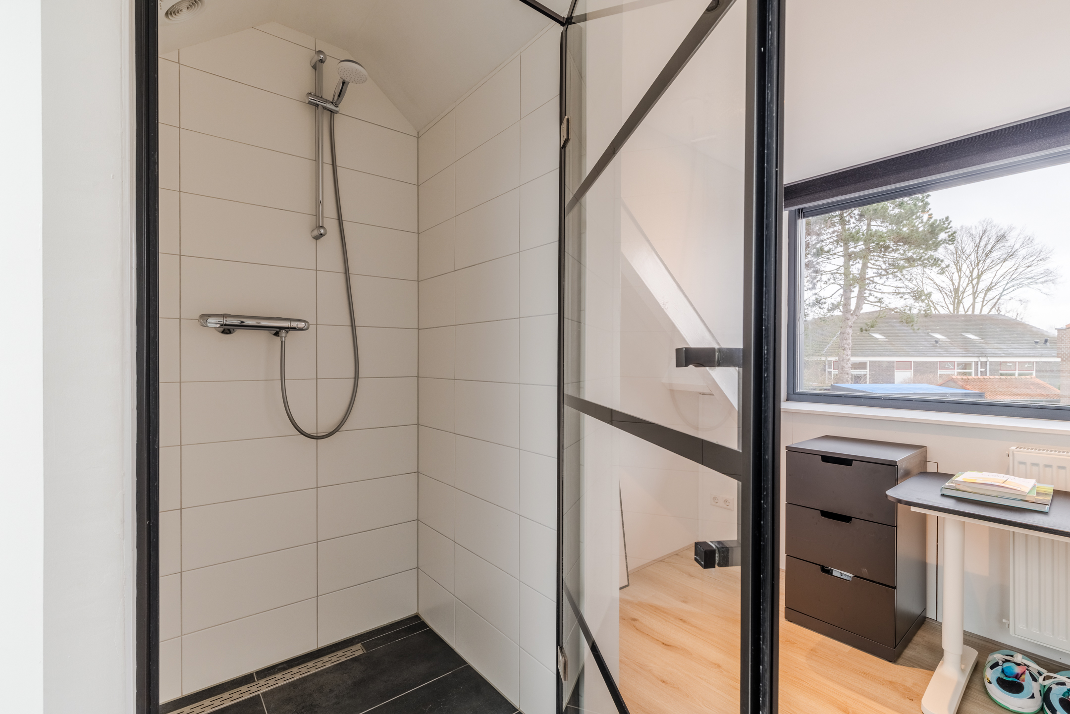 Via de ruimte aan de achterzijde van de woning bereik je, middels een vaste trap v.v. praktische trapkast, de multifunctionele (slaap)kamer op de uitbouw. Deze slaapkamer (ca. 17 m2) is praktisch ingedeeld en voorzien van grote dakramen die kunnen worden uitgeklapt tot een Frans balkon. Prachtig! Tevens beschikt deze slaapkamer over een eigen doucheruimte. Een ideale ruimte voor bijvoorbeeld tieners!