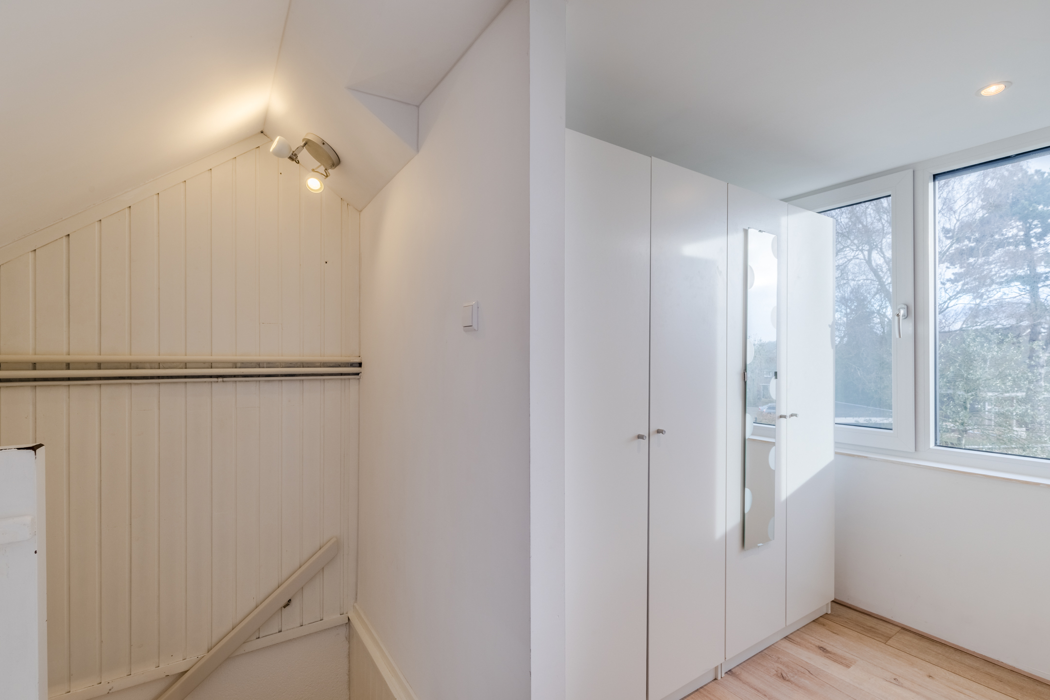 Ruime en lichte overloop. Aan de rechterkant bevindt zich een grote berging, die middels schuifdeuren is afgesloten. Hier kun je alle zaken kwijt die je niet dagelijks nodigt hebt. Aan de linkerzijde van de overloop, nu deels in gebruik als kledingkamer, bevindt zich eveneens de opstelplaats voor de CV- installatie, keurig weggewerkt in een kast. Deze ruimte zou ook prima dienst kunnen doen als werk-/ studeerruimte.