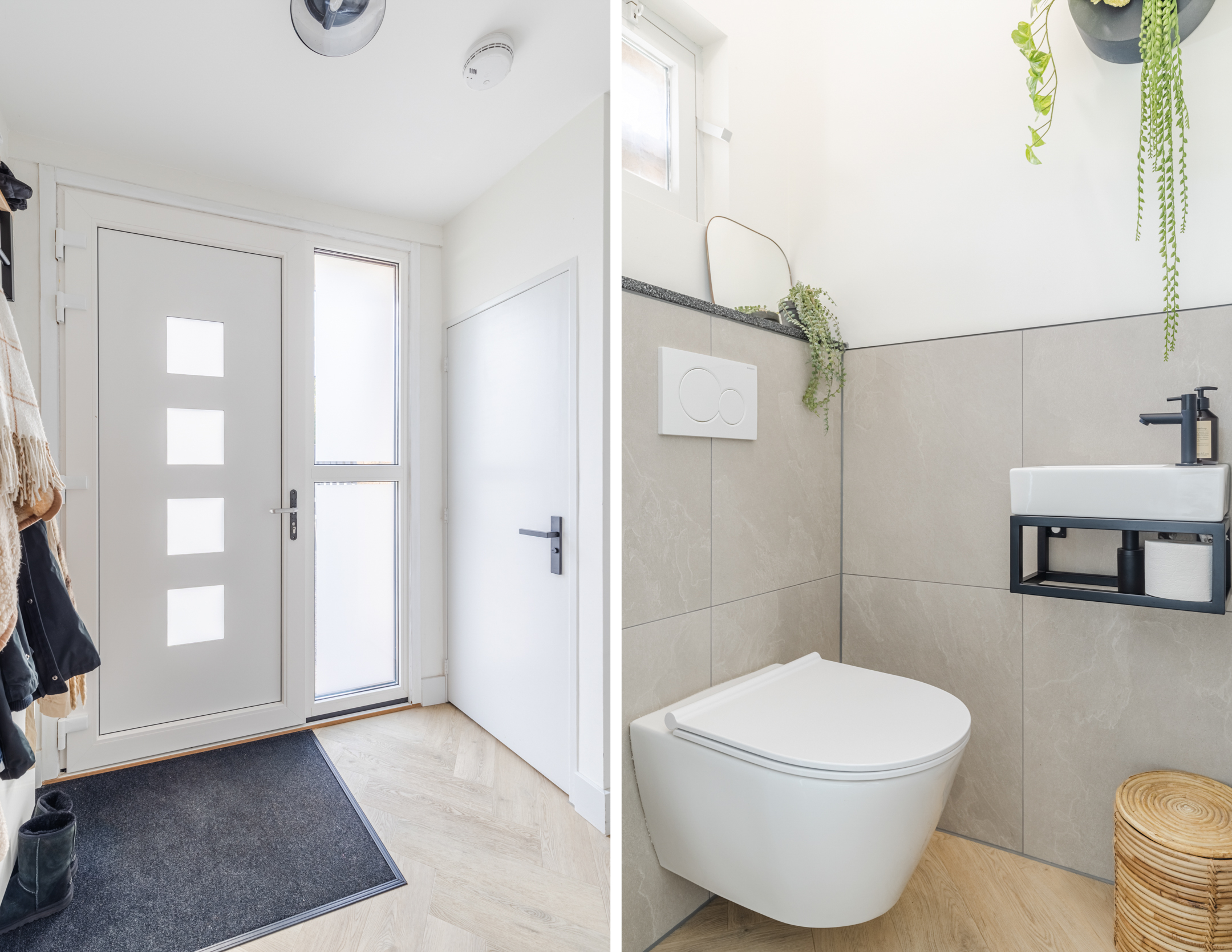Entree, hal, garderobe, toiletruimte met hangend toilet en fontein en een praktische trapkast.