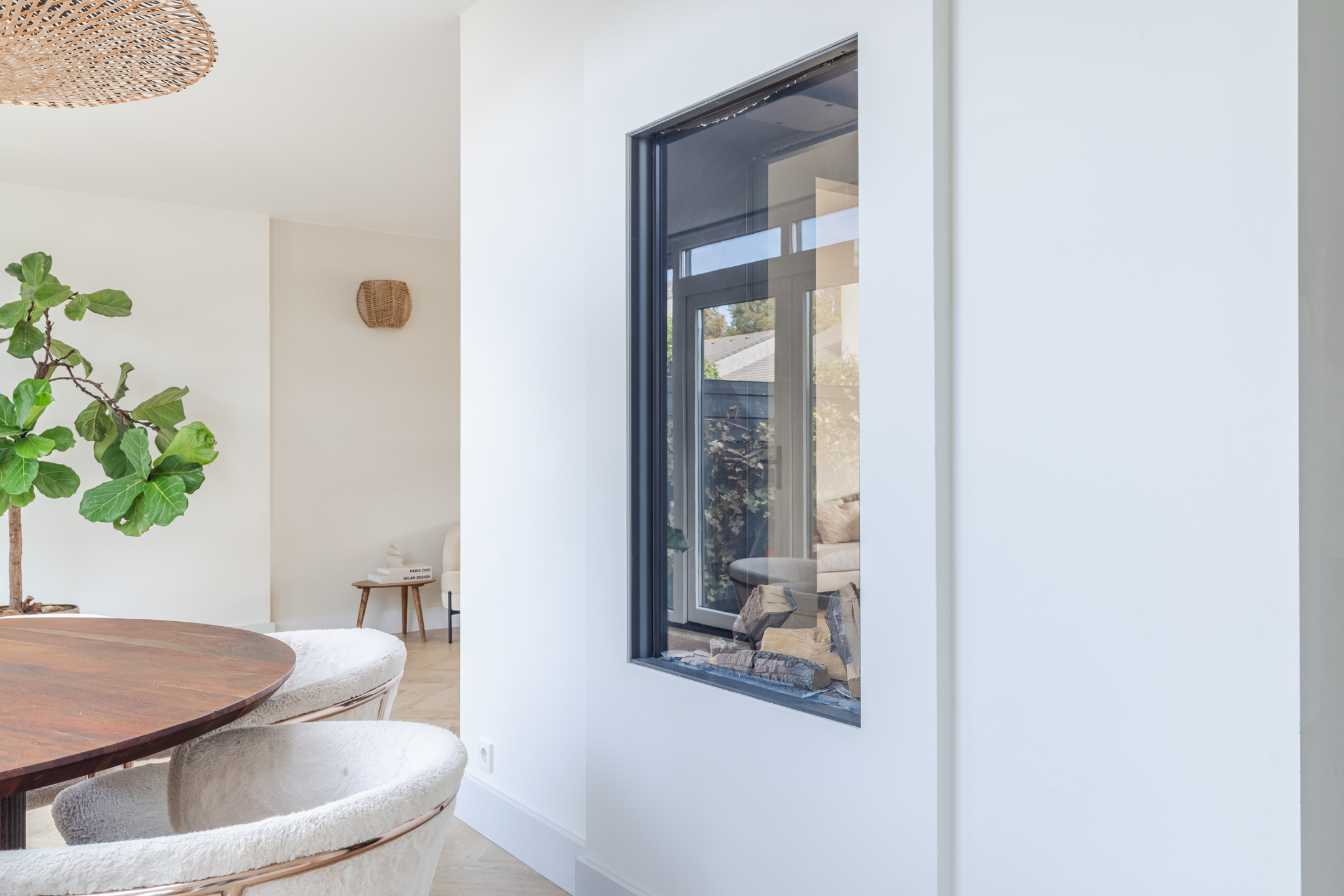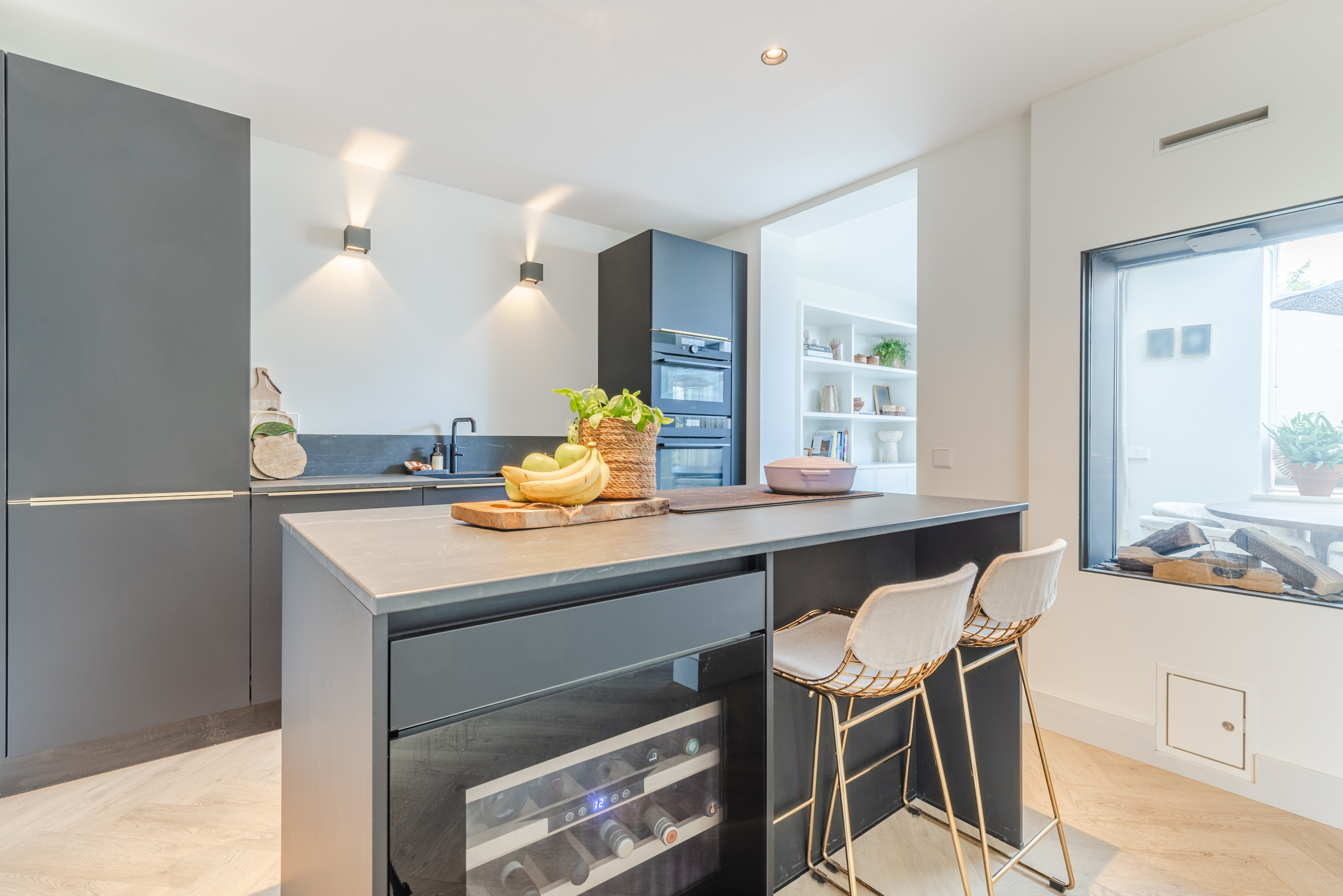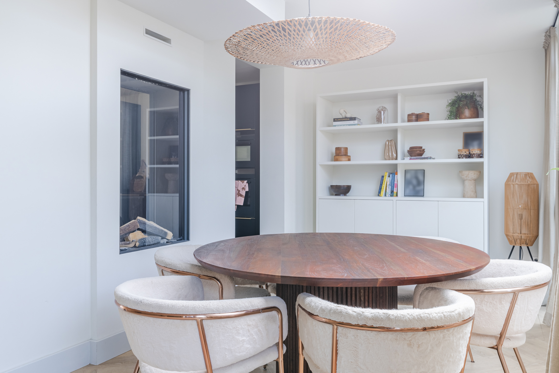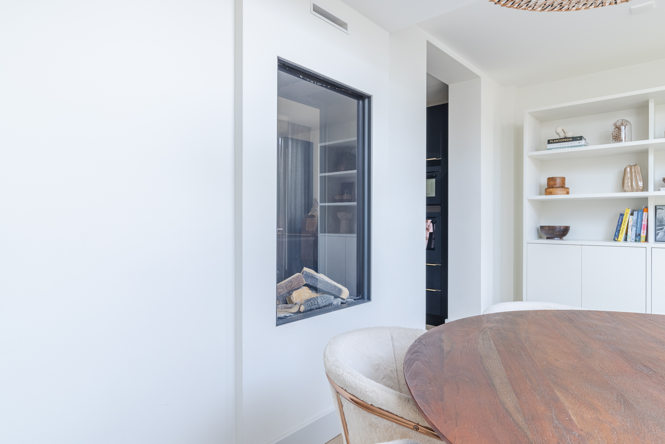 De gashaard vormt een sfeervolle scheiding tussen de eetkamer en de keuken en draagt bij aan de warme uitstraling van het geheel.