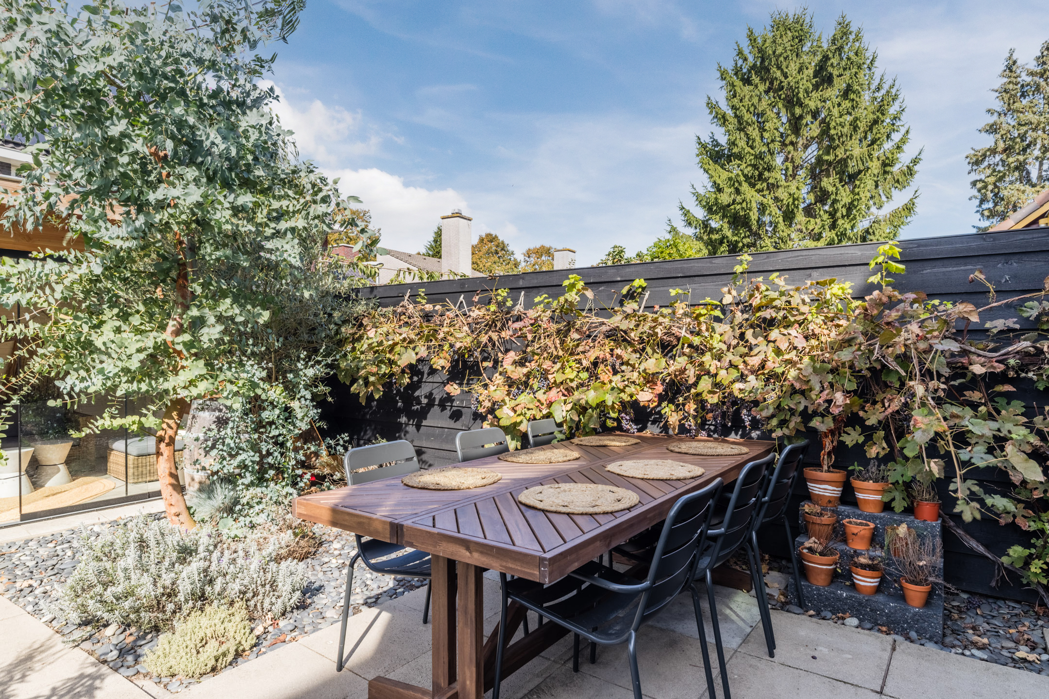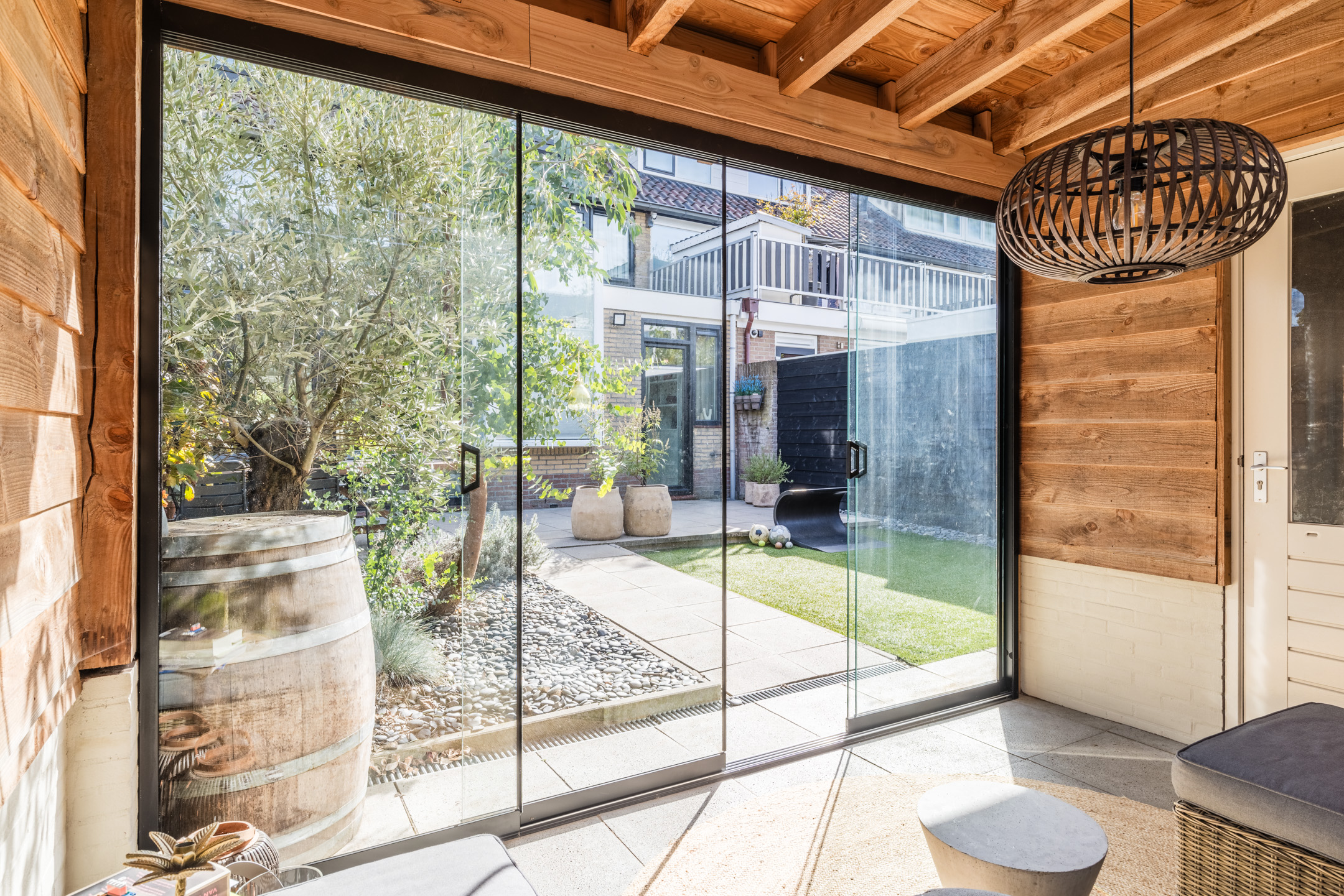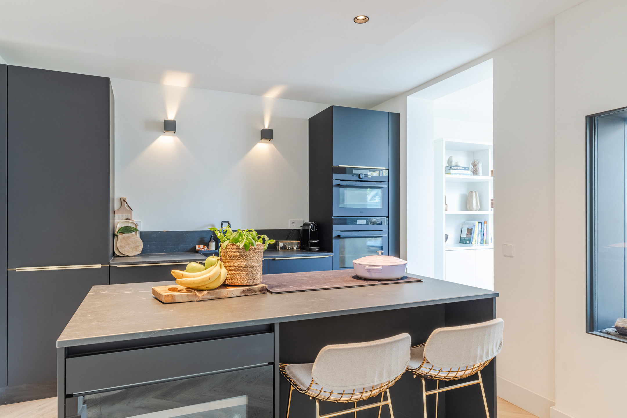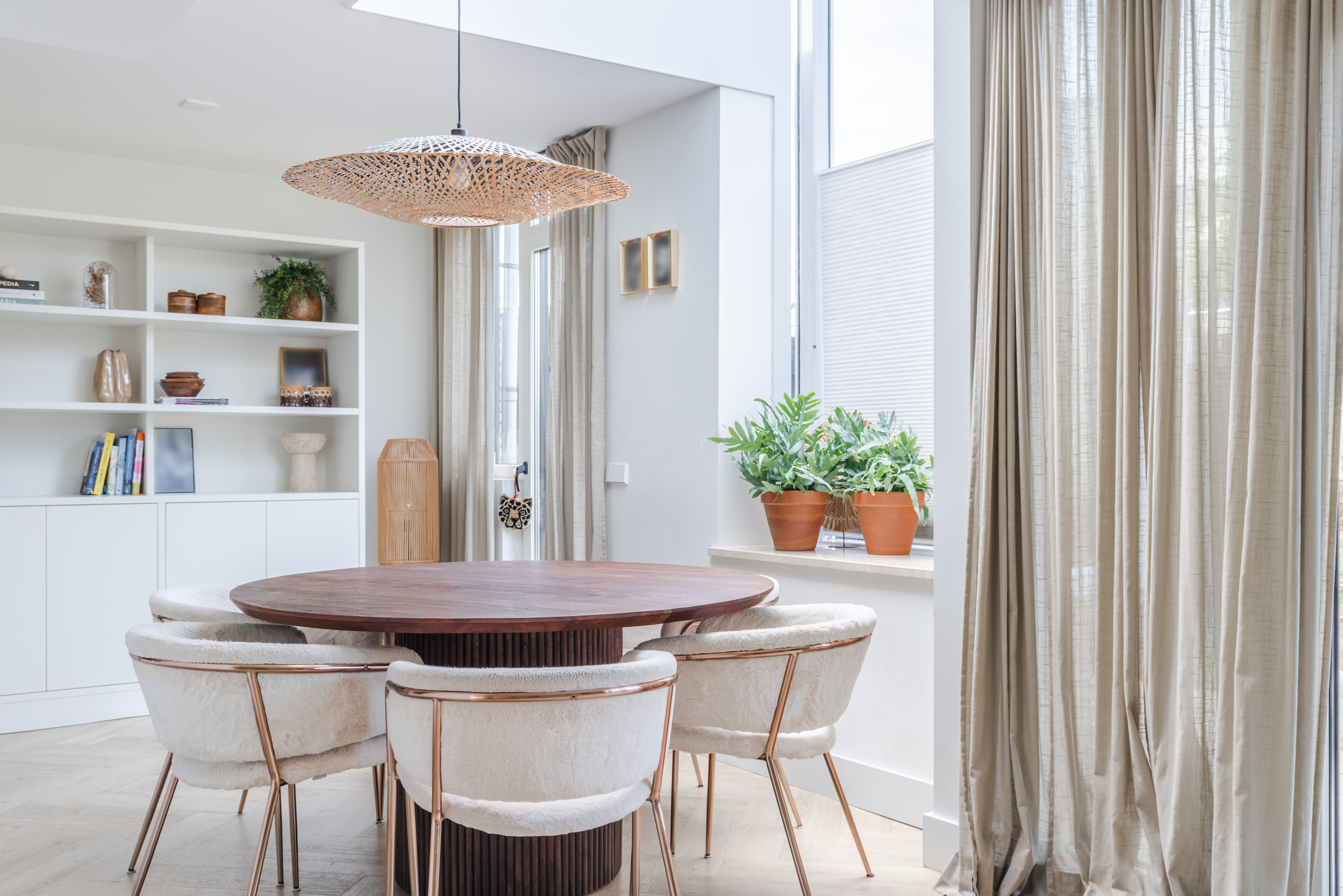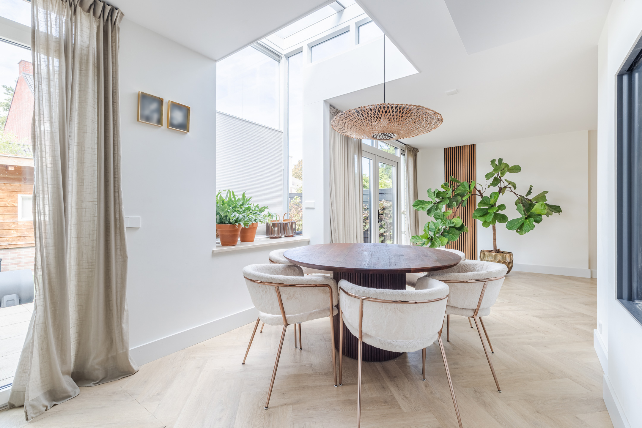 De gashaard vormt een sfeervolle scheiding tussen de eetkamer en de keuken en draagt bij aan de warme uitstraling van het geheel.