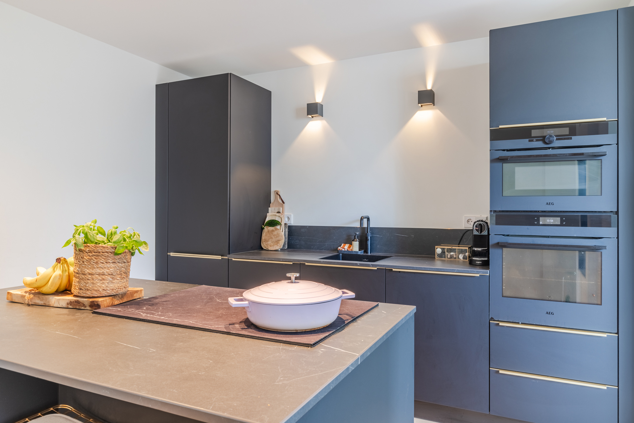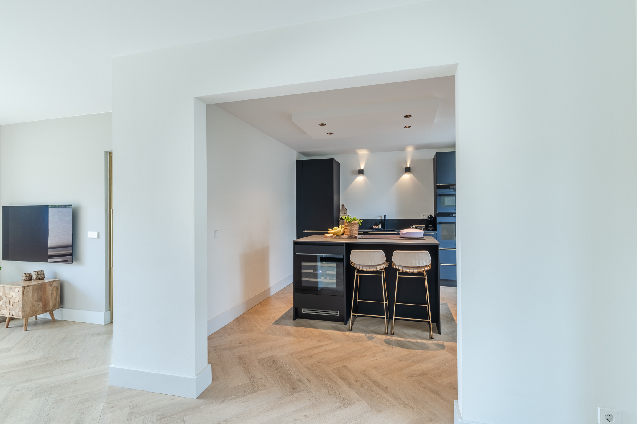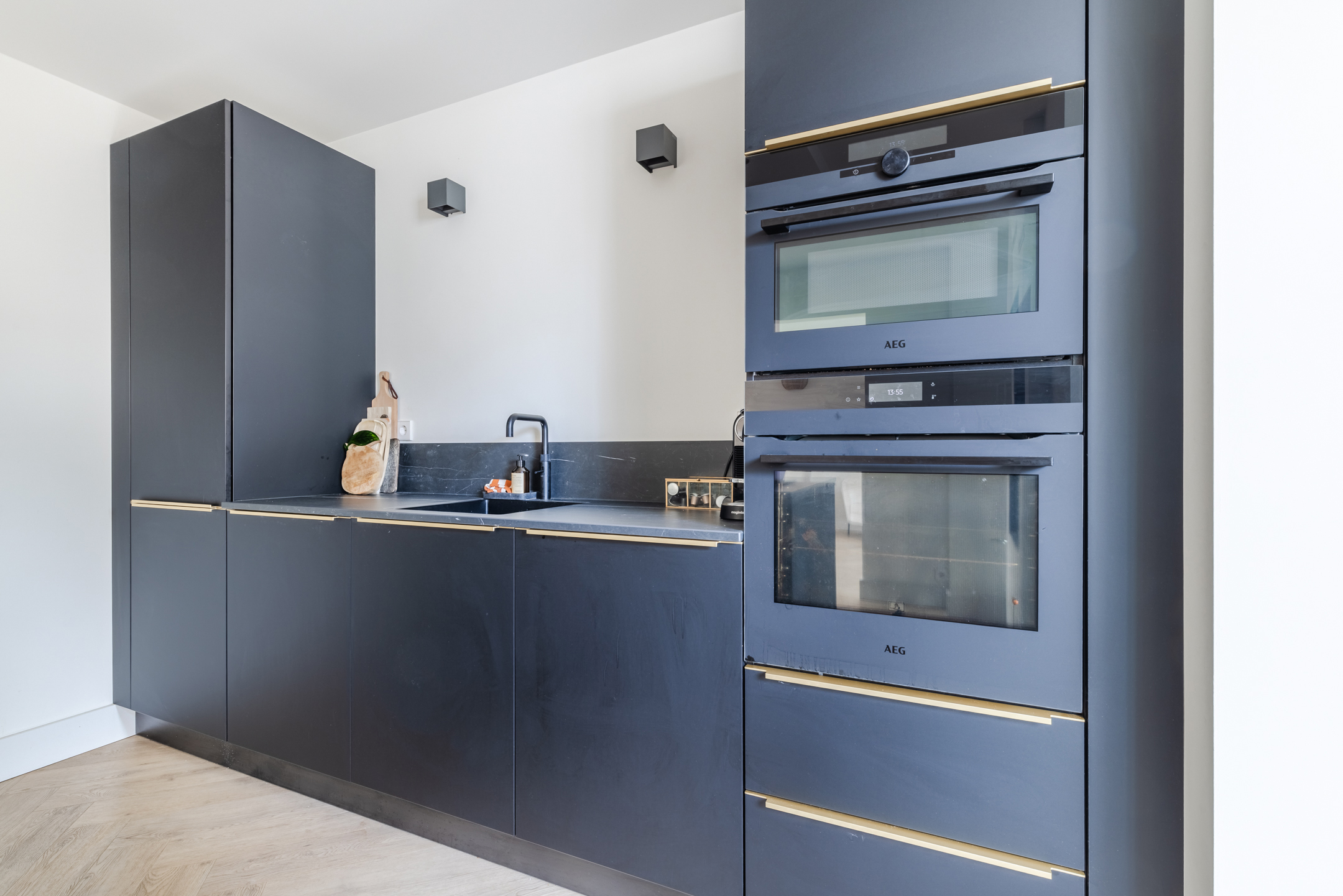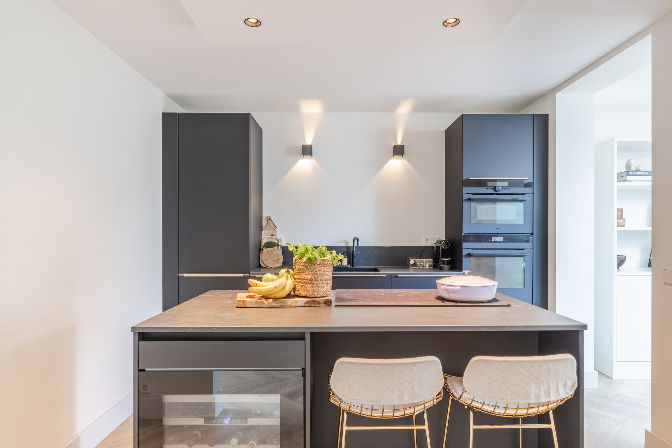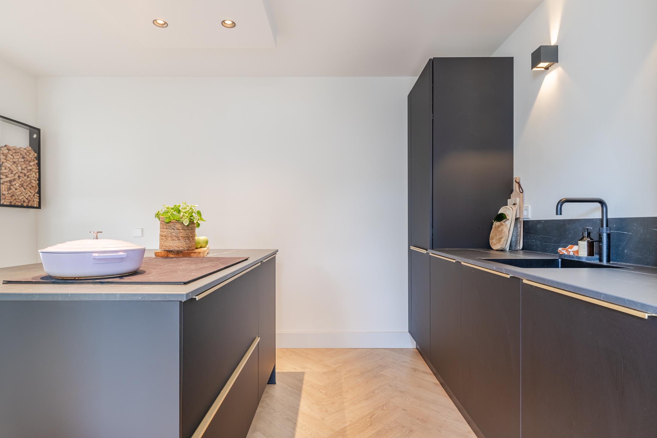 De moderne halfopen keuken bevindt zich in het midden van de woning. De halfopen keuken is geplaatst in een wandopstelling met een kookeiland en uitgevoerd in een zwarte kleurstelling met gouden details (handvaten) en een grijs gemarmerd werkblad. De keuken beschikt over diverse wenselijke inbouwapparatuur, te weten: een inductiekookplaat, een oven, een combi-oven/magnetron, een koel-/vriescombinatie en een vaatwasser. Tevens is er een wijnklimaatkast aanwezig.