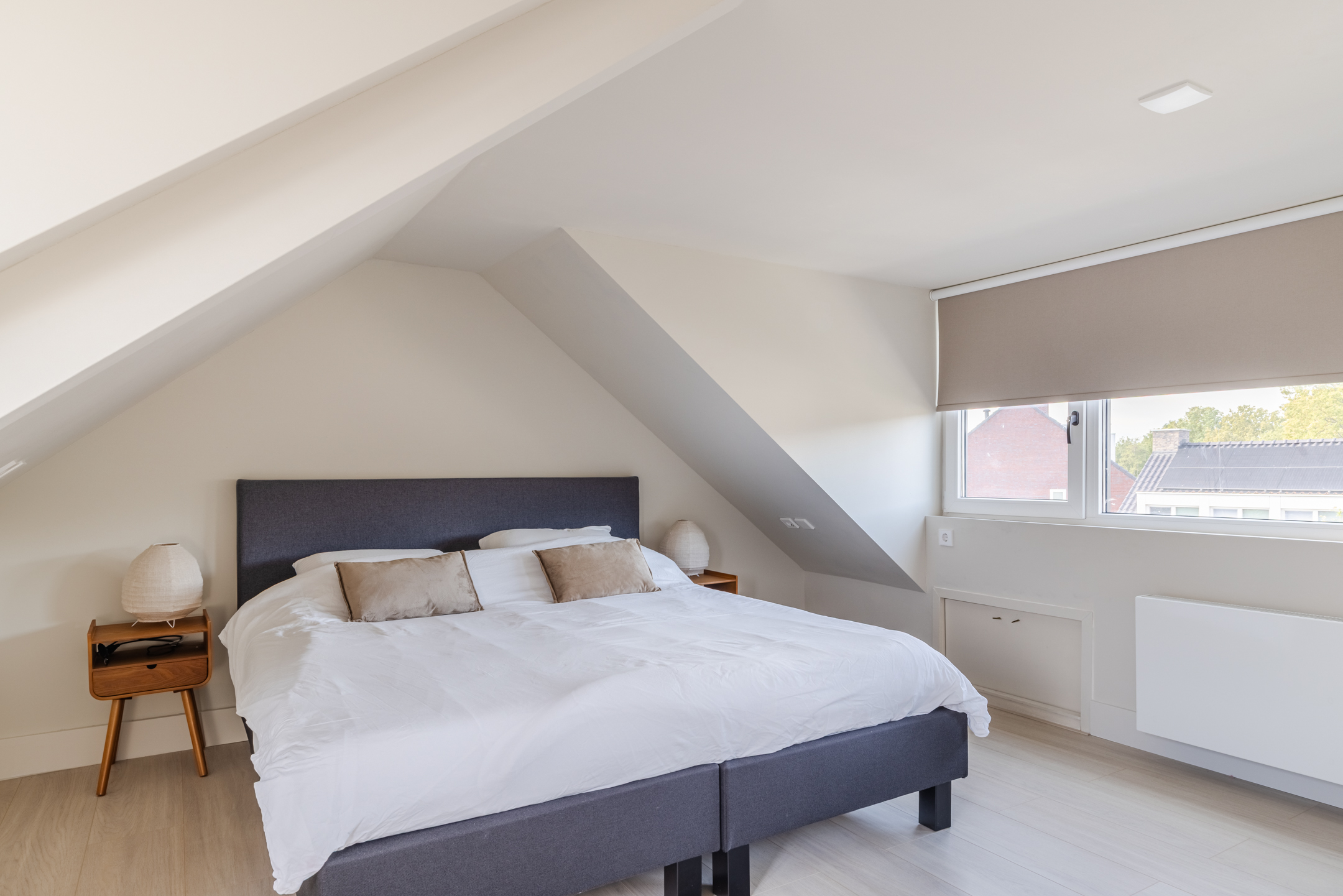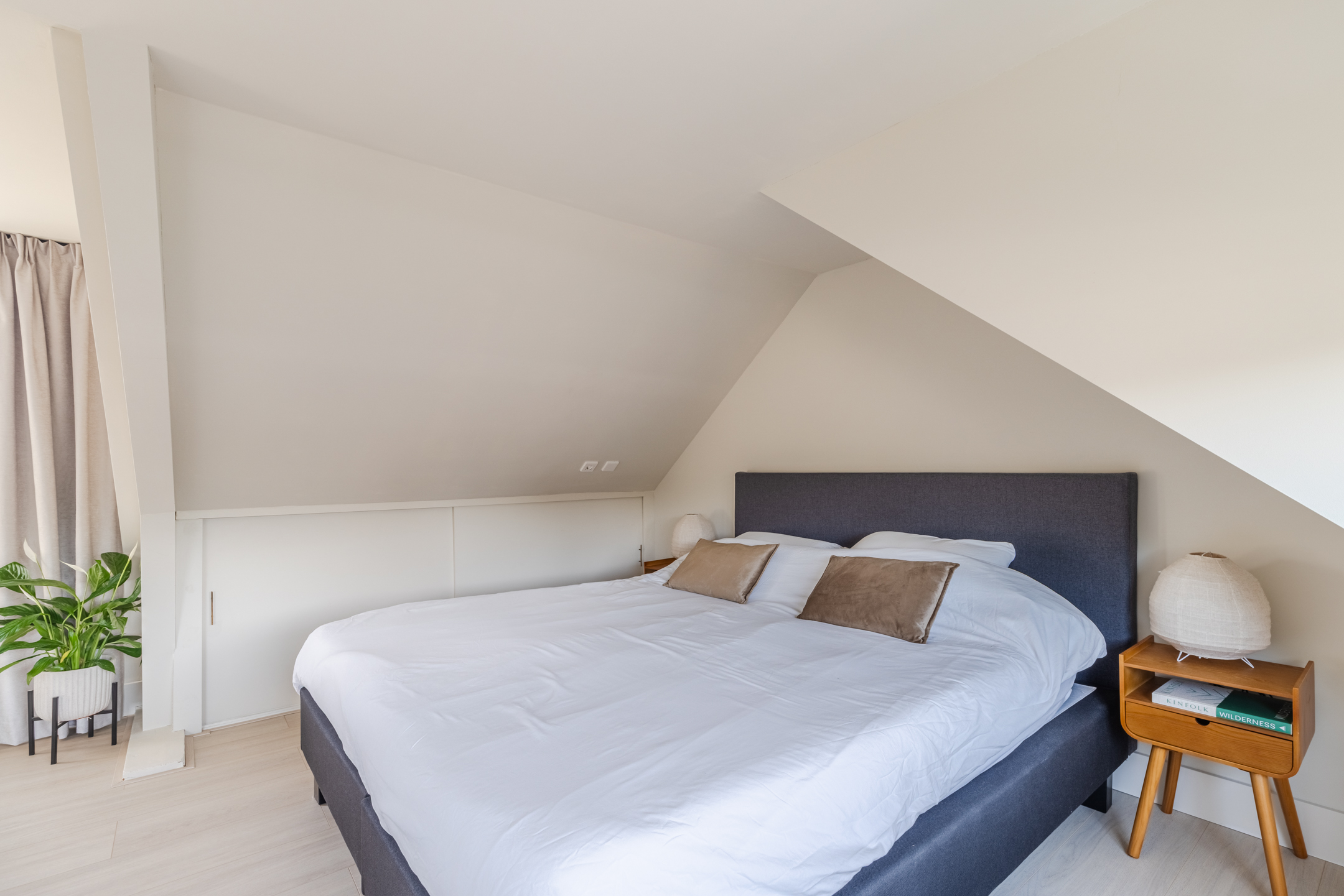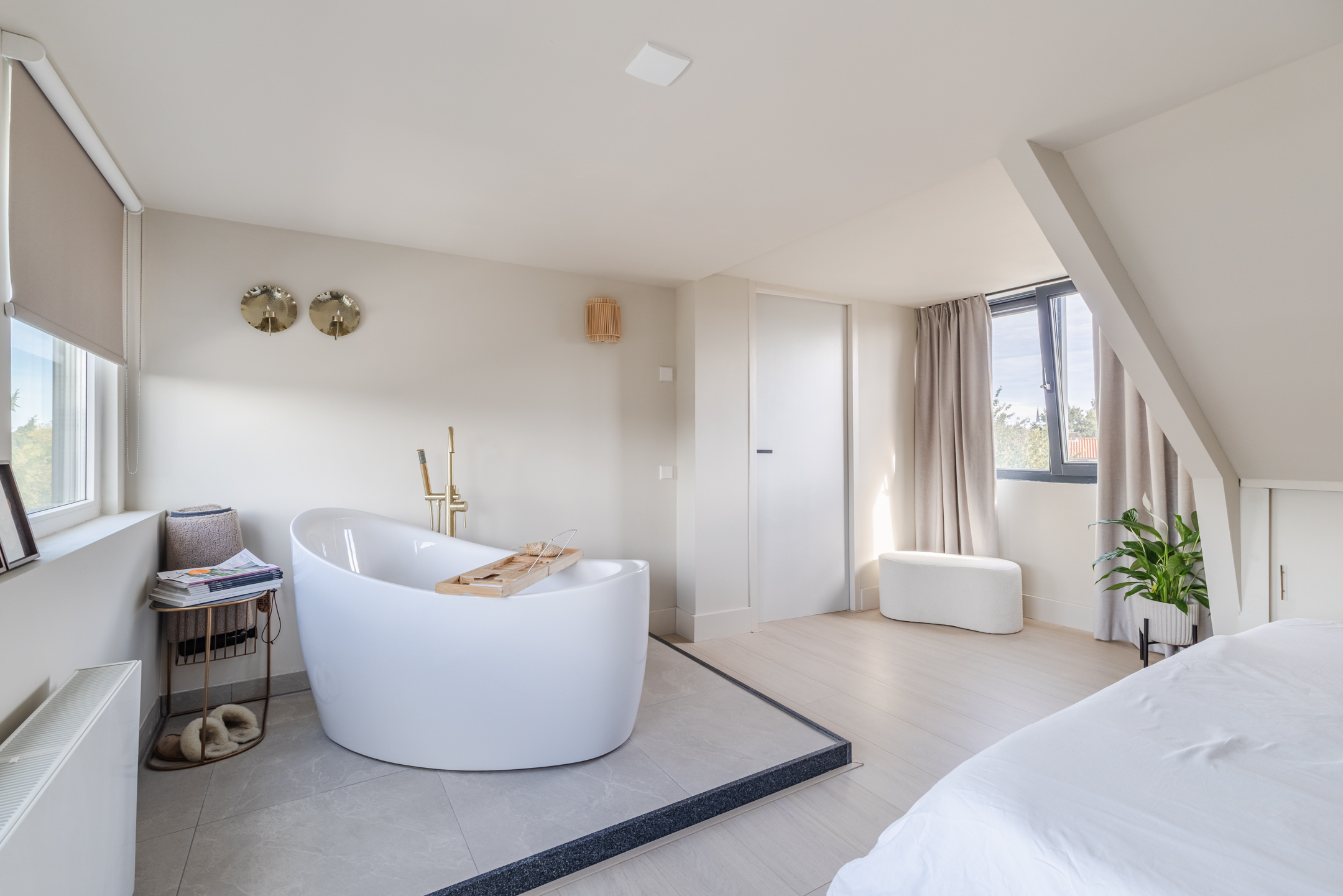 De slaapkamer is ruim en licht dankzij de dakkapellen aan beide zijden en beschikt over een vrijstaand bad, wat zorgt voor een bijzondere en luxe sfeer. De praktische kastenwand op de overloop en de knieschotten zorgen voor extra bergruimte.