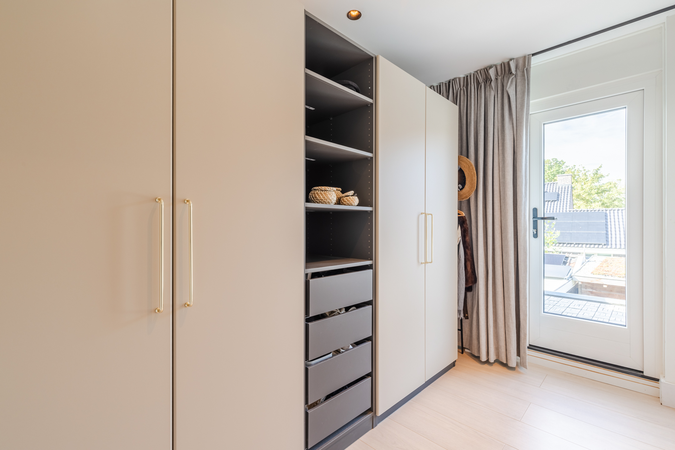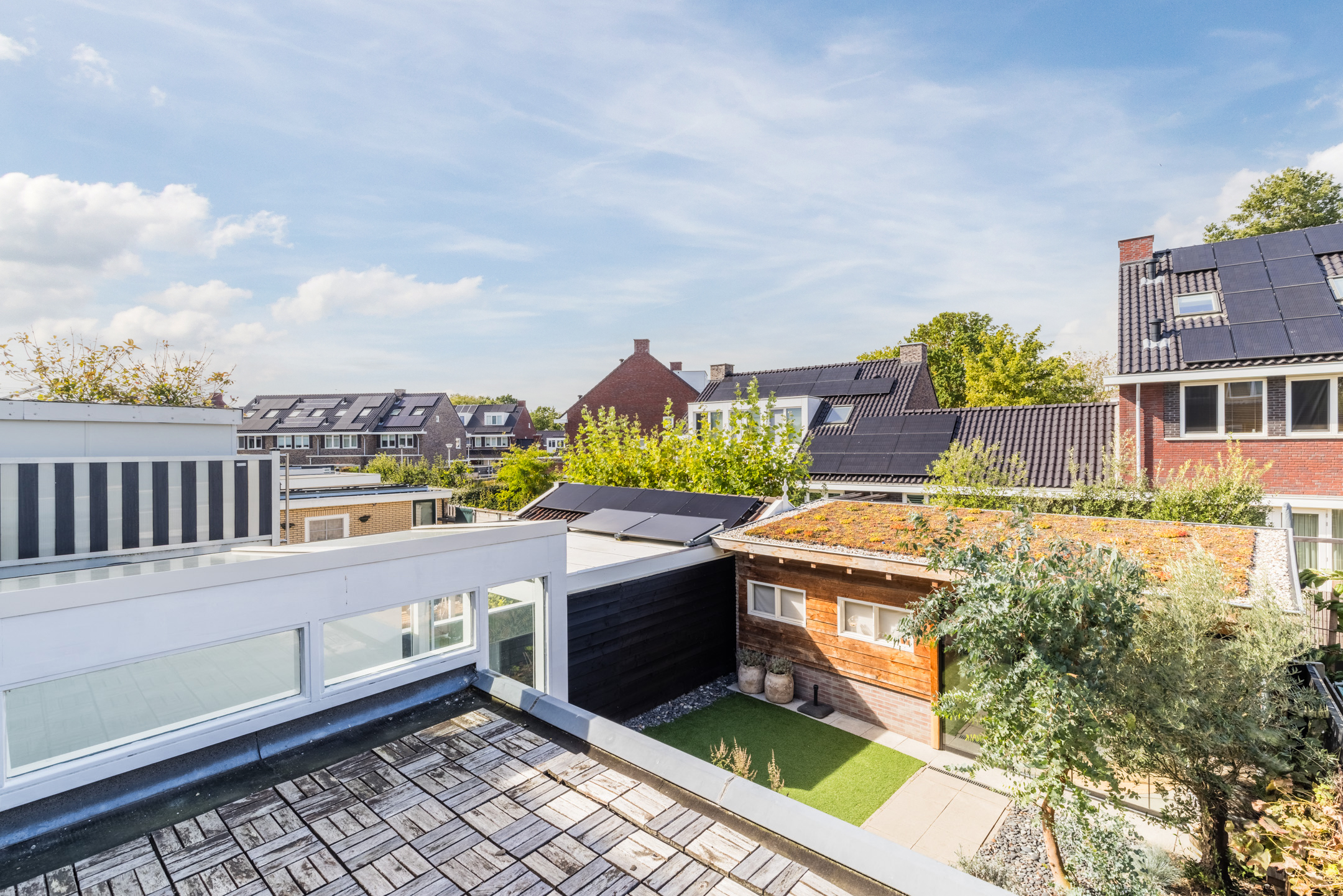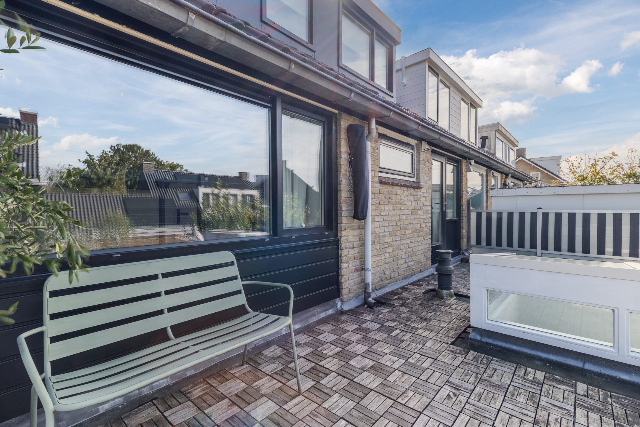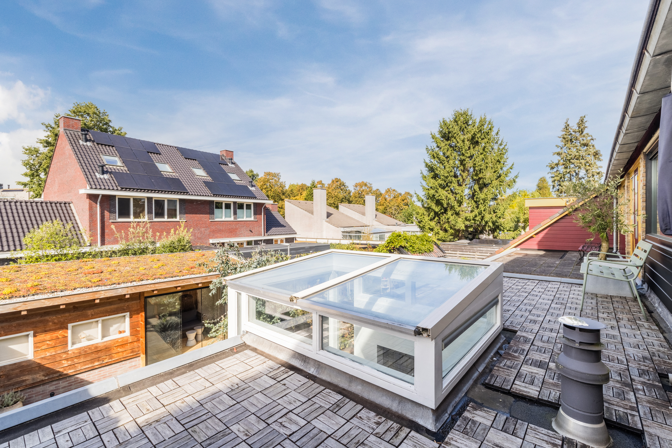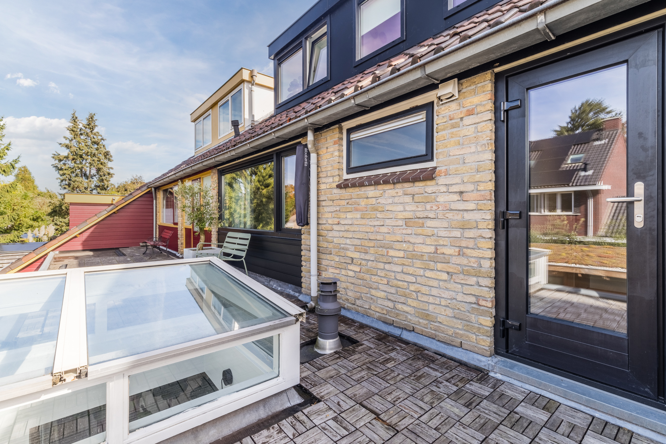 Aan de achterzijde bevinden zich eveneens twee slaapkamers, waarvan één beschikt over een praktische inbouwkast en één kamer (nu in gebruik als inloopkast) die directe toegang biedt tot het dakterras.