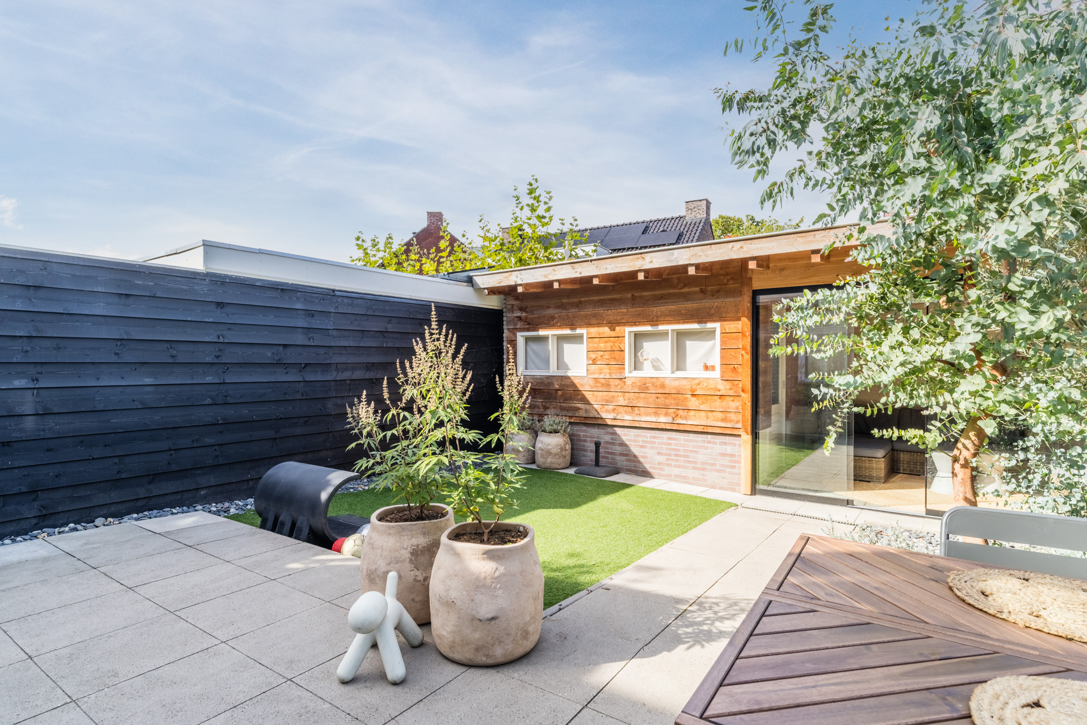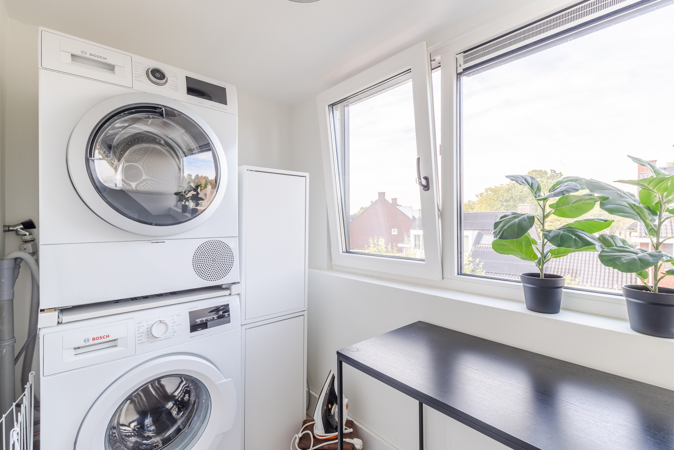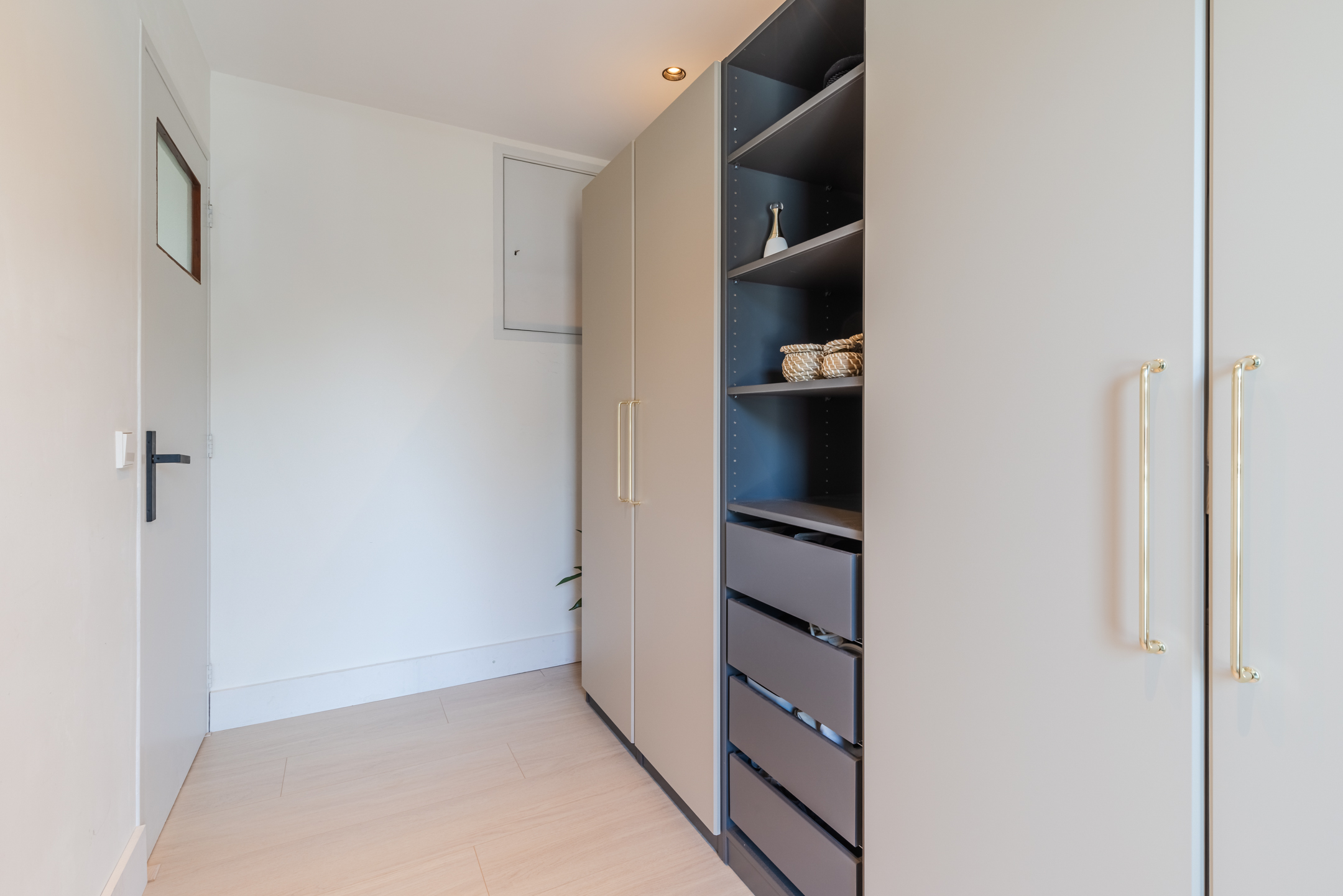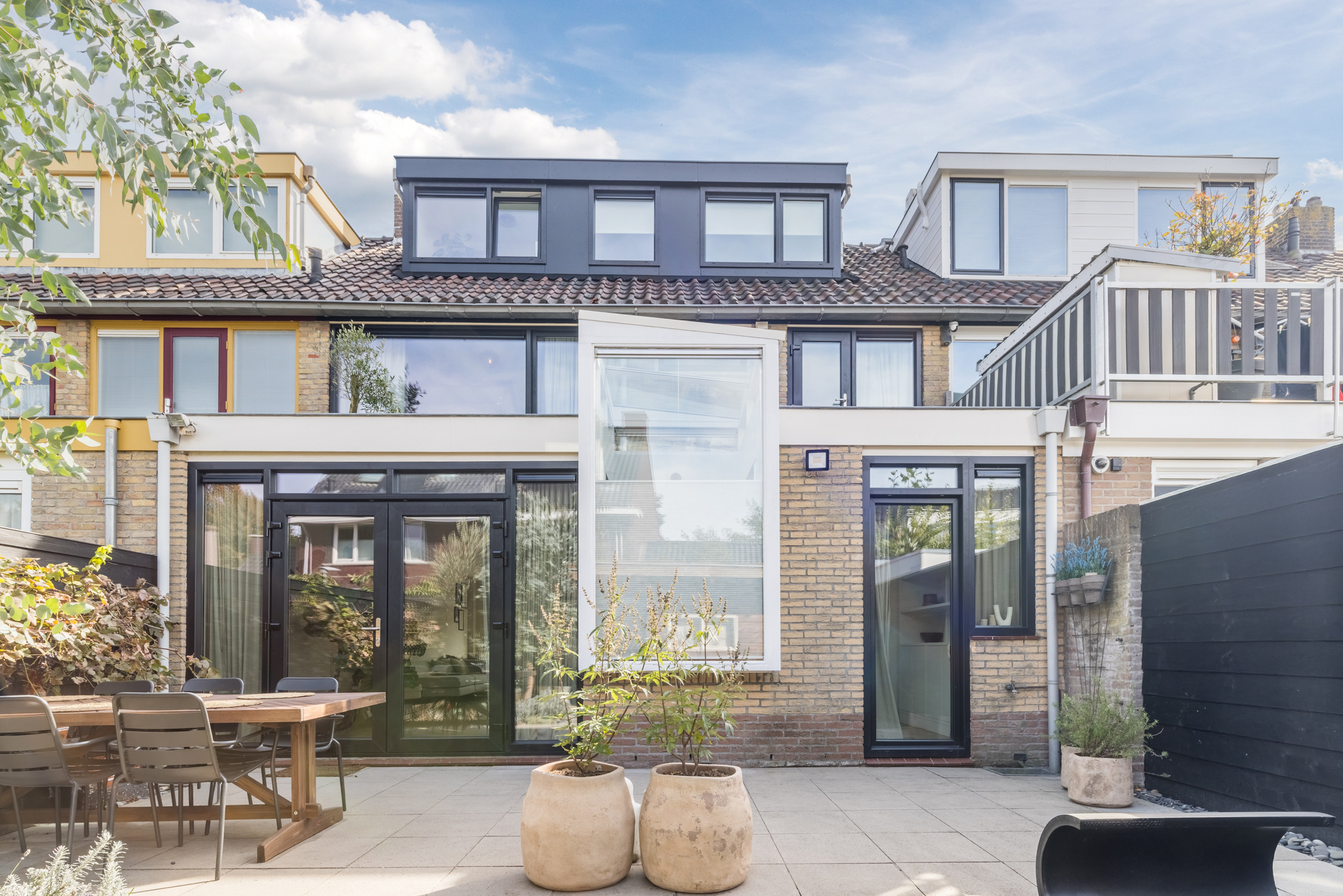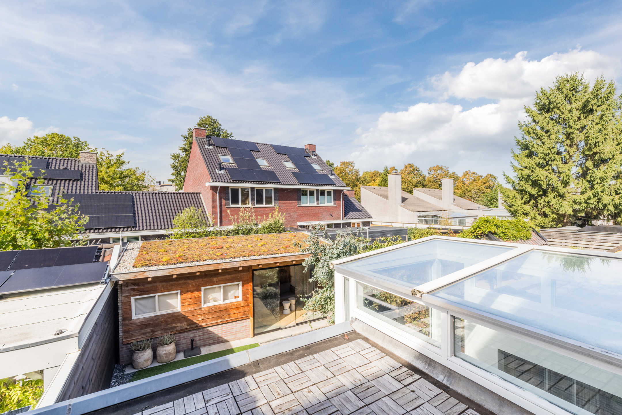 Aan de achterzijde bevinden zich eveneens twee slaapkamers, waarvan één beschikt over een praktische inbouwkast en één kamer (nu in gebruik als inloopkast) die directe toegang biedt tot het dakterras.