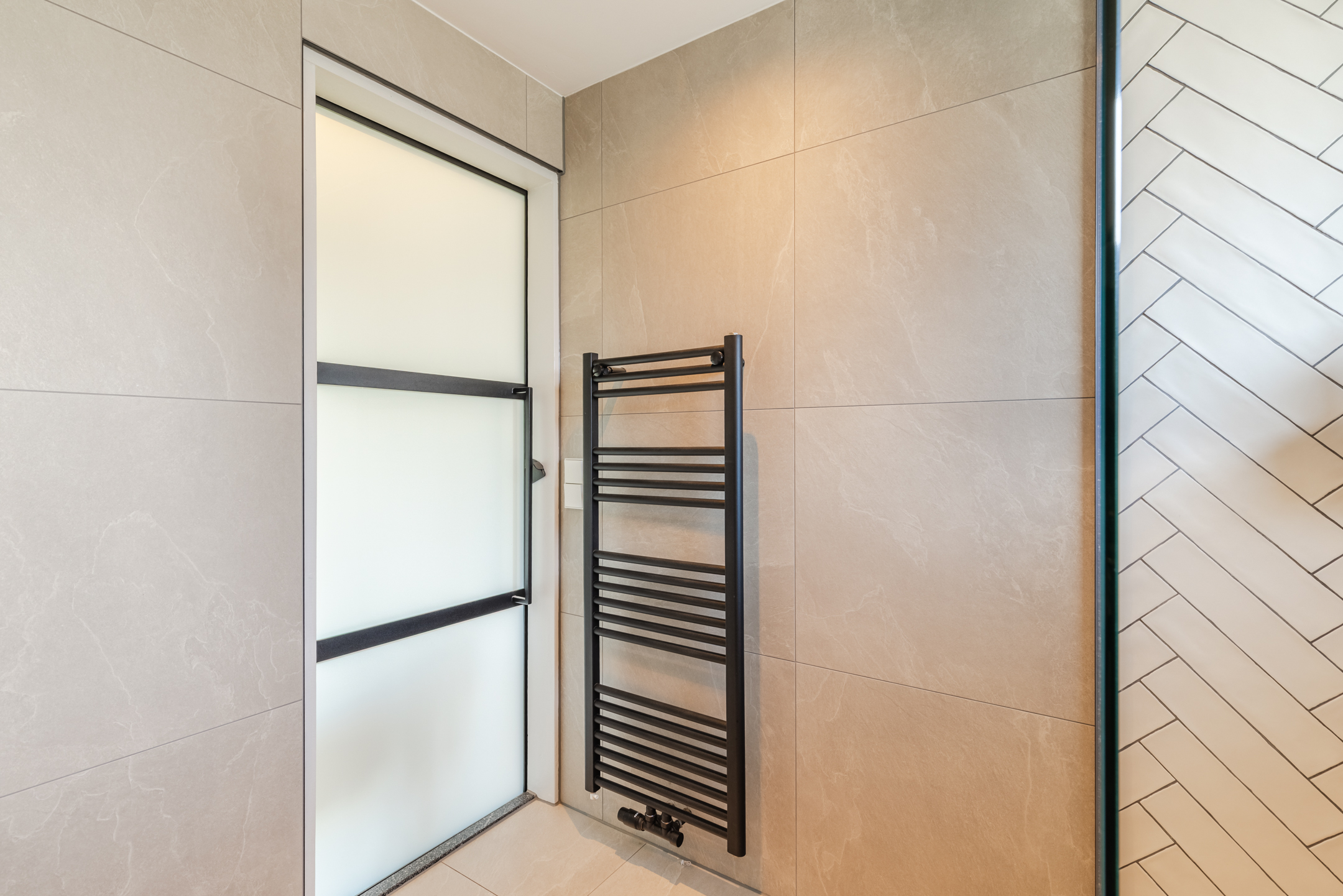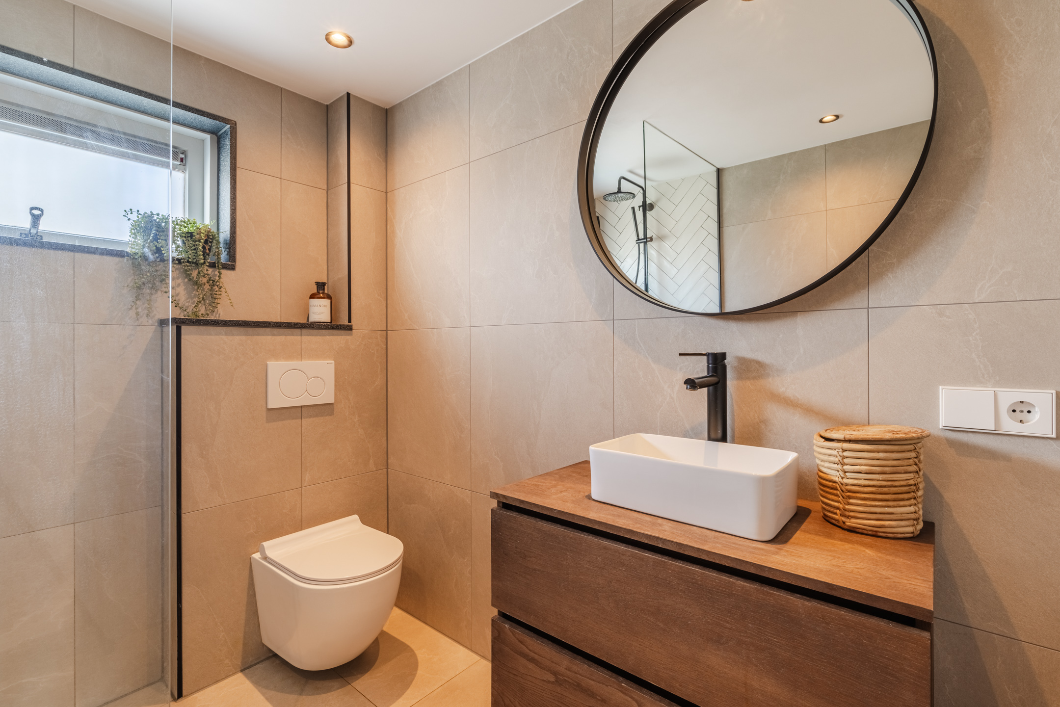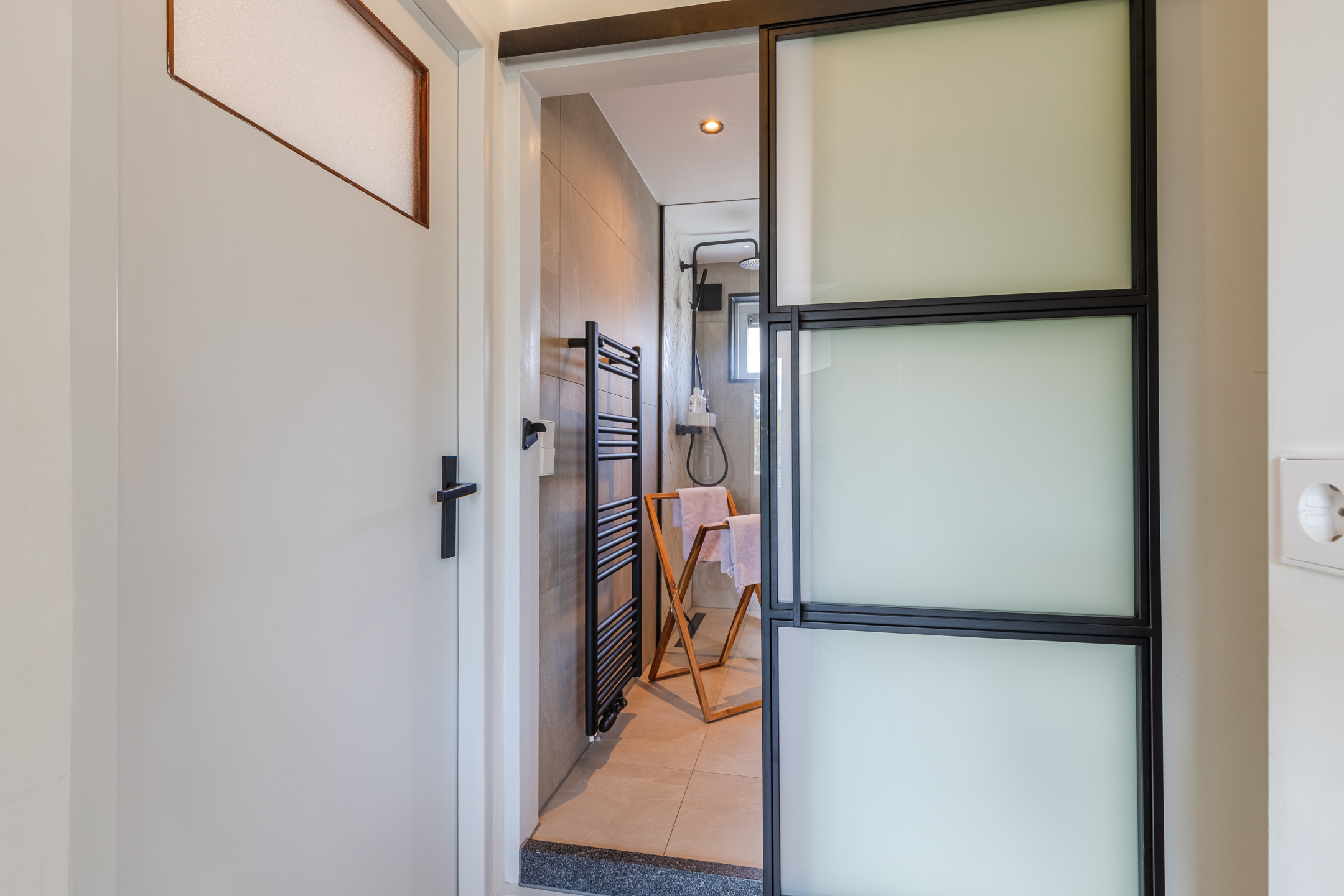 De badkamer bevindt zich aan de achterzijde tussen de twee slaapkamers en is uitgevoerd in een hotel chique stijl met natuurlijke tinten. De badkamer beschikt over een inloopdouche, een wastafel met meubel, een tweede toilet en een raam voor natuurlijke ventilatie. Daarnaast is er een zwarte designradiator aanwezig.