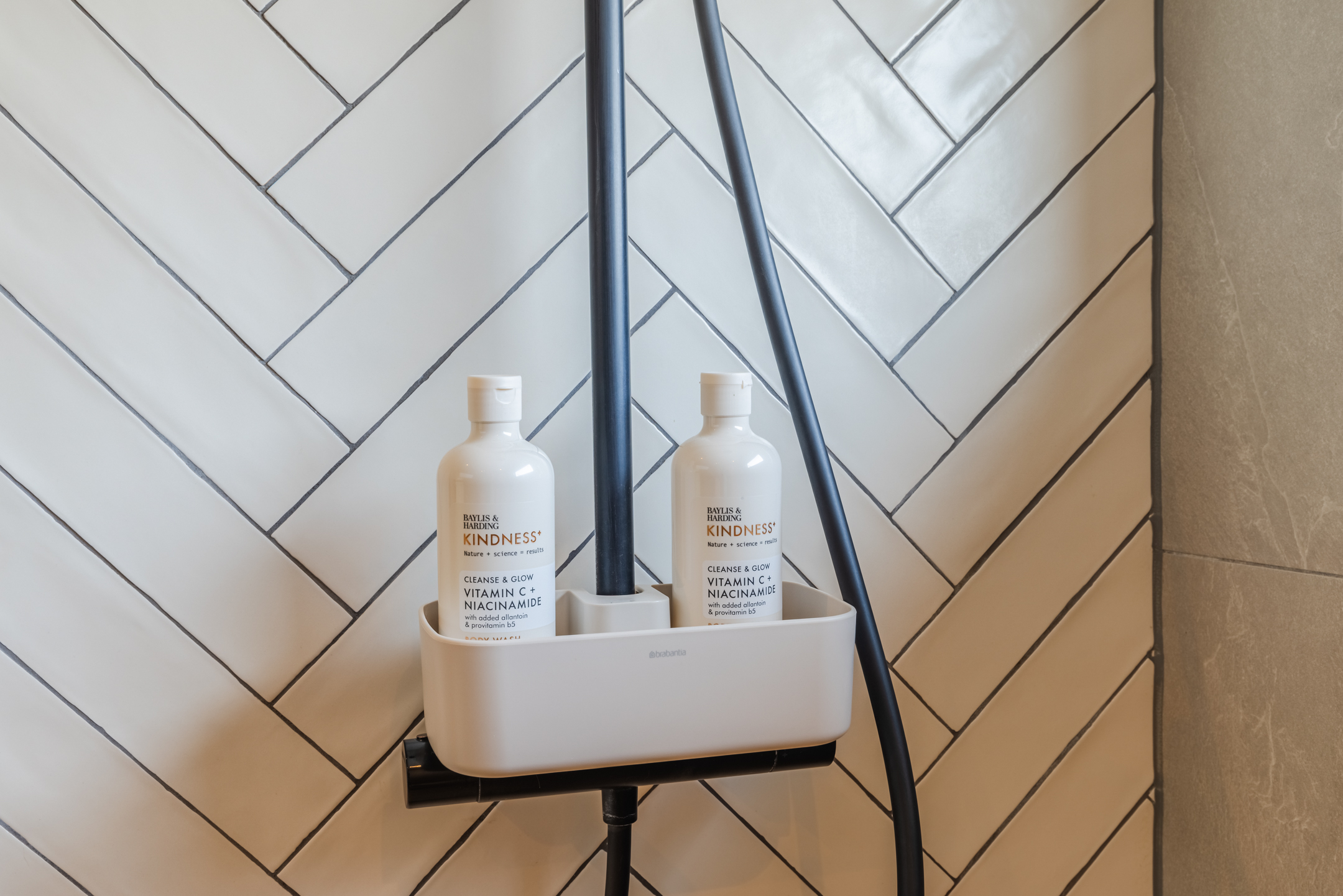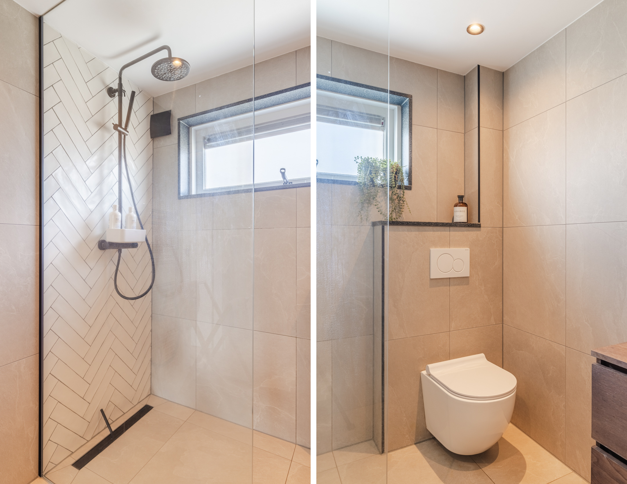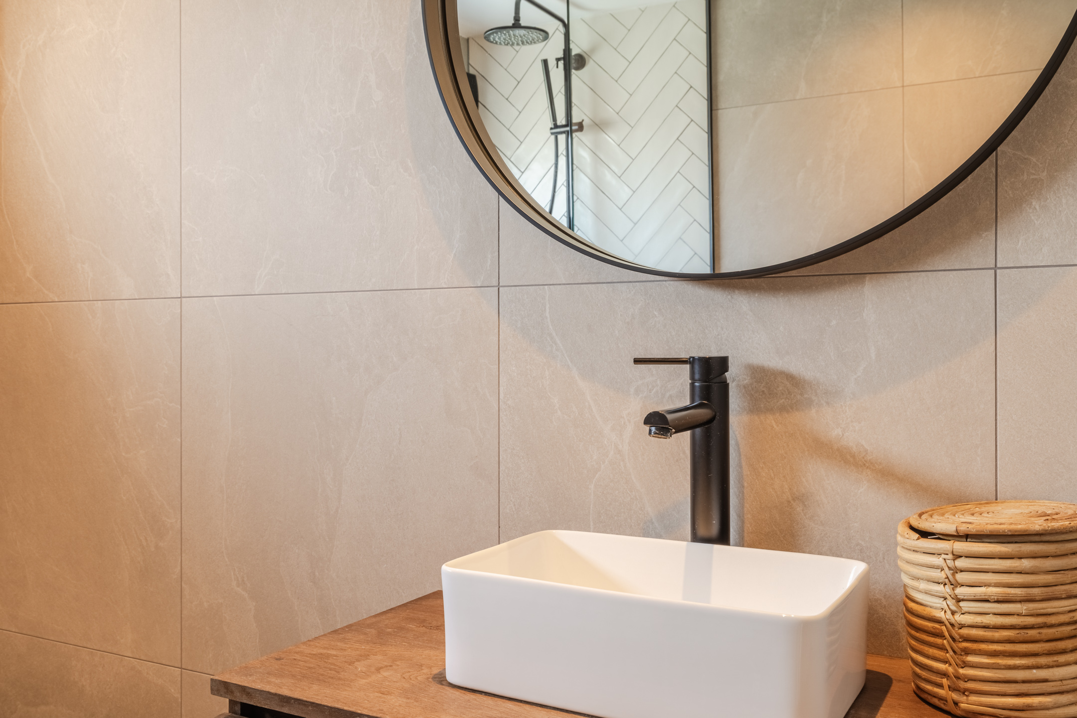 De badkamer bevindt zich aan de achterzijde tussen de twee slaapkamers en is uitgevoerd in een hotel chique stijl met natuurlijke tinten. De badkamer beschikt over een inloopdouche, een wastafel met meubel, een tweede toilet en een raam voor natuurlijke ventilatie. Daarnaast is er een zwarte designradiator aanwezig.