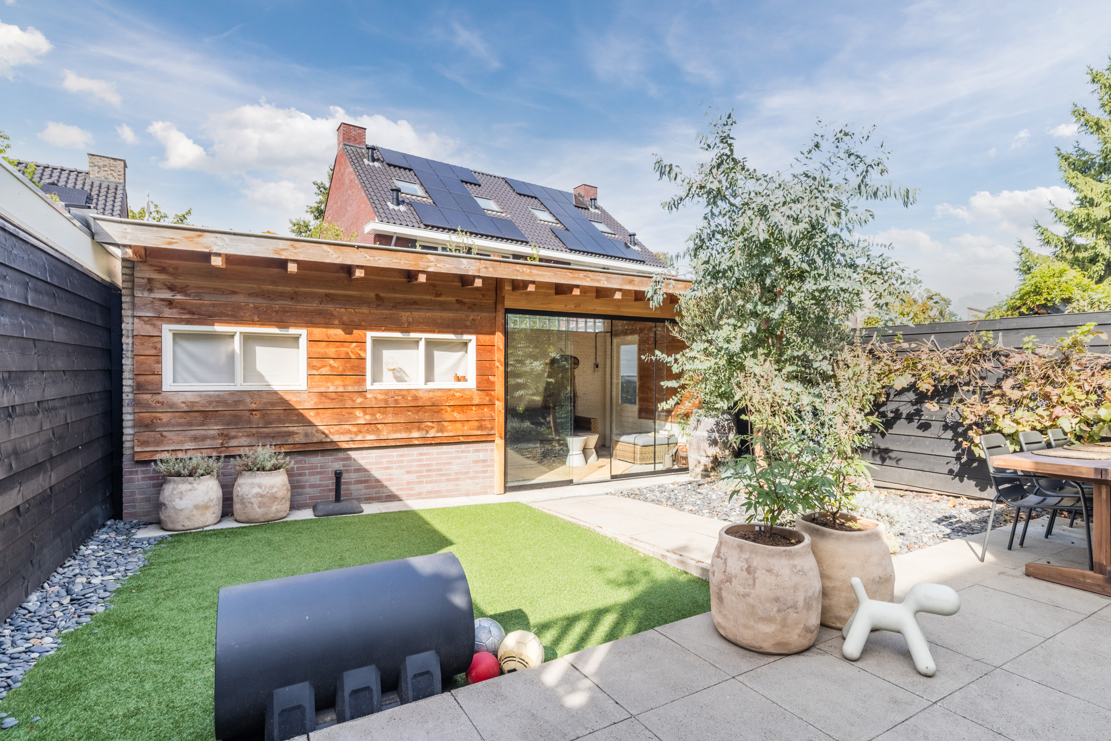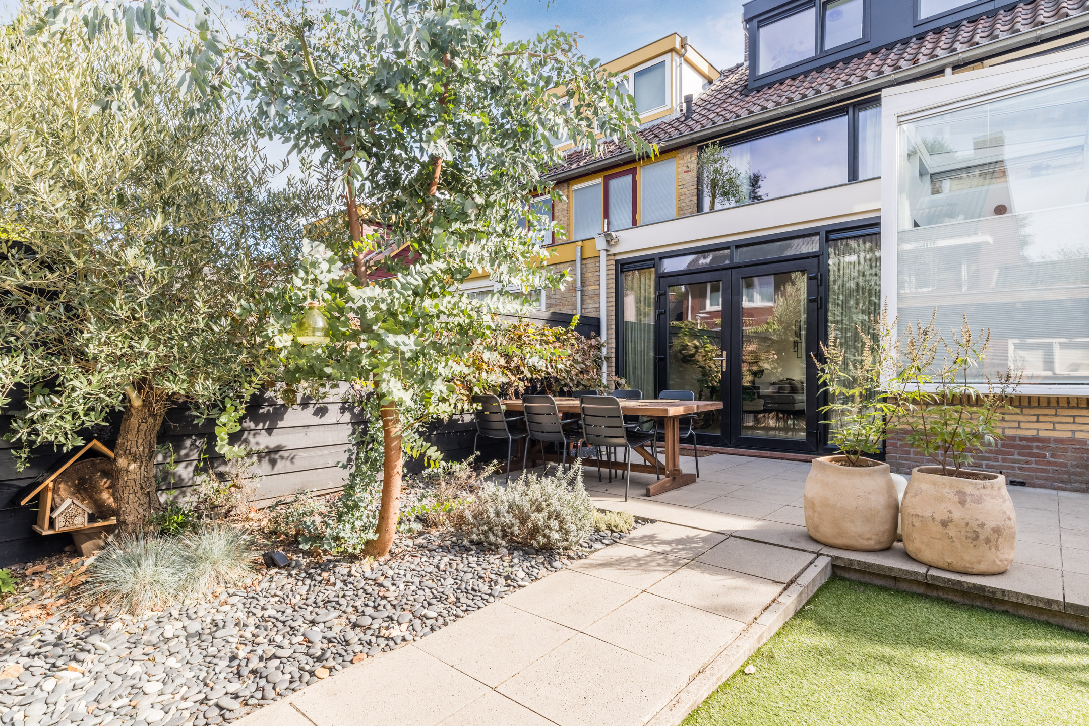 De woning beschikt over een voortuin met een eigen oprit waar je twee auto’s kunt parkeren en een sfeervol aangelegde achtertuin op het noord/westen. De achtertuin beschikt over een heerlijk groot terras, kunstgras, een vr ijstaande houten berging met een tuinkamer met glazen wand. Een fijne plek om het hele jaar door te genieten.