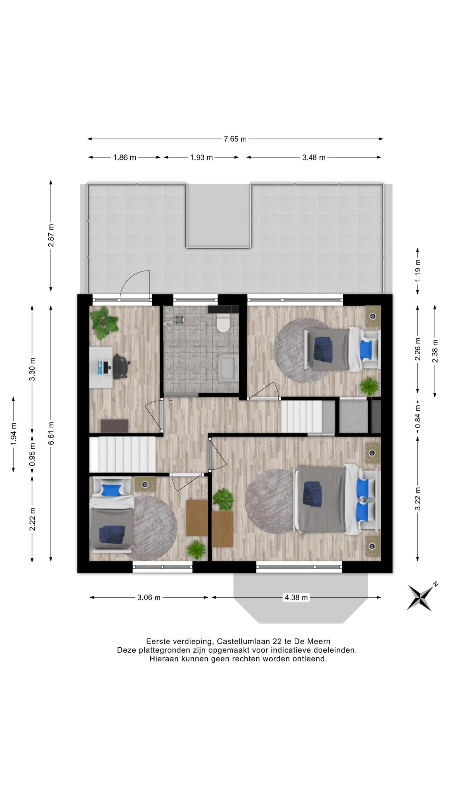 Overloop, toegang tot vier multifunctionele (slaap)kamers en de badkamer.