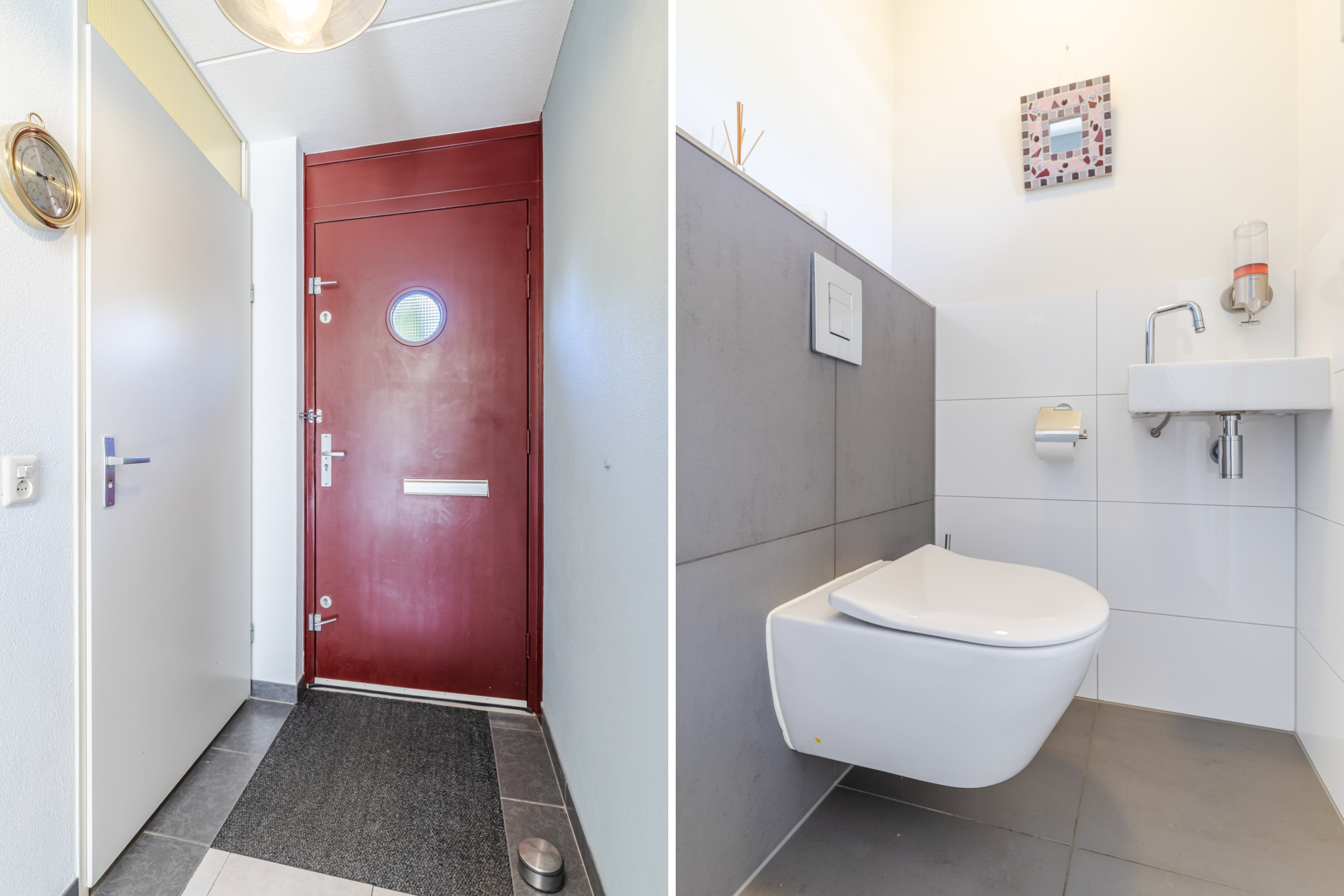 Entree voorzien van garderobe, modern toilet met fonteintje, meterkast en toegang tot de woonkamer.