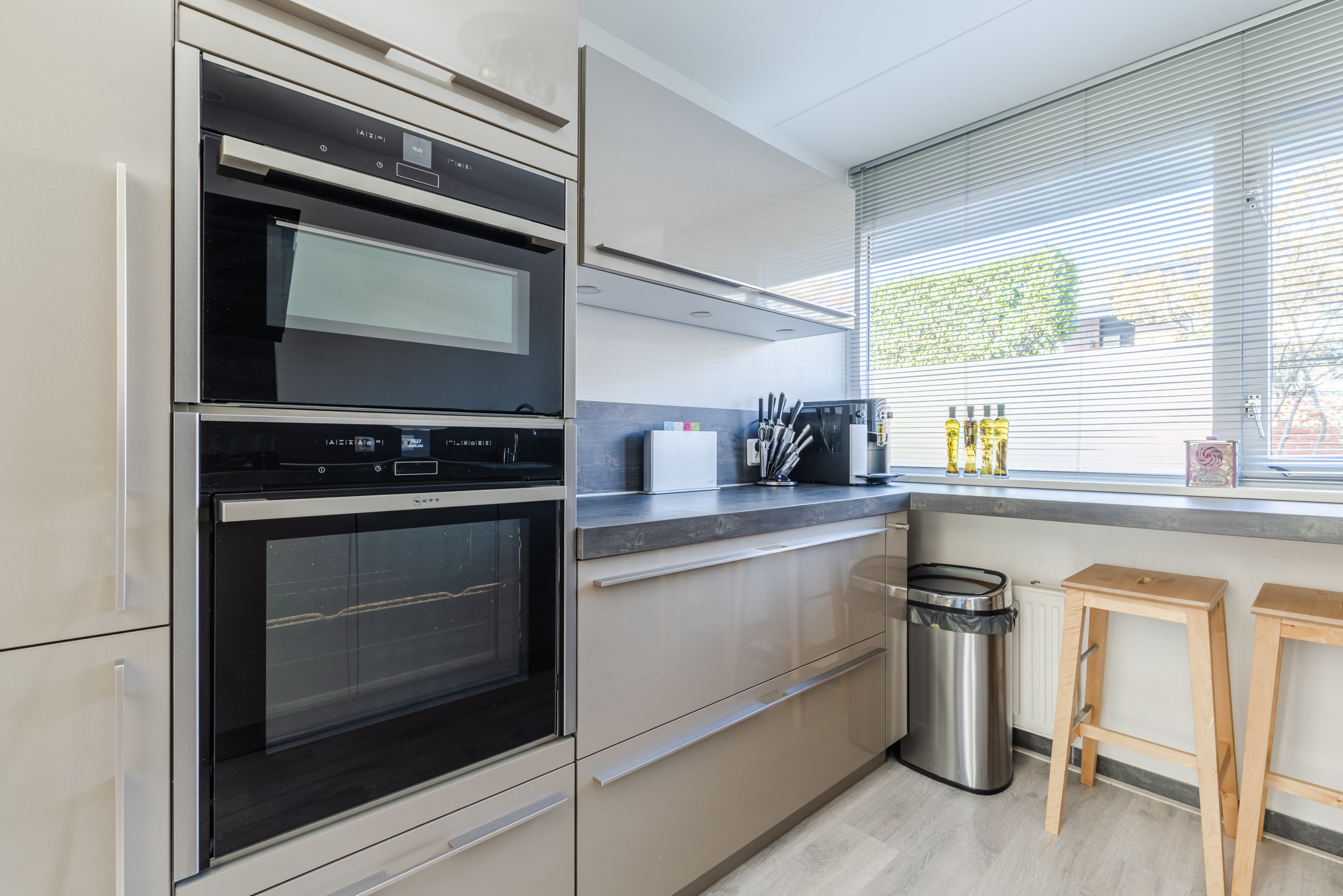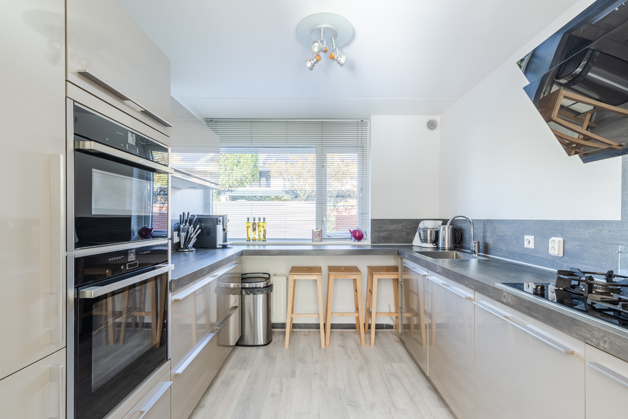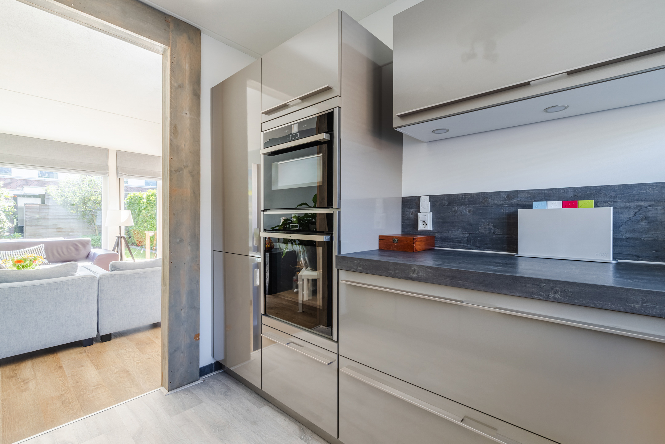 Aan de voorzijde bevindt zich de moderne keuken (geplaatst medio 2017). Deze stijlvolle, hoogglans keuken (ca. 3.02×2.71m) in taupe kleurstelling en kunststof aanrechtblad in houtlook, beschikt over alle nodige apparatuur (vijf-pits gasfornuis, moderne afzuigkap, oven en combi-oven, vaatwasser en koel-vriescombinatie). Door de slimme U-opstelling is er veel werkruimte en is er tevens de mogelijkheid om aan de bar, met uitzicht naar buiten, te genieten van een ontbijtje of een kopje koffie.