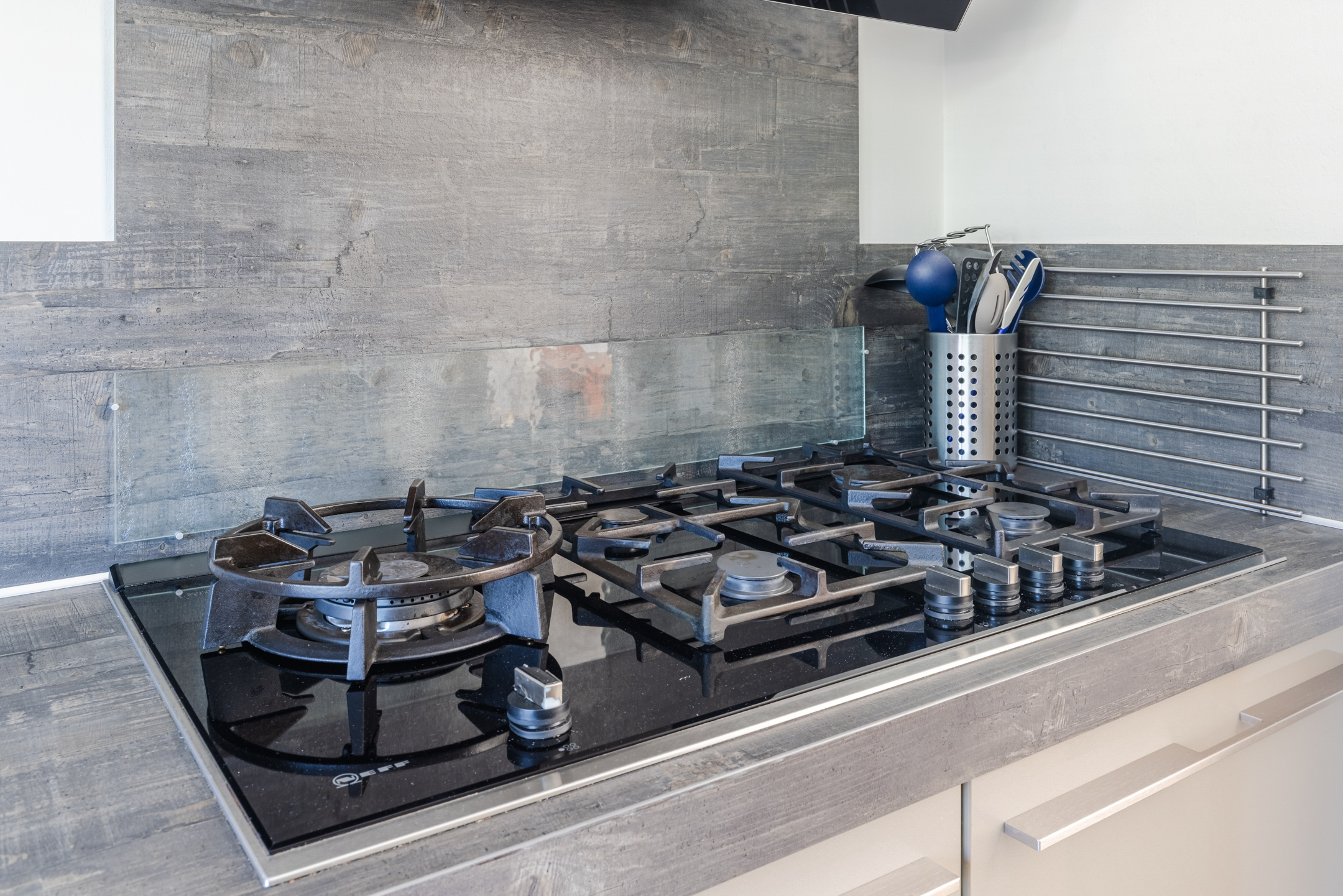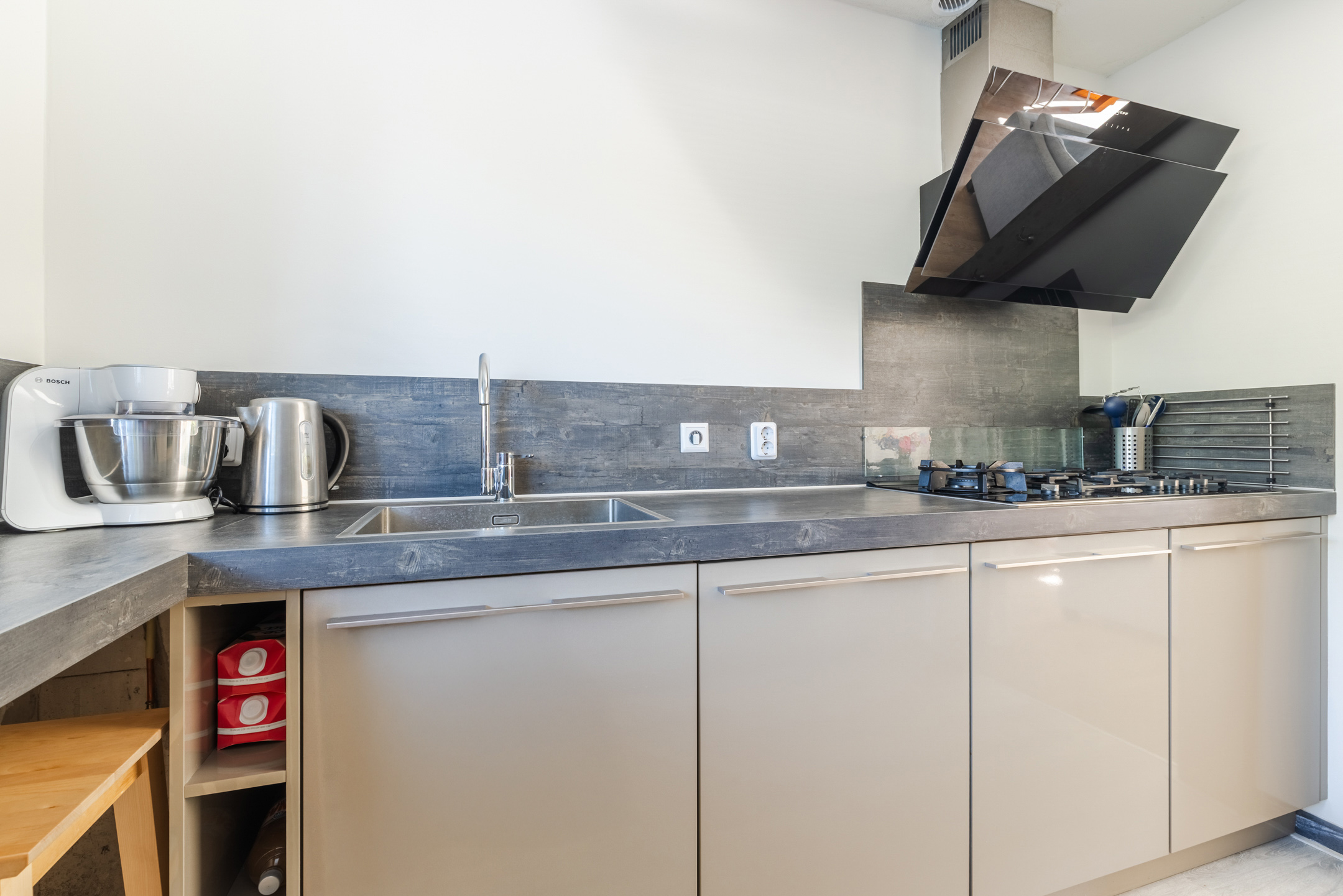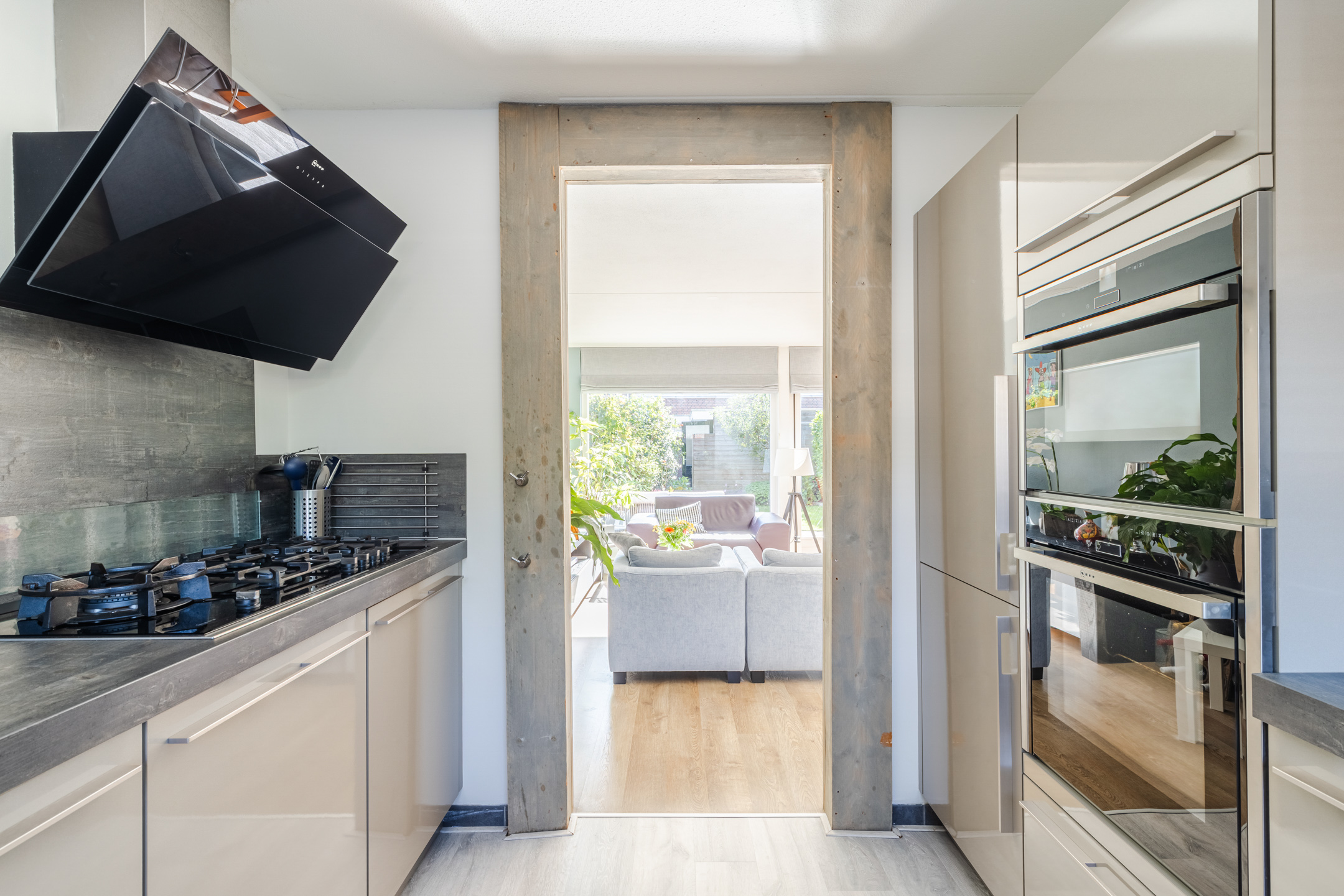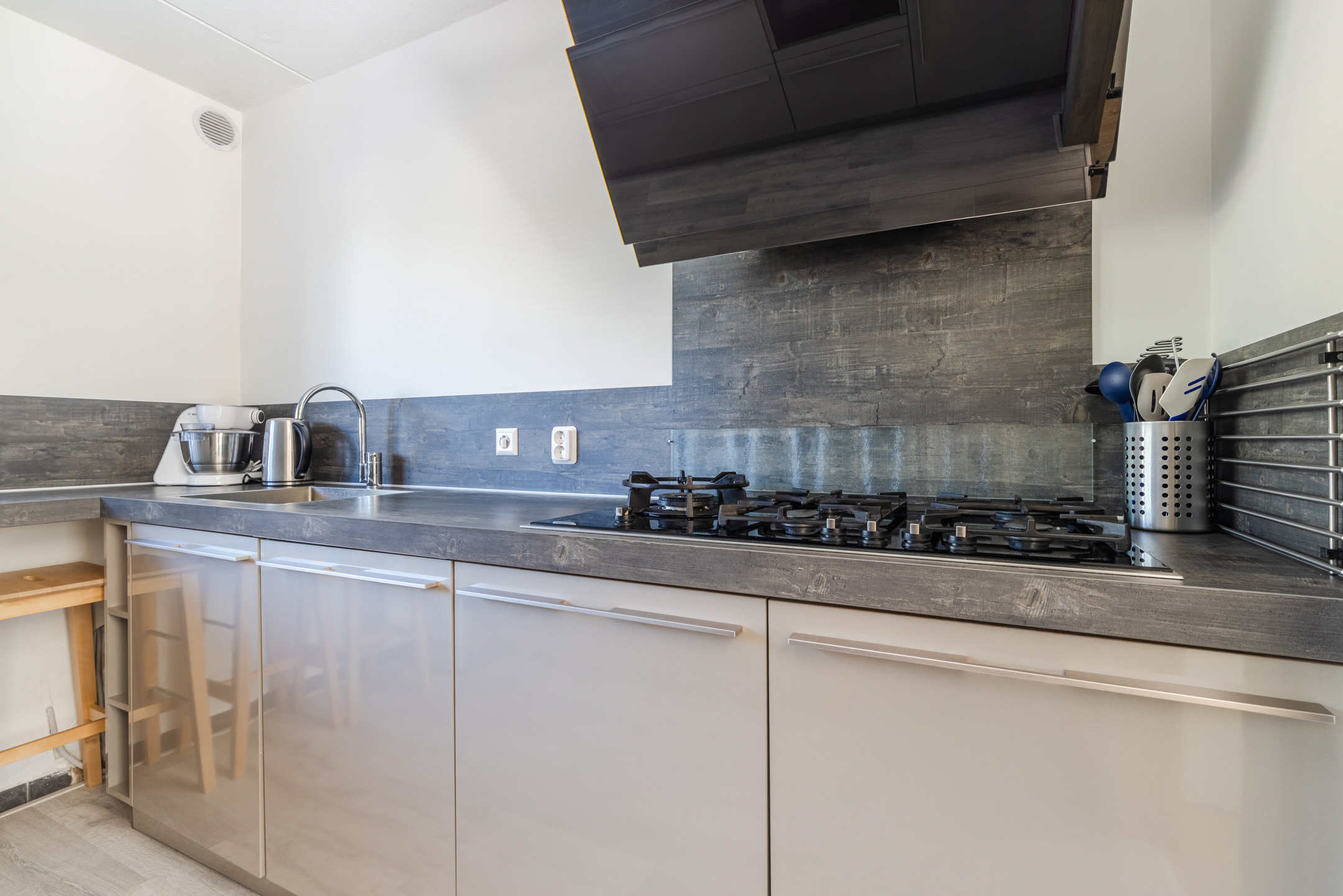 Aan de voorzijde bevindt zich de moderne keuken (geplaatst medio 2017). Deze stijlvolle, hoogglans keuken (ca. 3.02×2.71m) in taupe kleurstelling en kunststof aanrechtblad in houtlook, beschikt over alle nodige apparatuur (vijf-pits gasfornuis, moderne afzuigkap, oven en combi-oven, vaatwasser en koel-vriescombinatie). Door de slimme U-opstelling is er veel werkruimte en is er tevens de mogelijkheid om aan de bar, met uitzicht naar buiten, te genieten van een ontbijtje of een kopje koffie.