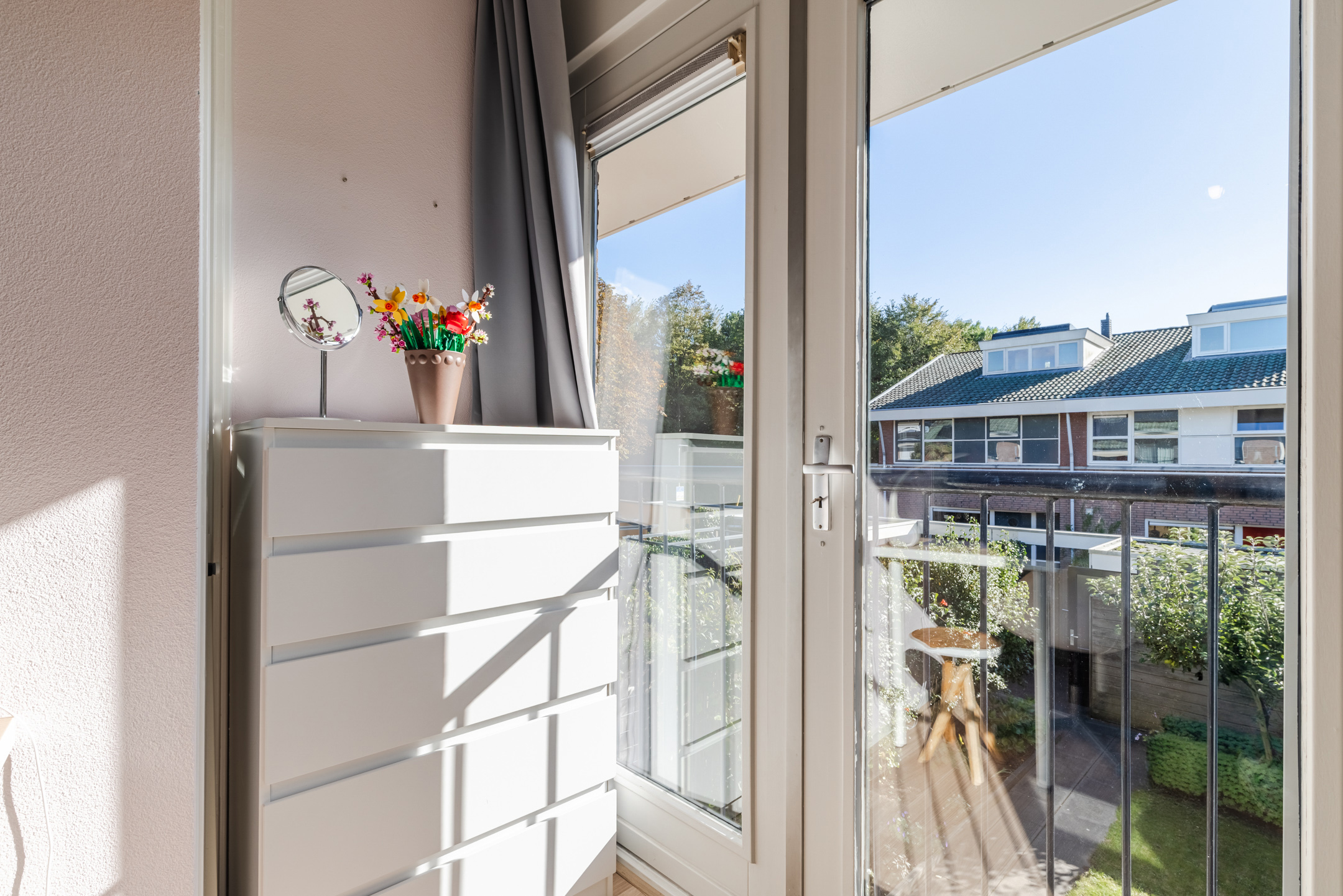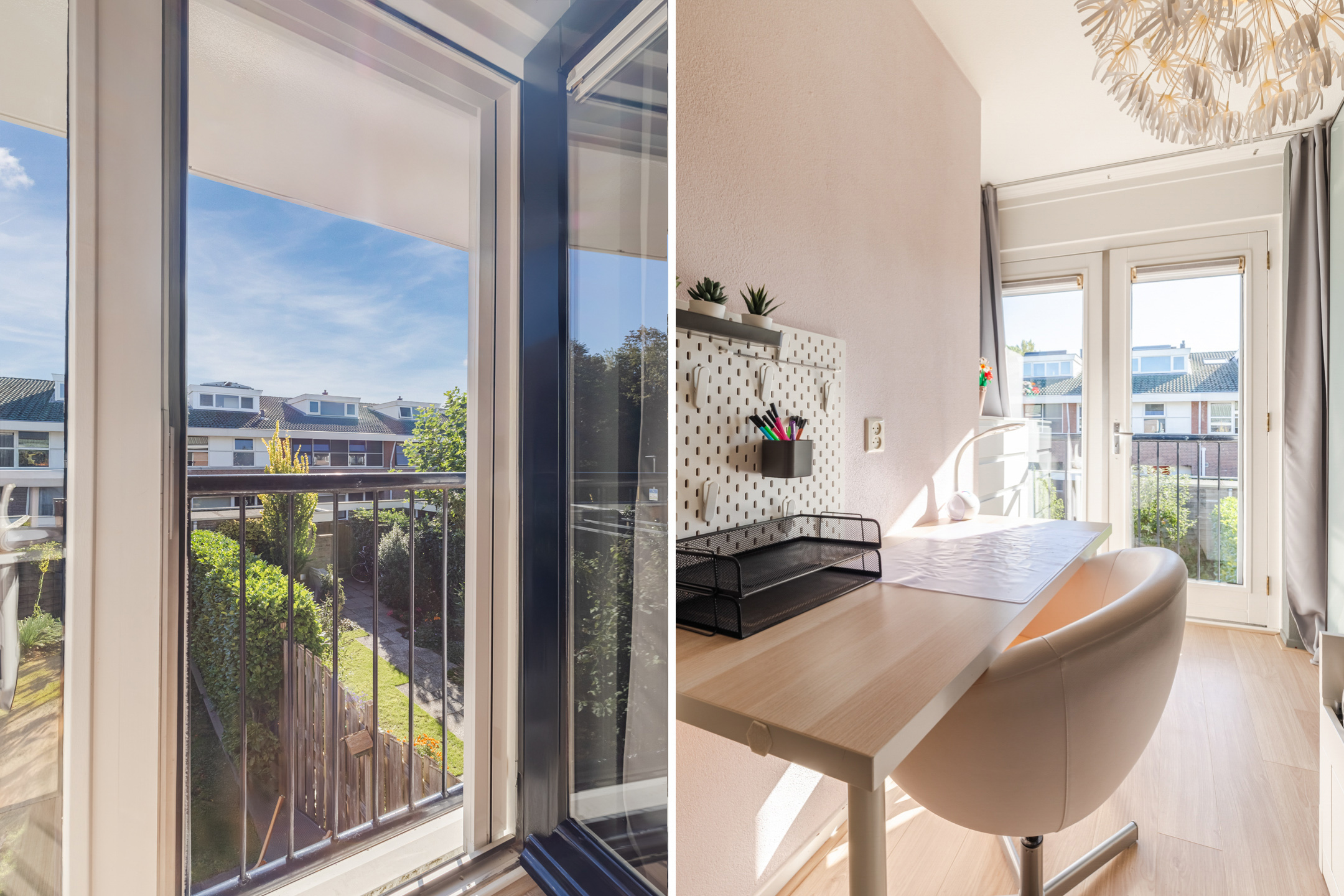 Aan de achterzijde bevindt zich de masterbedroom en een multifunctionele kamer die dienst kan doen als slaapkamer of werkkamer. Deze kamer (ca. 3.28×2.05m) beschikt over openslaande deuren met een frans balkon. Wat heerlijk om op zonnige dagen de deuren open te zetten en optimaal te genieten van het zicht op de tuin.