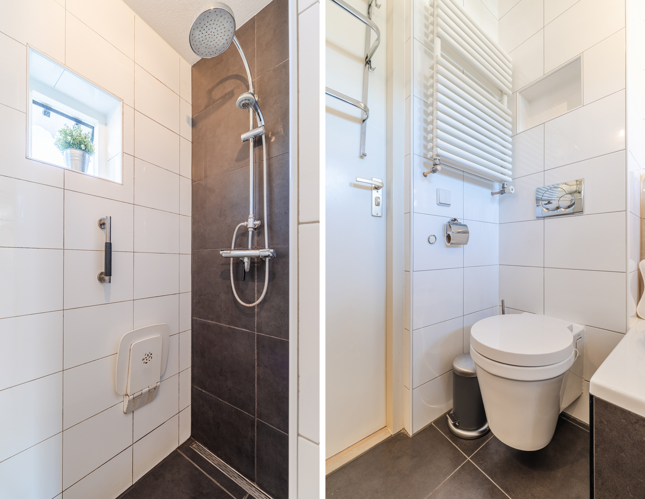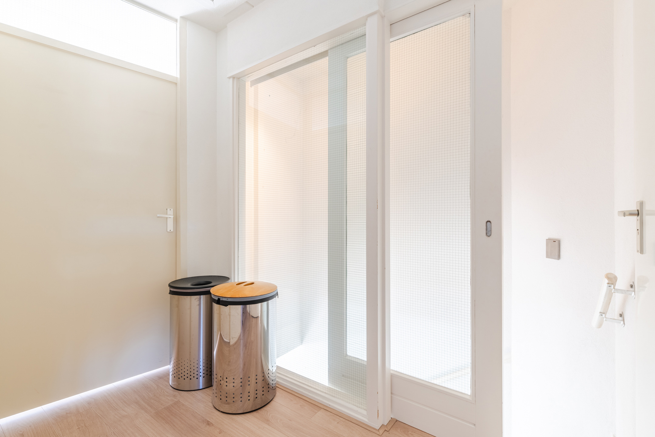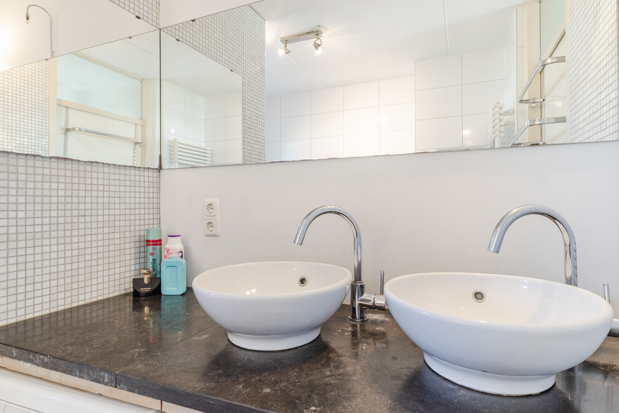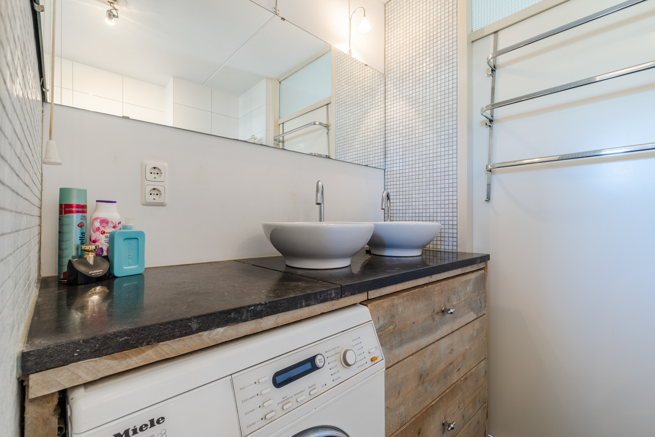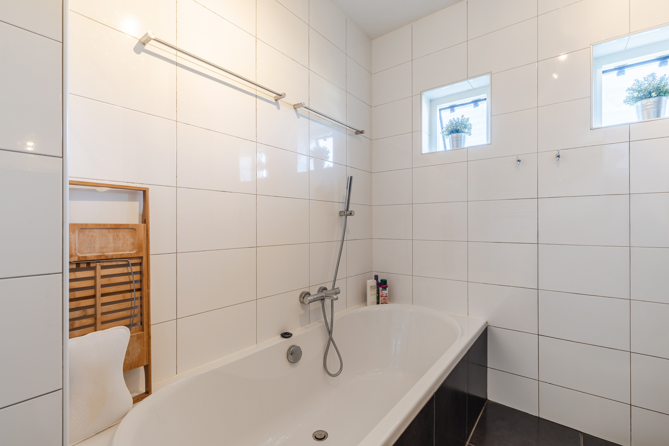 Aan de voorzijde van de woning bevindt zich een ruime slaapkamer (ca. 2.72×3.55m) met een groot raam. De naastgelegen badkamer (ca. 2.48×2.27m) is voorzien van een inloopdouche met regenfunctie, een bad en een extra breed wastafelmeubel met een dubbele wasbak en twee grote lades voor het opbergen van toiletartikelen. Daarnaast bevindt zich in de badkamer de aansluiting voor de wasmachine. De twee kleine raampjes zorgen voor fijne lichtinval en natuurlijke ventilatie.