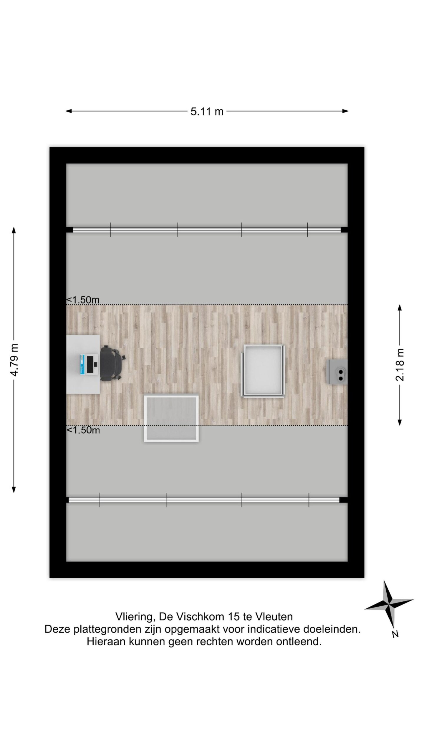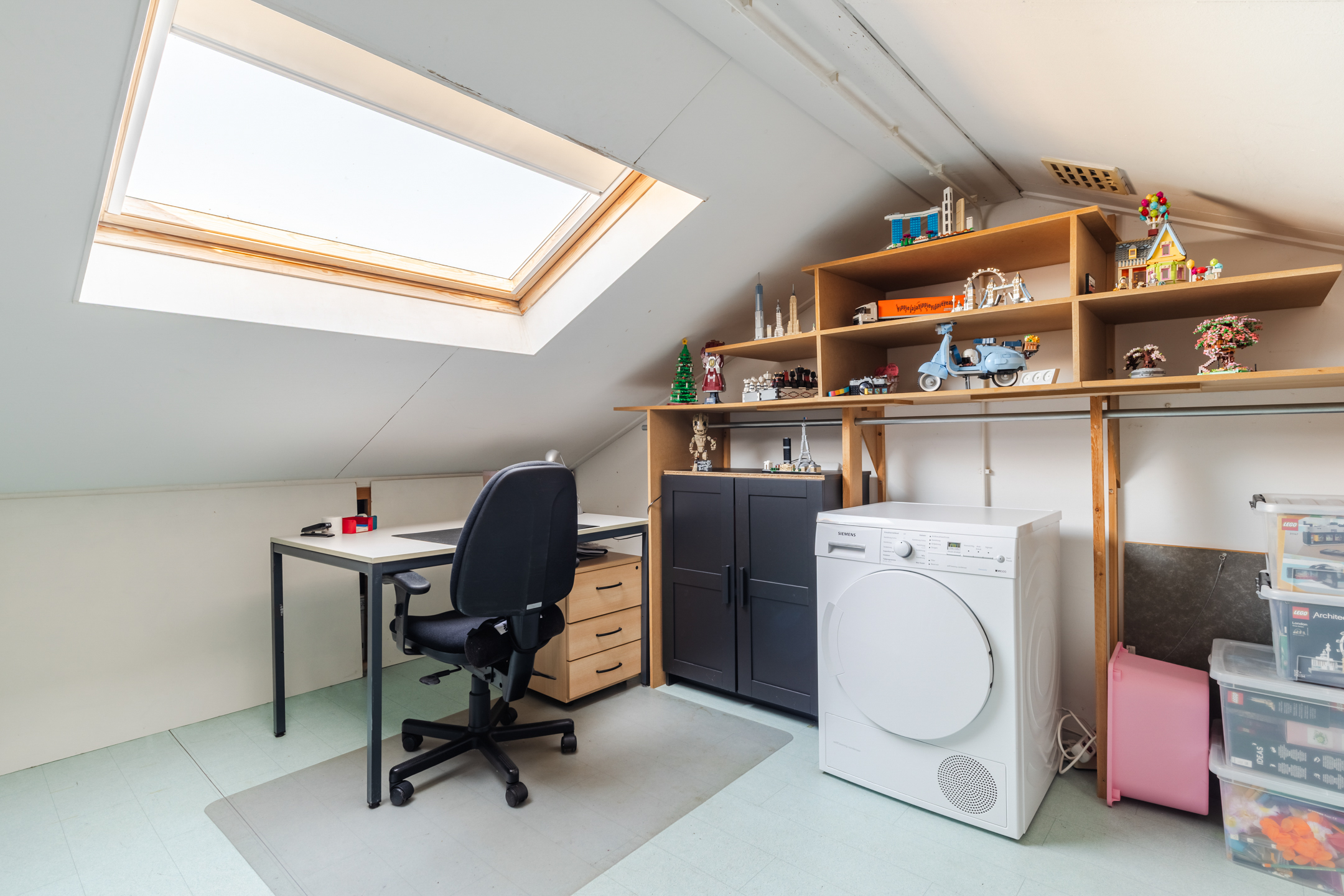 Via een vlizotrap is de ruime vliering van ca. 11m2 te bereiken. Met een nokhoogte van 1.95m is deze vliering heel goed te gebruiken als extra leefruimte. Zo heeft deze ruimte jaren dienstgedaan als speelkamer voor de kinderen en dient het nu als werkplek. Door het grote dakraam komt er voldoende licht binnen. Daarnaast staat hier de droger opgesteld en bevinden zich hier de zonneboiler en de cv-ketel. Tevens staat hier het opvangvat opgesteld van het Amerikaans stofzuigersysteem dat de begane grond moeiteloos zonder losse stofzuiger, door alleen een slang aan te sluiten kan stofzuigen. Achter de knieschotten is er veel ruimte voor het opbergen van spullen.