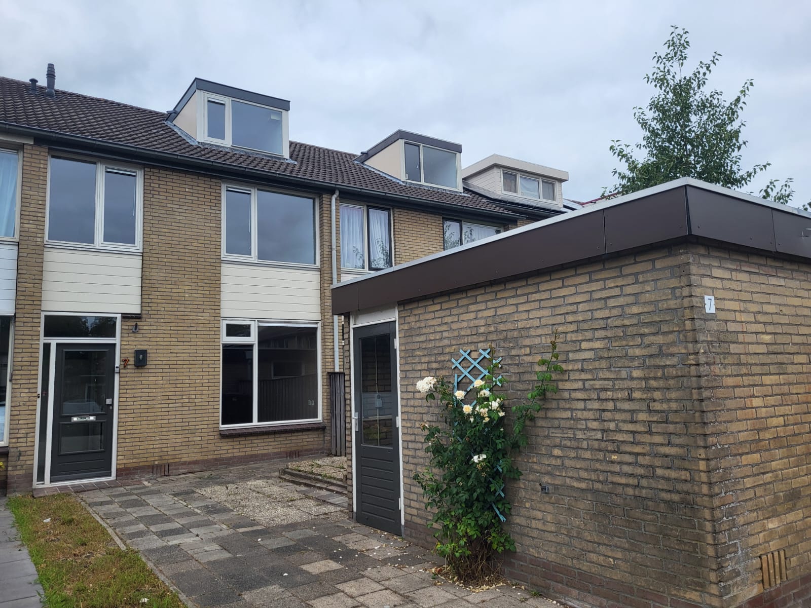 De achtertuin zelf is ruim en betegeld, wat het onderhoud eenvoudig maakt. In de voortuin bevindt zich een losstaande stenen berging, perfect voor het stallen van de fietsen, gereedschap, tuinmeubilair of andere spullen die je graag netjes uit het zicht houdt.