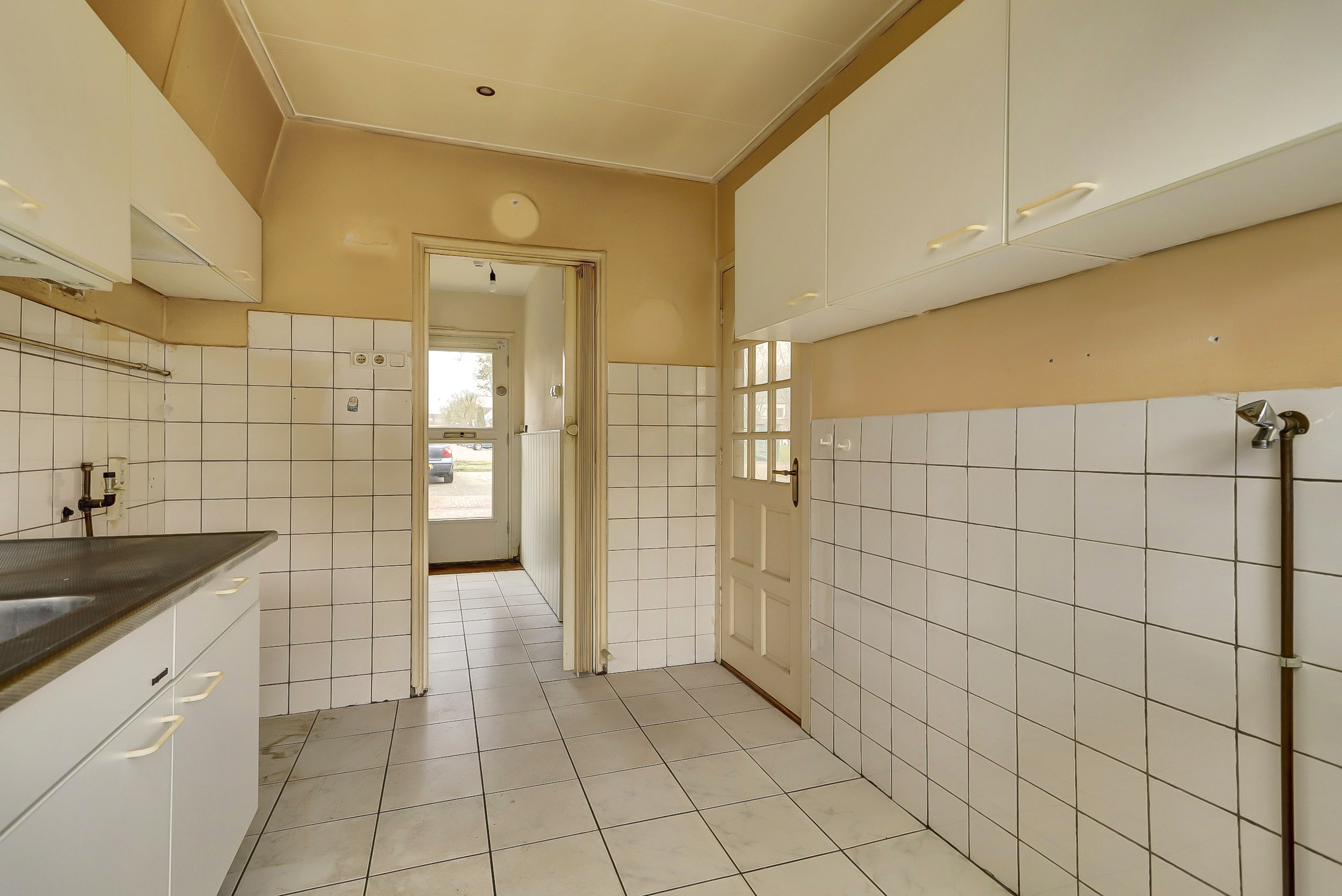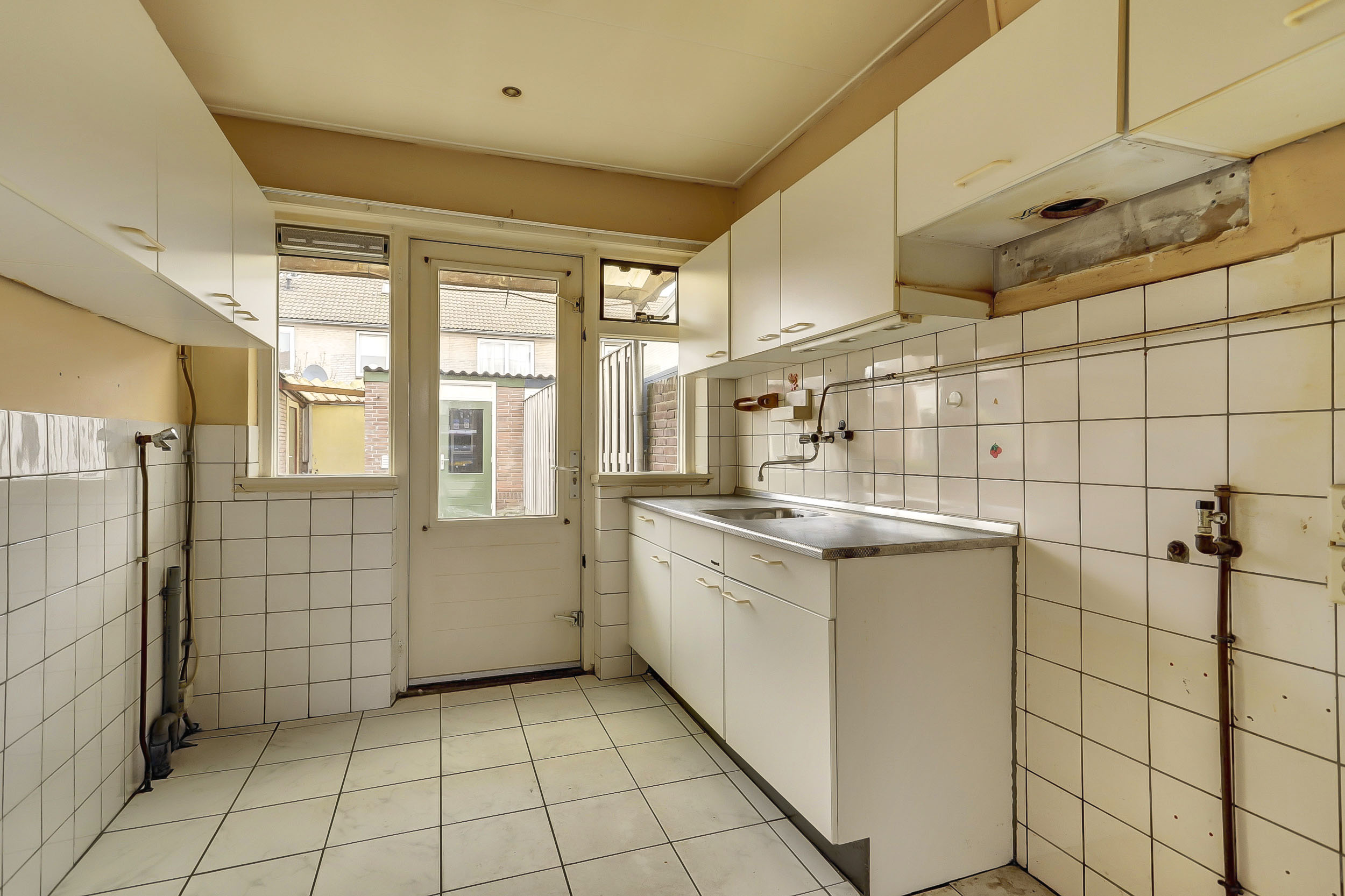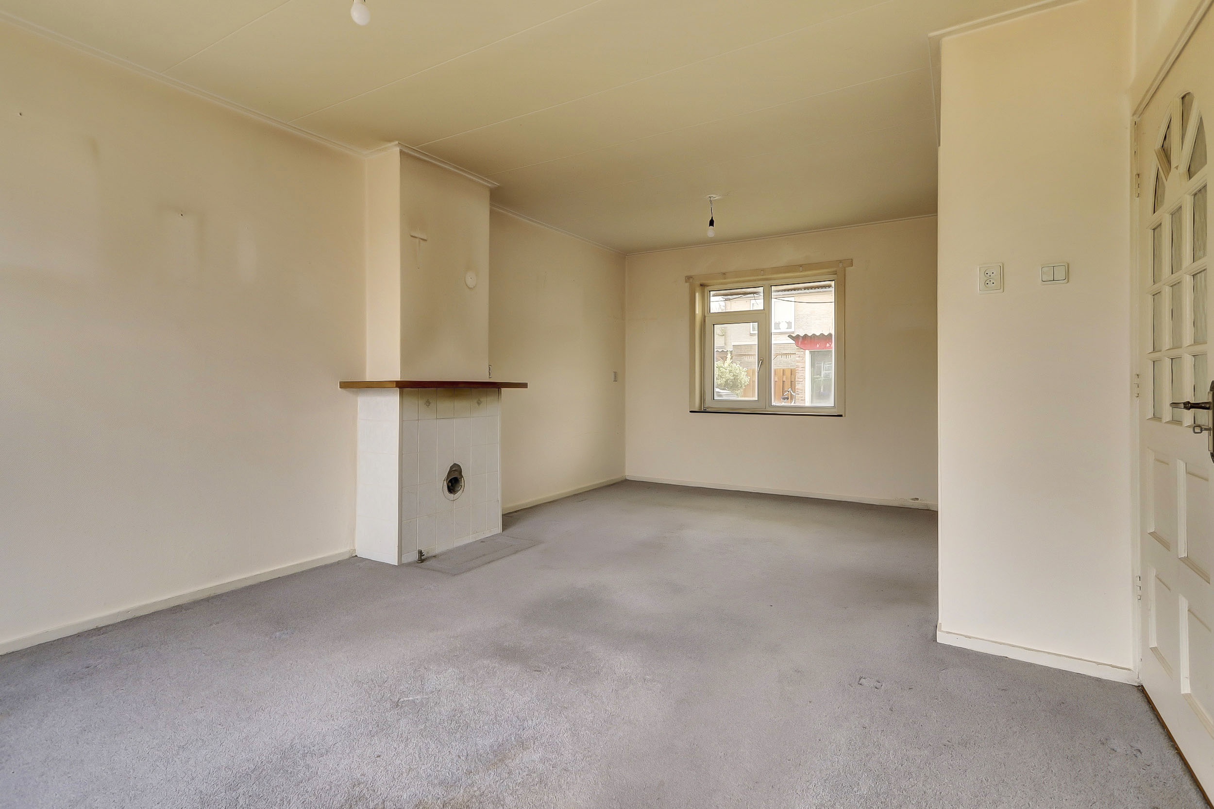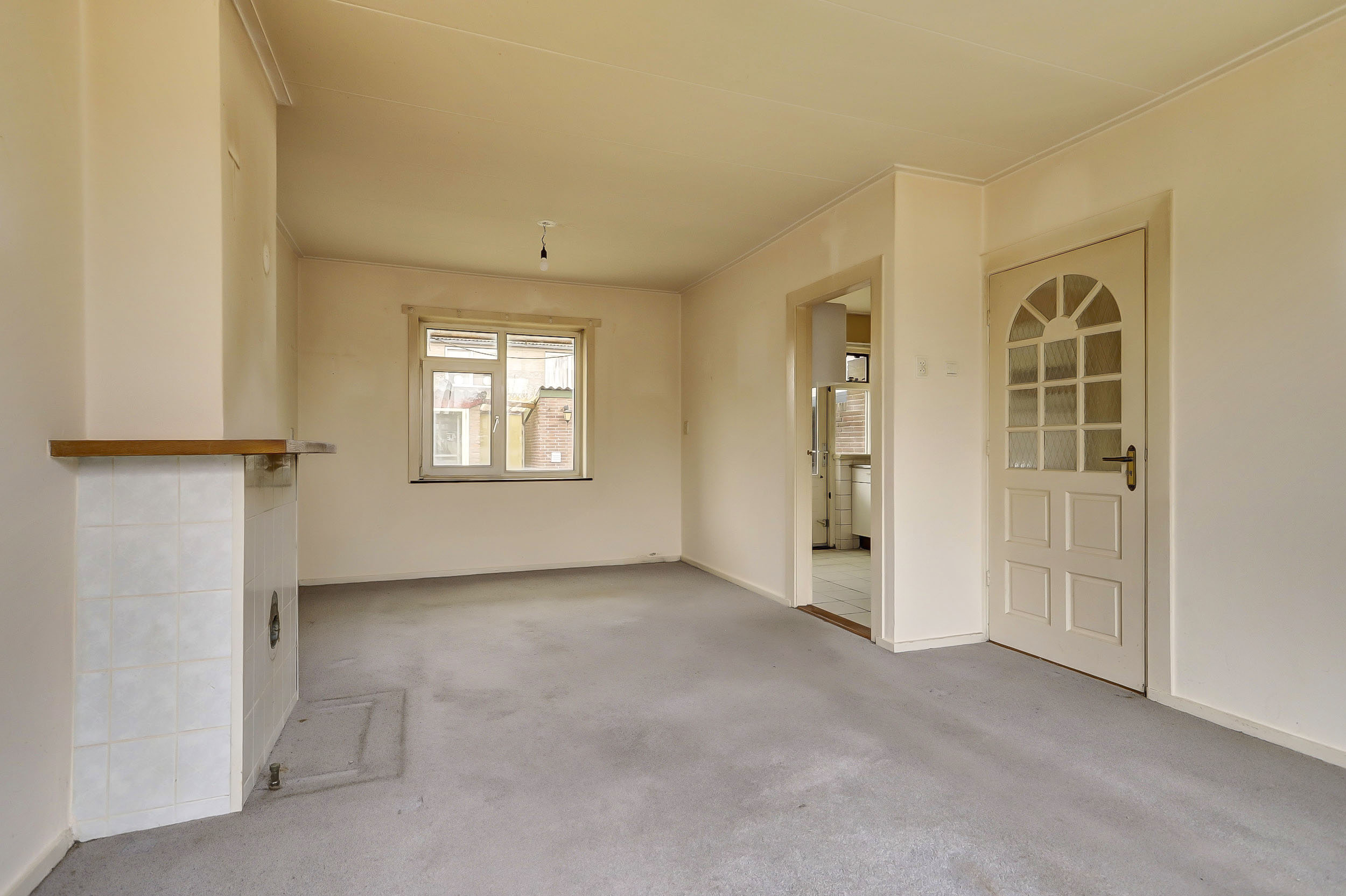 Begane grond: Karakteristieke entree met trapopgang, toilet, trapkast, meterkast en doorgang naar de keuken en woonkamer. De doorzonwoonkamer biedt een mooi uitzicht op zowel de voor- als achtertuin. De keuken aan de achterzijde van de woning geeft toegang tot de achtertuin. Deze eenvoudige keuken beschikt over water-, gas- en elektra-aansluitingen.