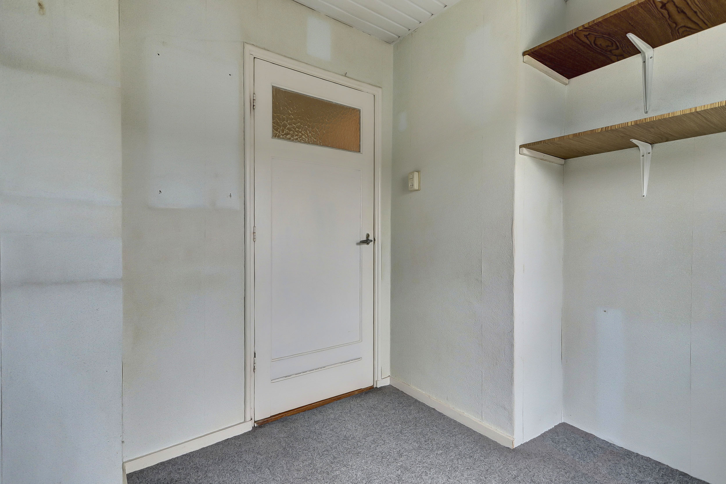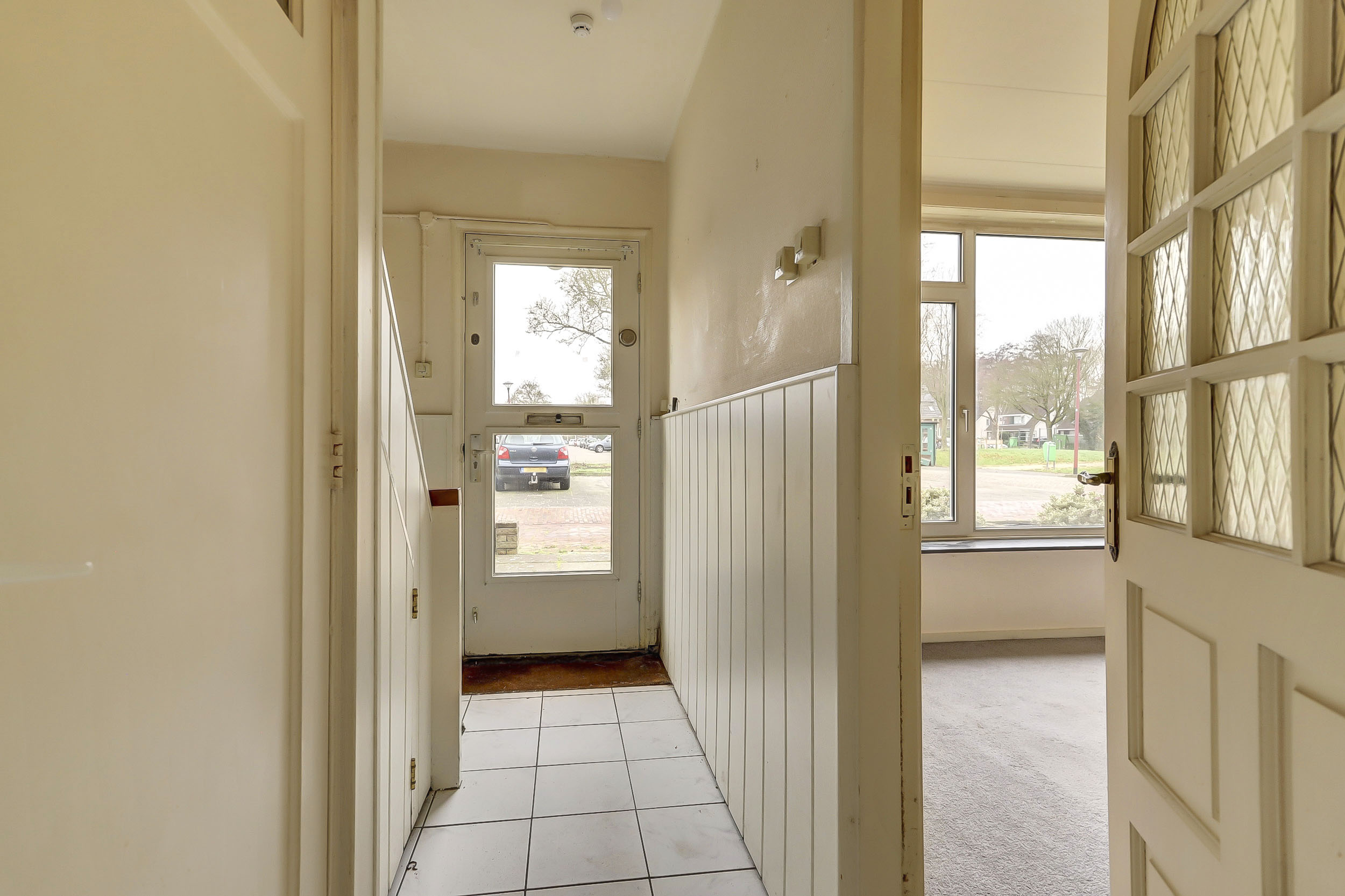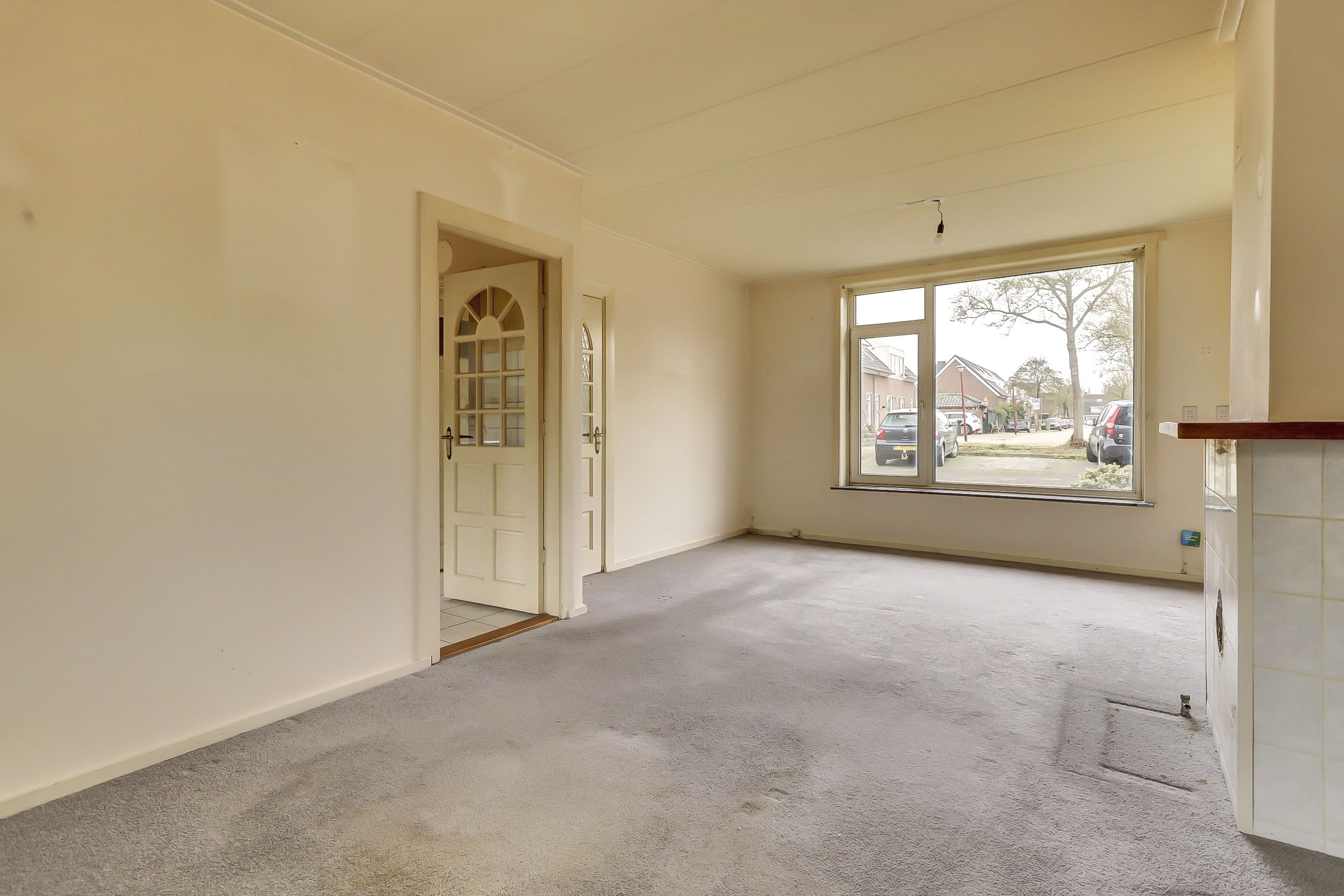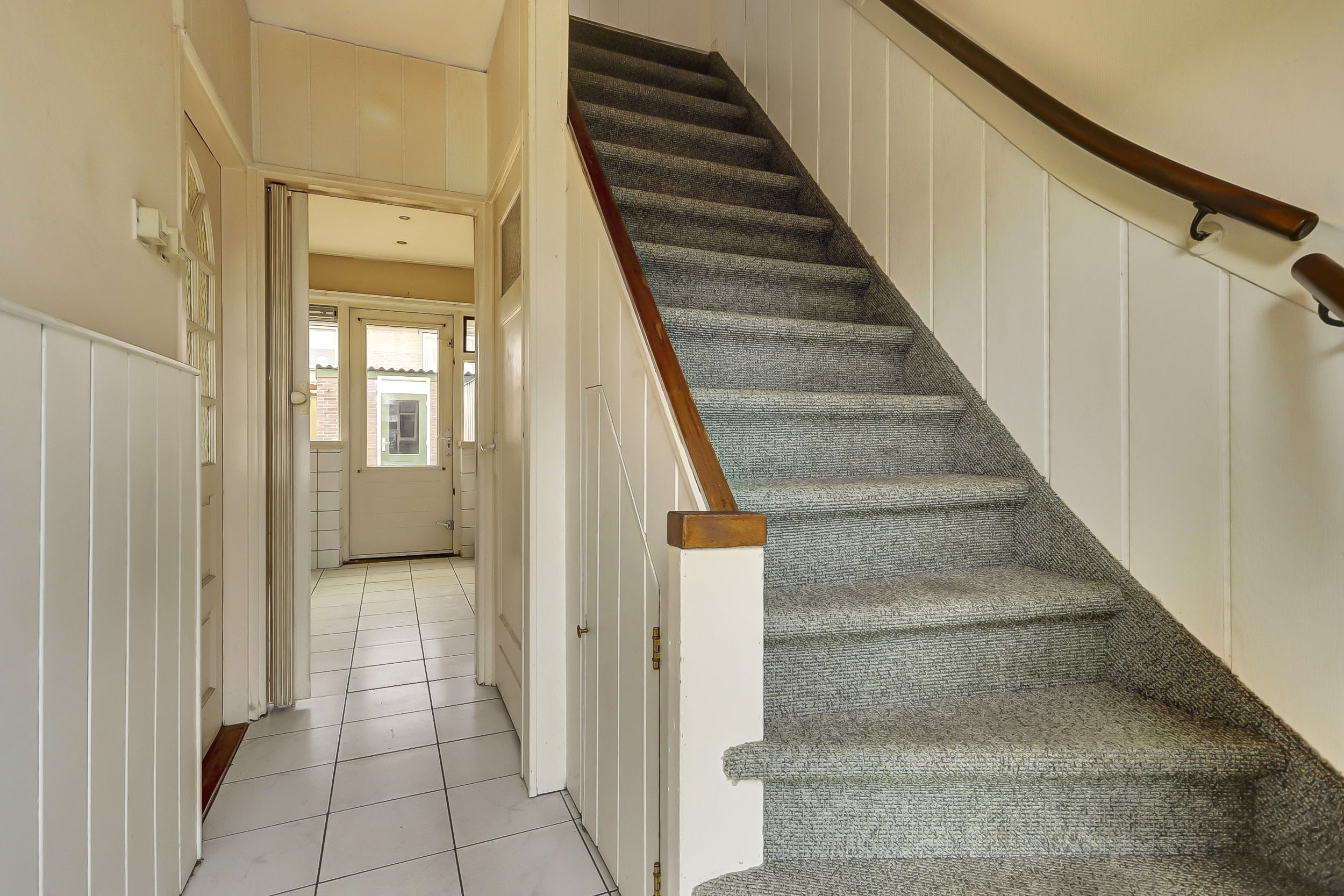 Begane grond: Karakteristieke entree met trapopgang, toilet, trapkast, meterkast en doorgang naar de keuken en woonkamer. De doorzonwoonkamer biedt een mooi uitzicht op zowel de voor- als achtertuin. De keuken aan de achterzijde van de woning geeft toegang tot de achtertuin. Deze eenvoudige keuken beschikt over water-, gas- en elektra-aansluitingen.