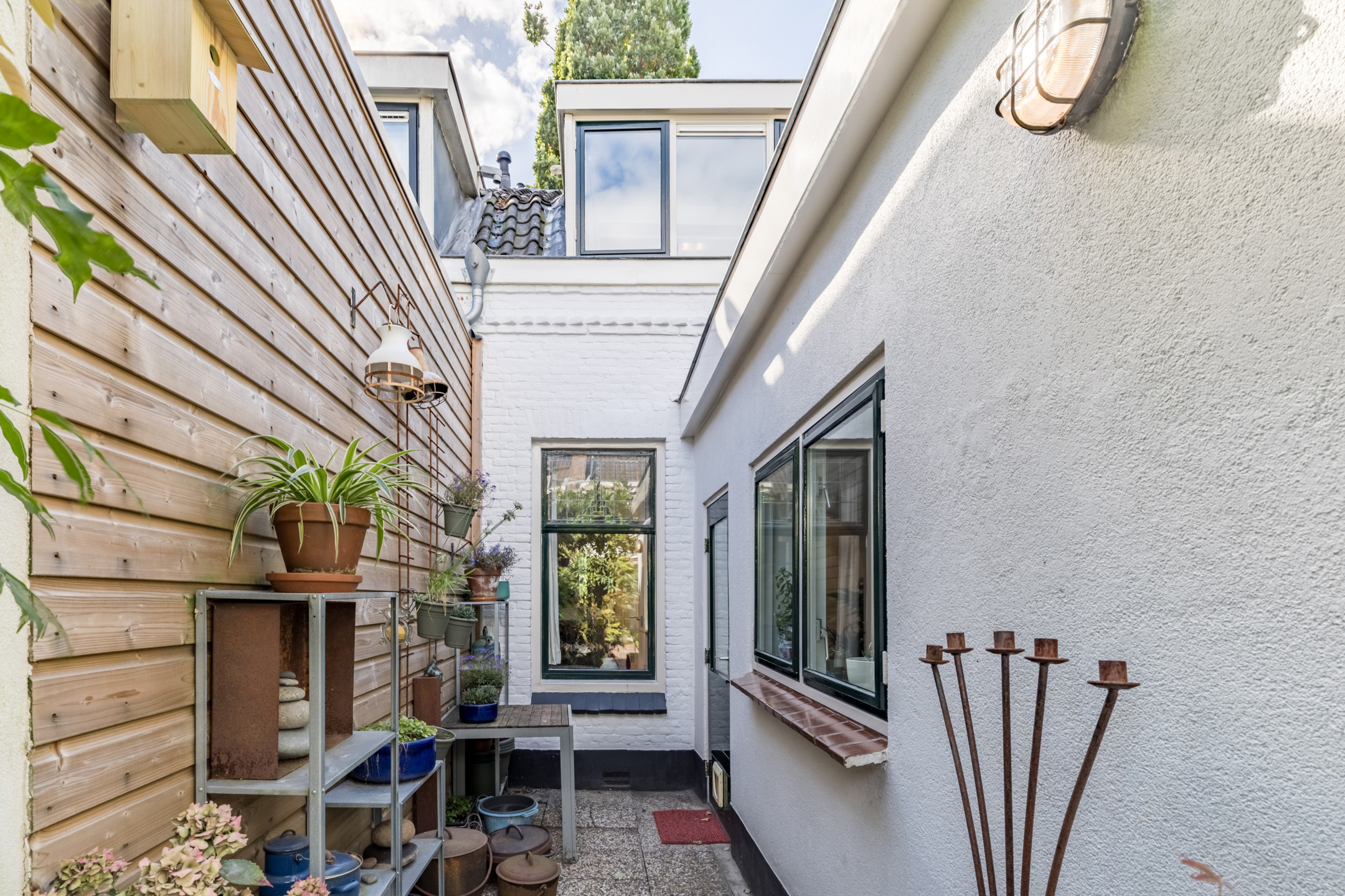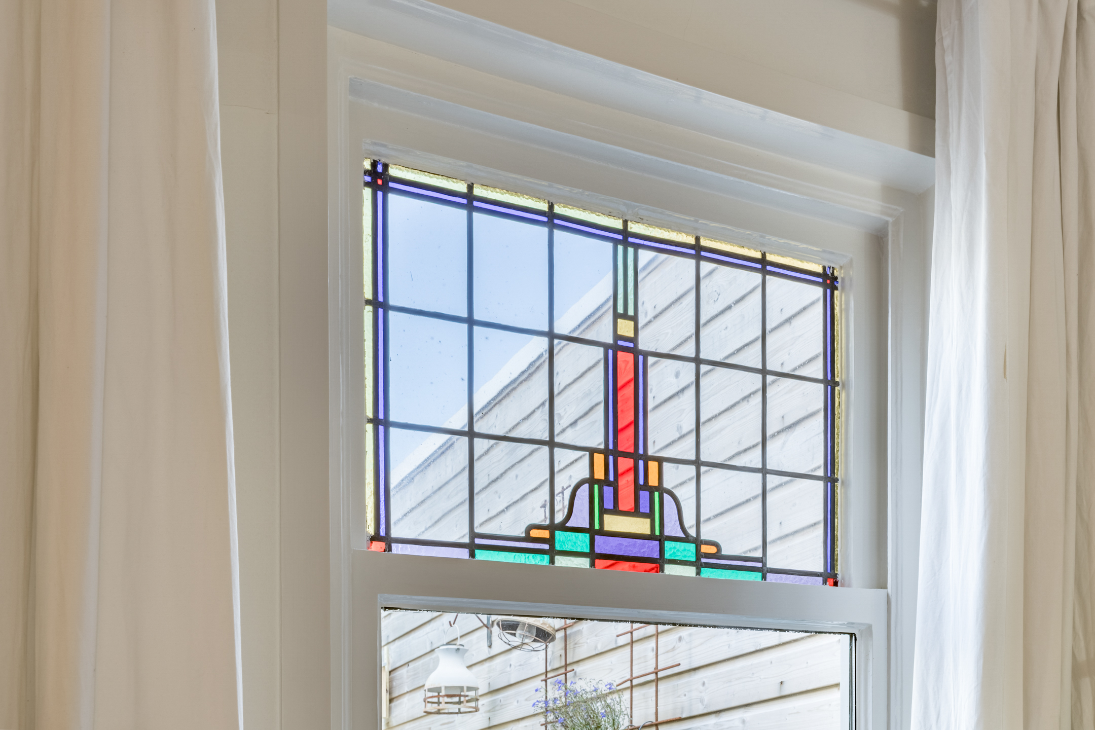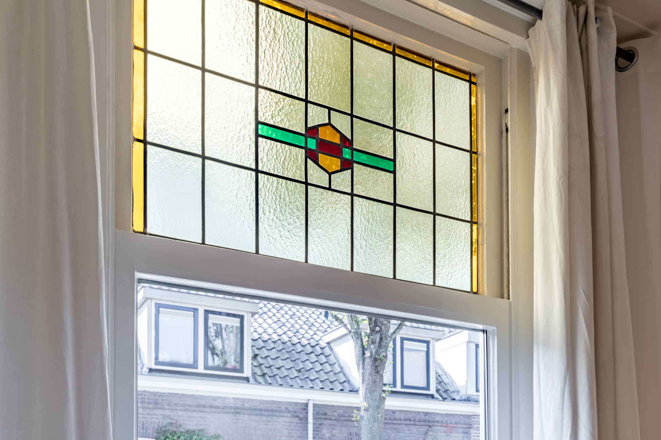 De zithoek aan de achterzijde van de woning ligt aan de rustige tuinkant. Wat direct opvalt is het mooie, authentieke glas in lood raam. De heldere kleuren en de mooie tekening (zou het De Dom zijn?) herinneren je iedere dag weer aan de geschiedenis die in deze woning huist.