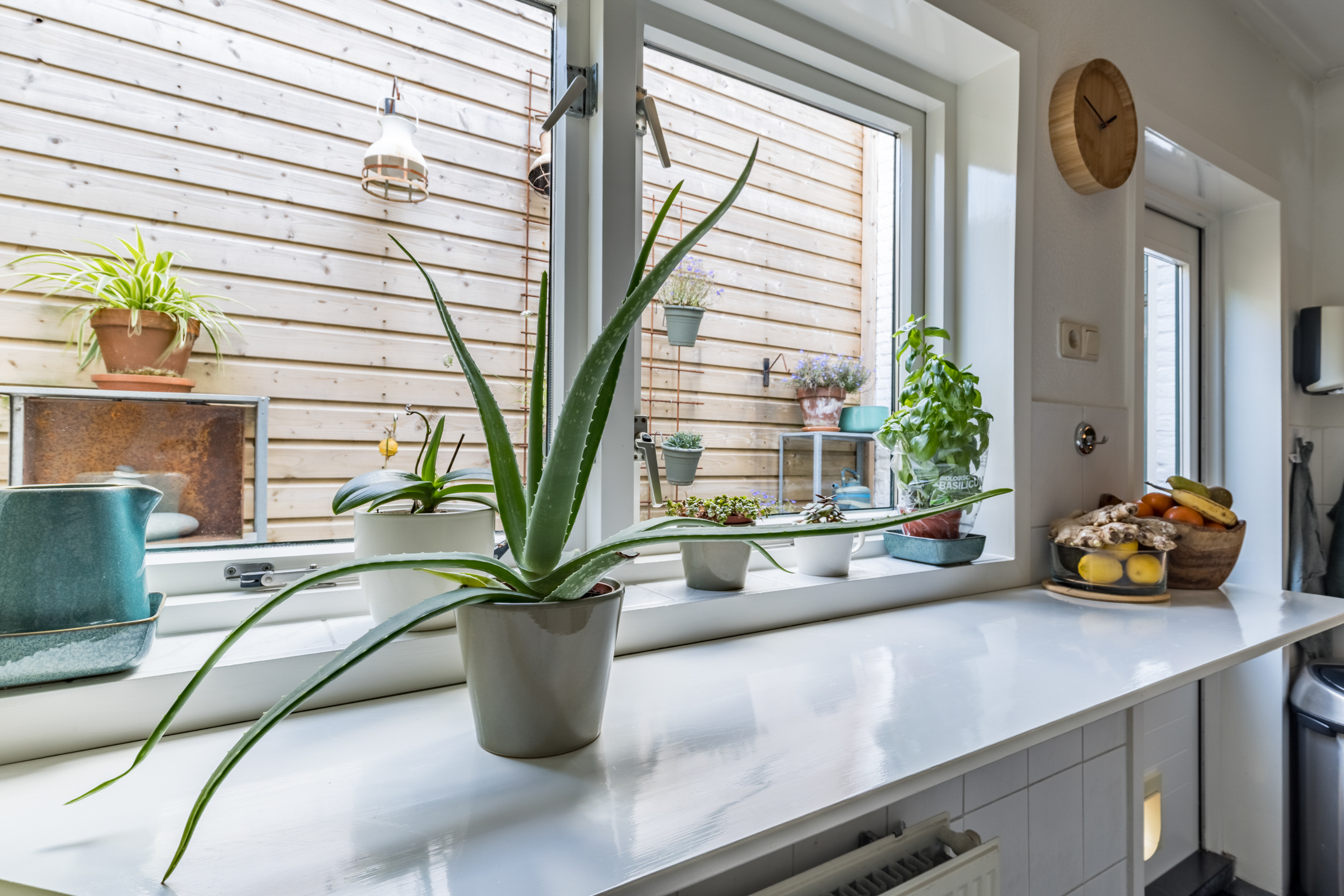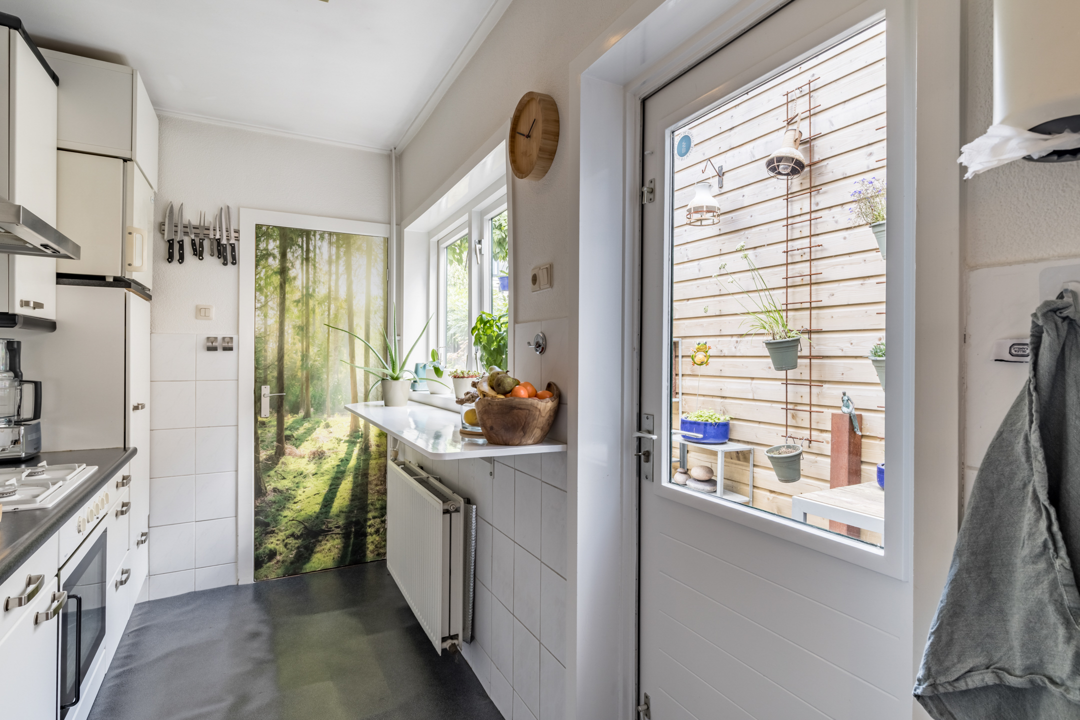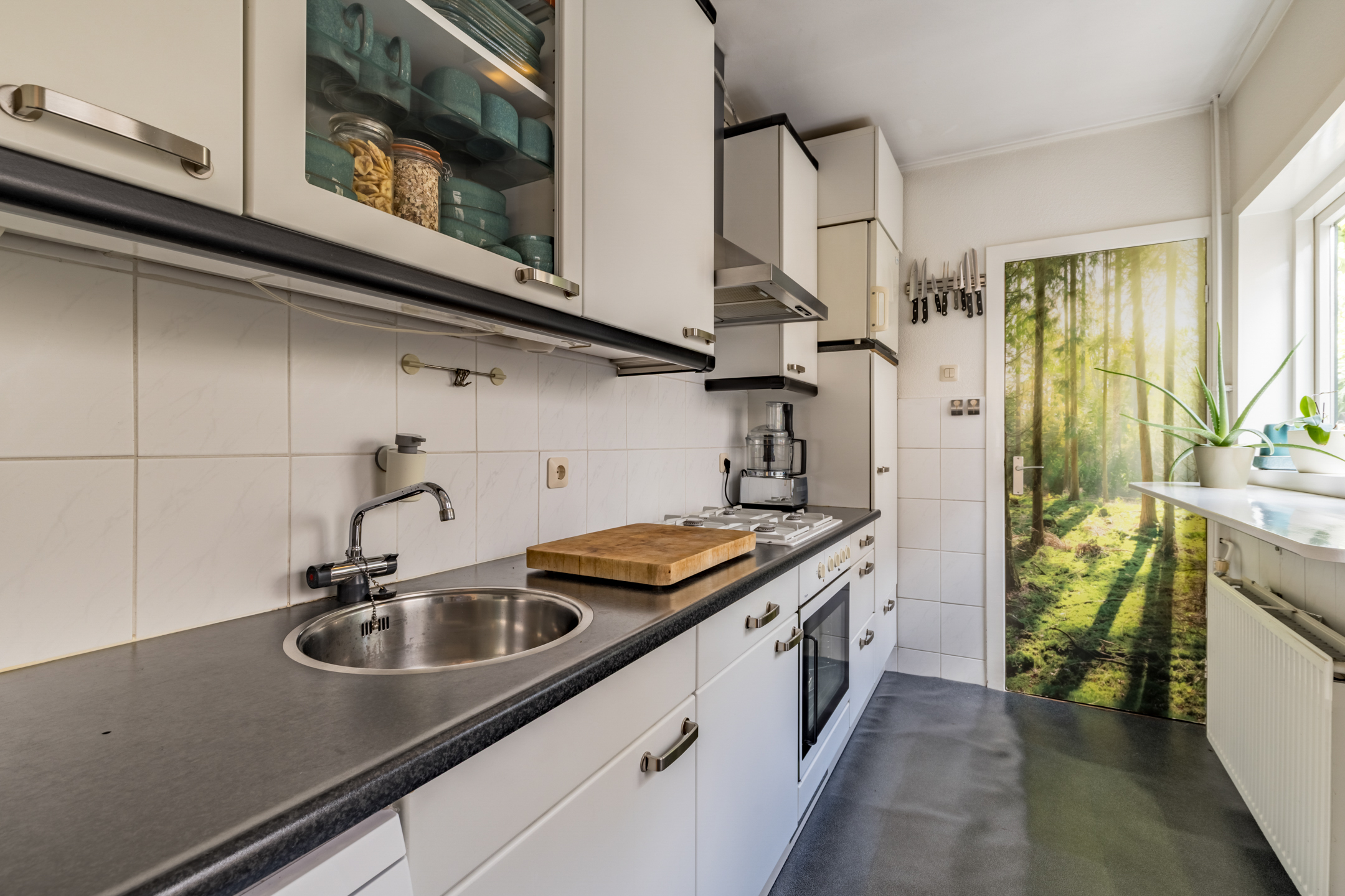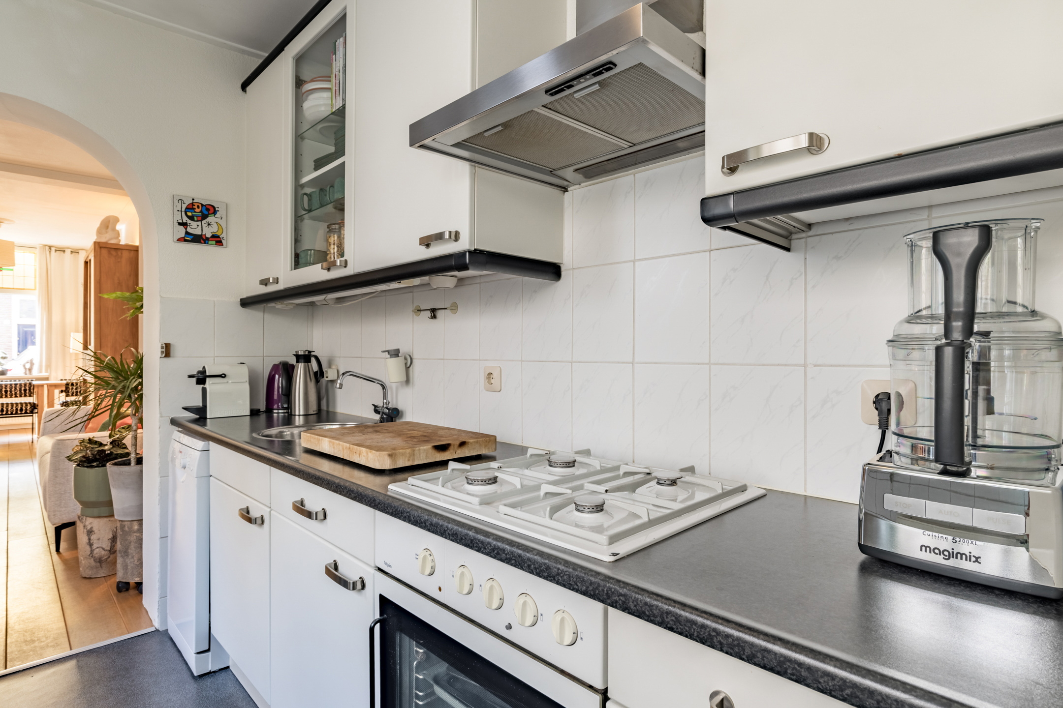 De eenvoudige, nette keuken (ca. 6,3m2) aan de achterzijde van de woning is uitgevoerd in een witte kleurstelling met een antraciet keukenblad. De keuken beschikt over een vier-pits gasfornuis, inbouwkoelkast en losse vaatwasser. De inbouw oven zal vernieuwd moeten worden. Daarnaast is er een kleine boiler onder de kraan geplaatst, zodat er snel beschikking is over warm water. De grote ramen in de keuken zorgen voor lekker veel lichtinval. Vóór het raam is een gezellig barretje geplaatst. Een plek die je kan gebruiken voor extra werkruimte, maar waar je ook even heerlijk een kopje koffie aan kan drinken.