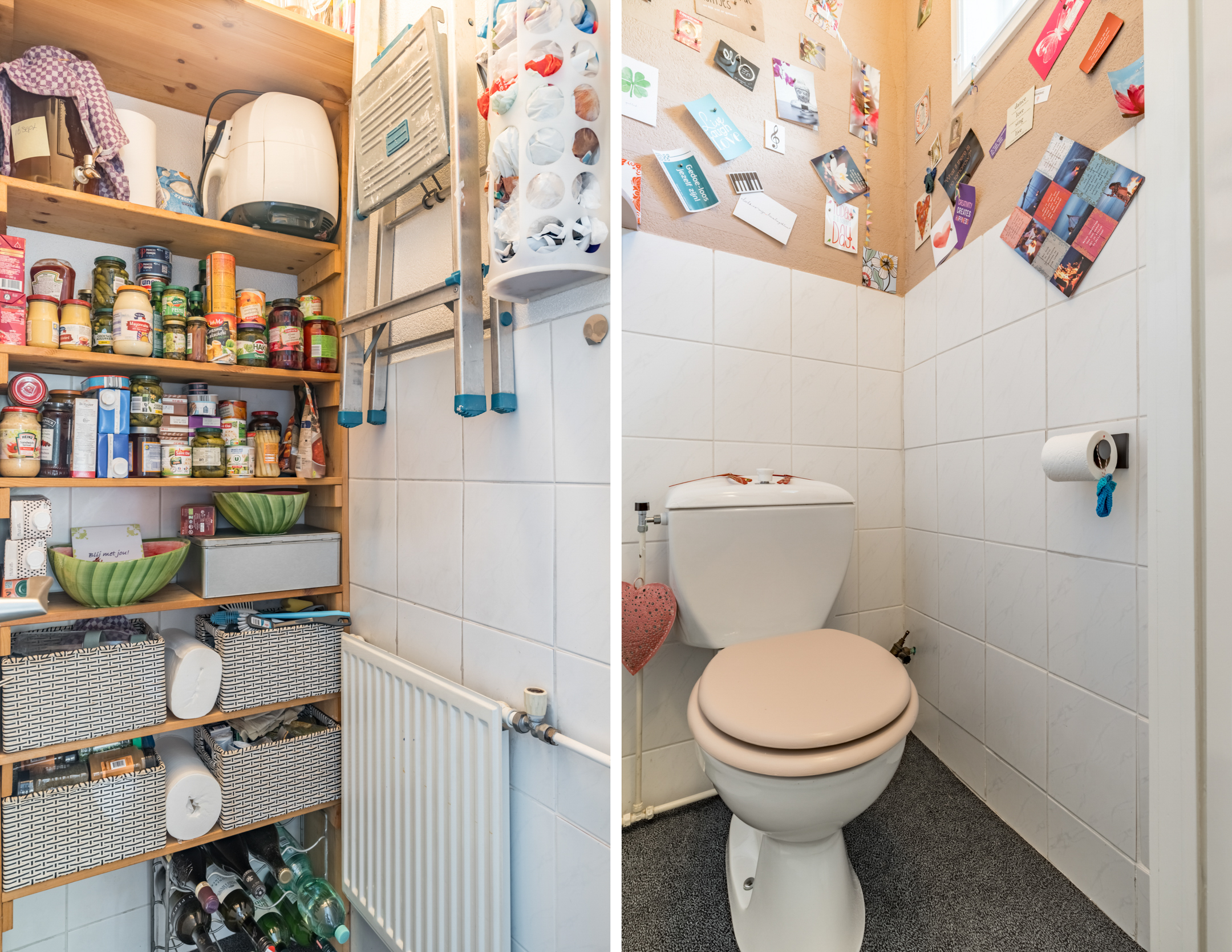 De deur aan de achterzijde van de keuken geeft toegang tot een praktische, ruime bergkast met planken voor het opbergen van alle voorraad en het toilet met bovenraampje.