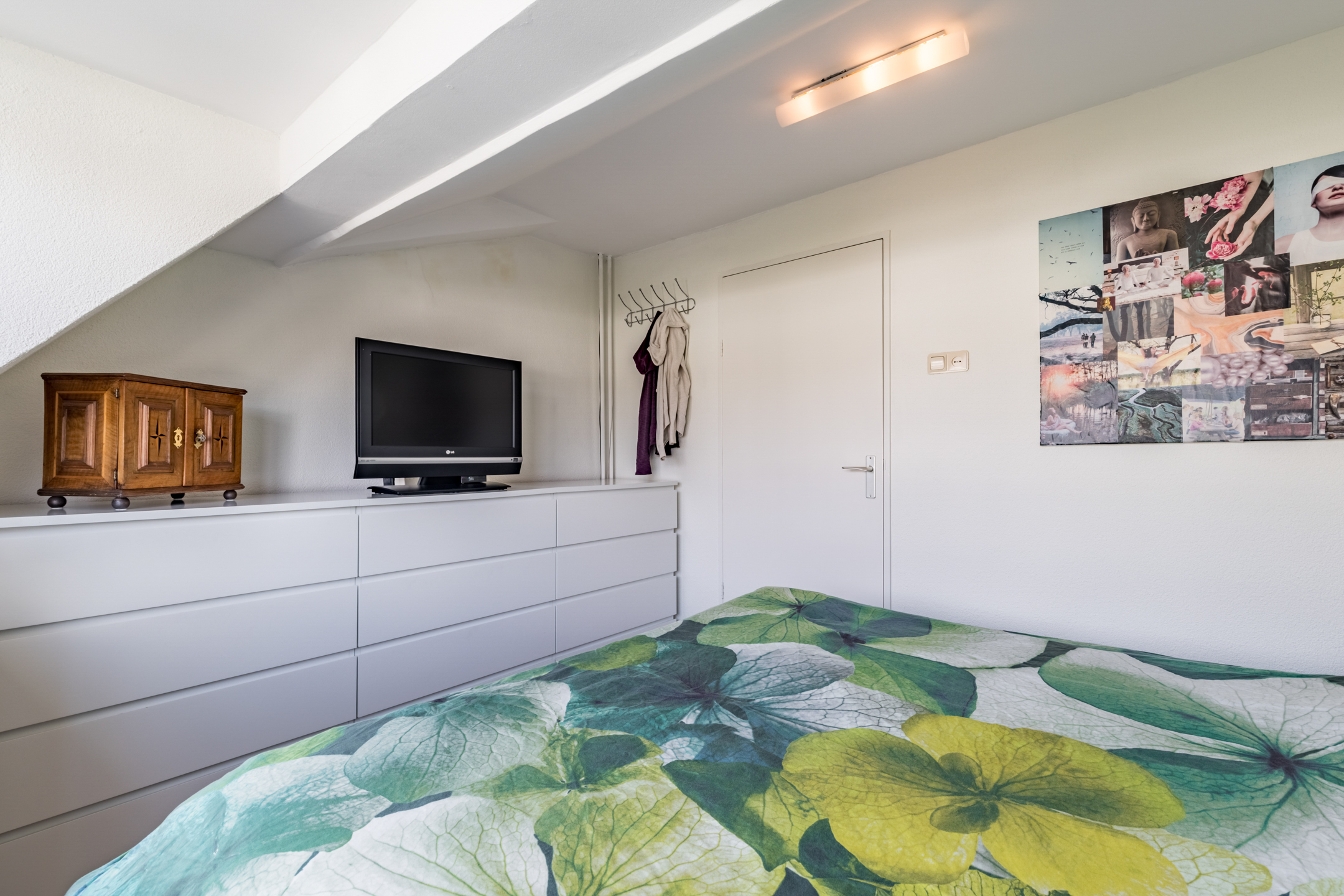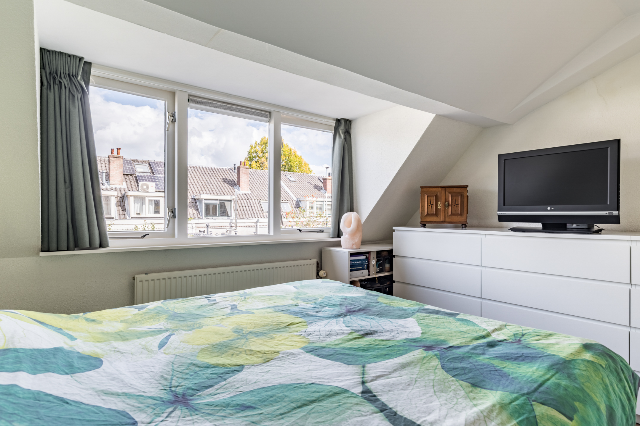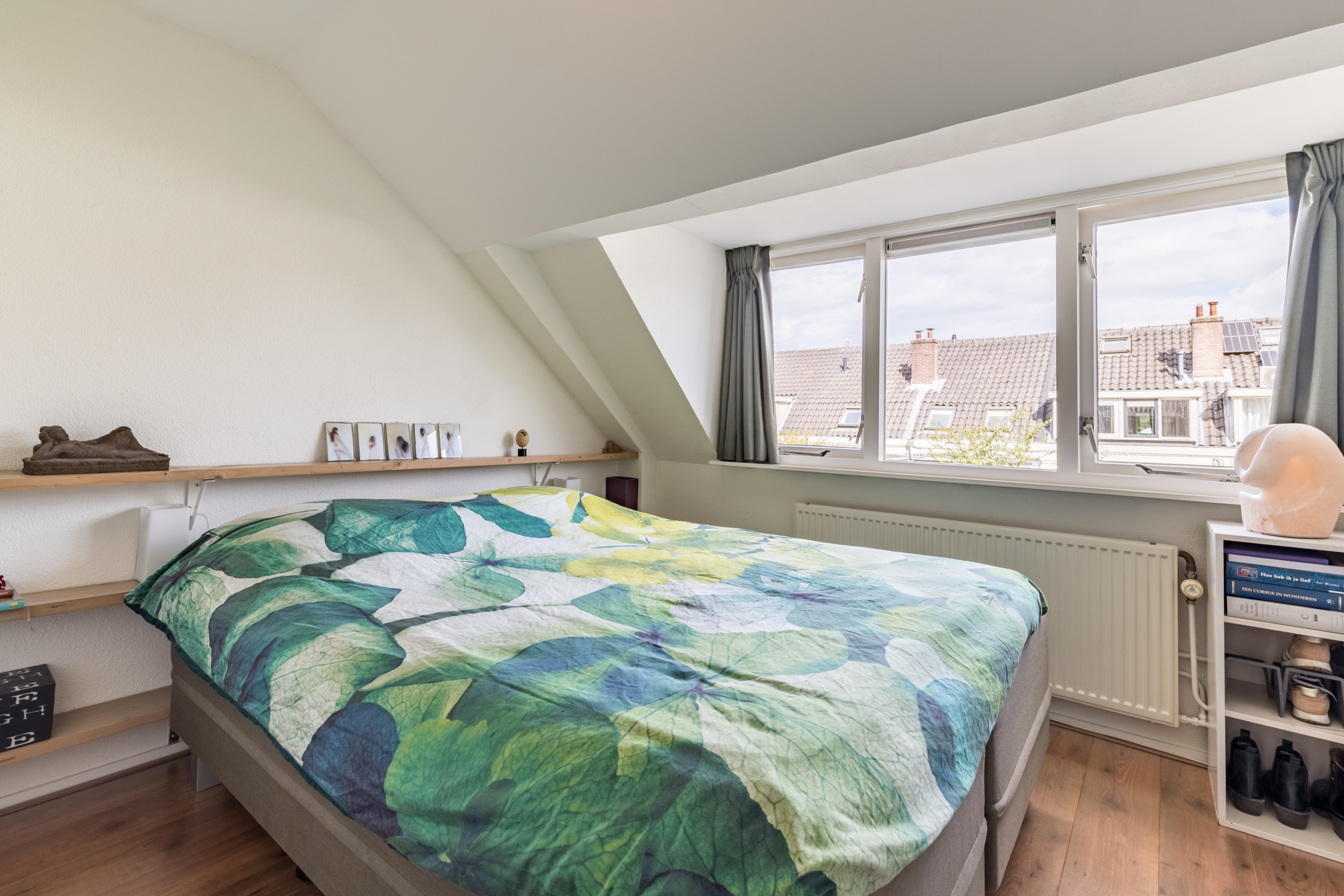 Aan de voorzijde van de woning is de grote slaapkamer te vinden (ca. 10m2). Ook hier zorgt de dakkapel weer voor een zee aan licht en ruimte. Door de ligging aan de achterkant is het een heerlijk rustige plek om te slapen, met zicht op de tuinen van de omliggende huizen.