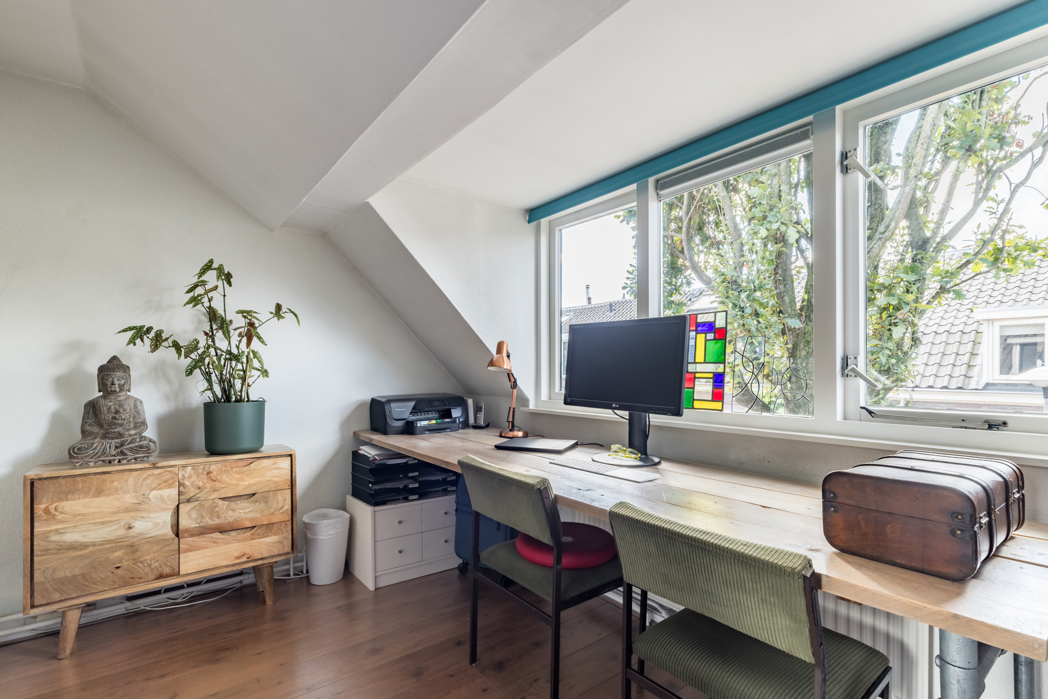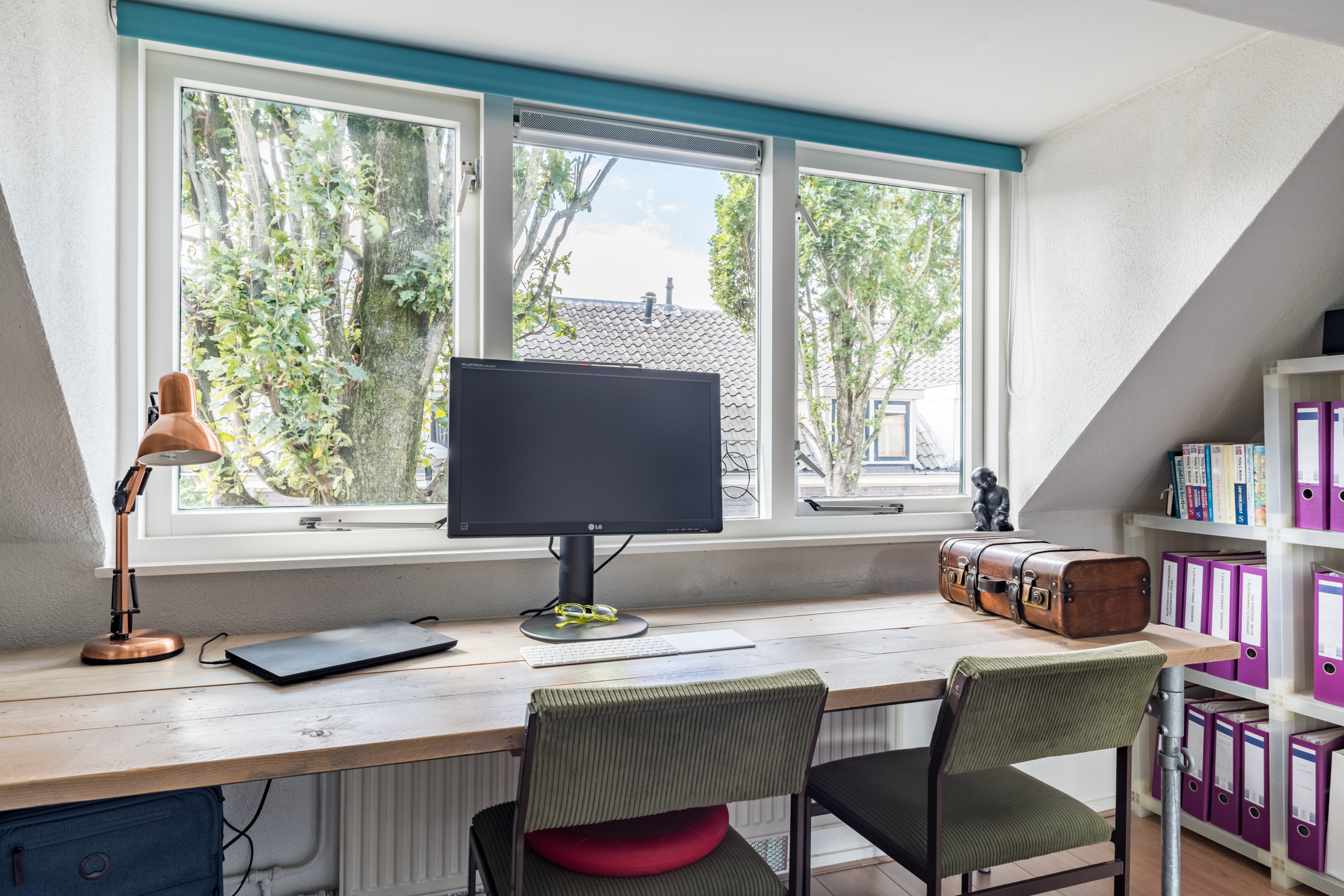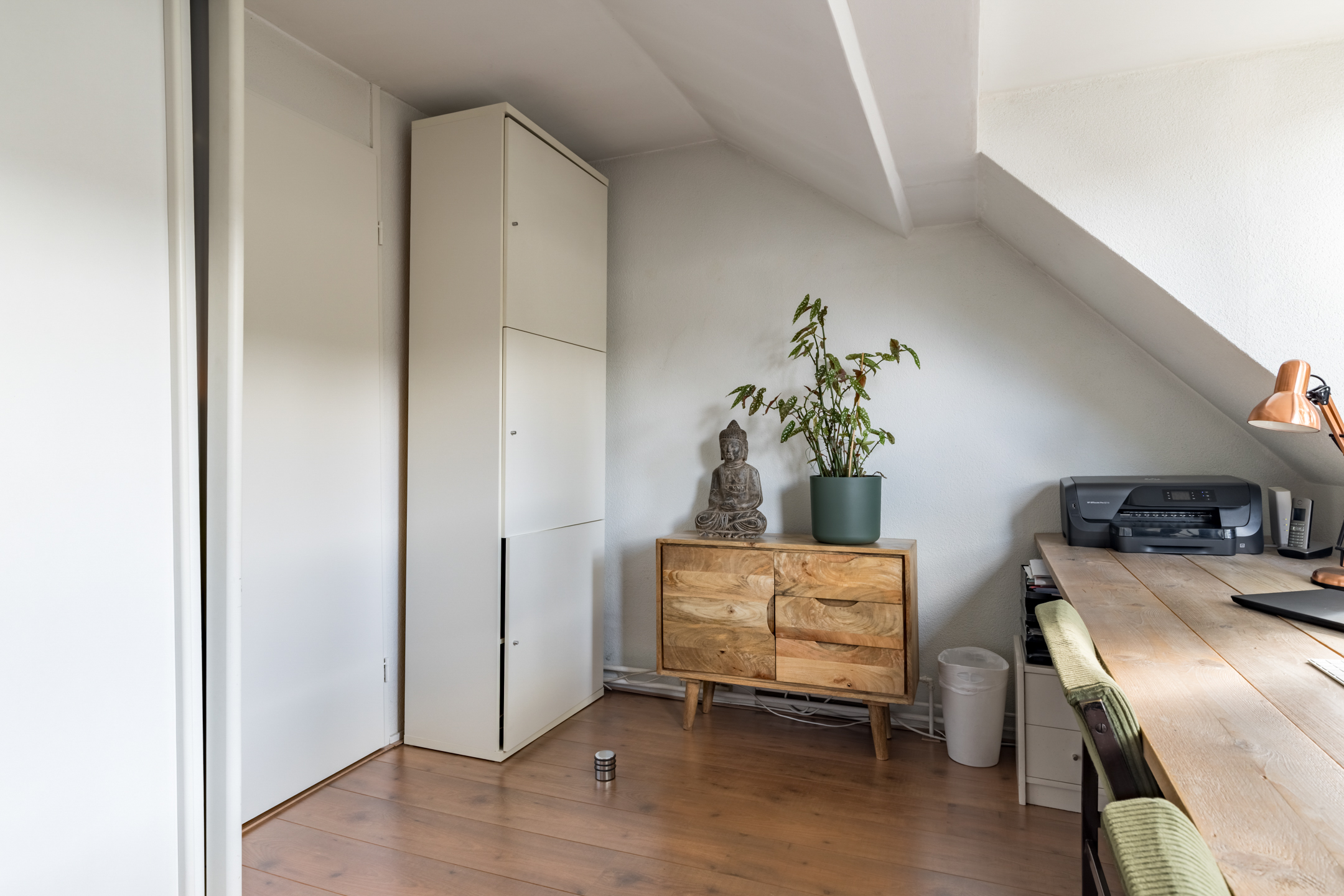 De kamer aan de voorzijde (ca. 10m2) is op dit moment ingericht als werkkamer. Dankzij de dakkapel is er veel ruimte en komt er lekker veel licht de kamer binnen. Wat een fijne plek om te werken, met zicht op de groene kruinen van de eikenboom vóór het huis.
