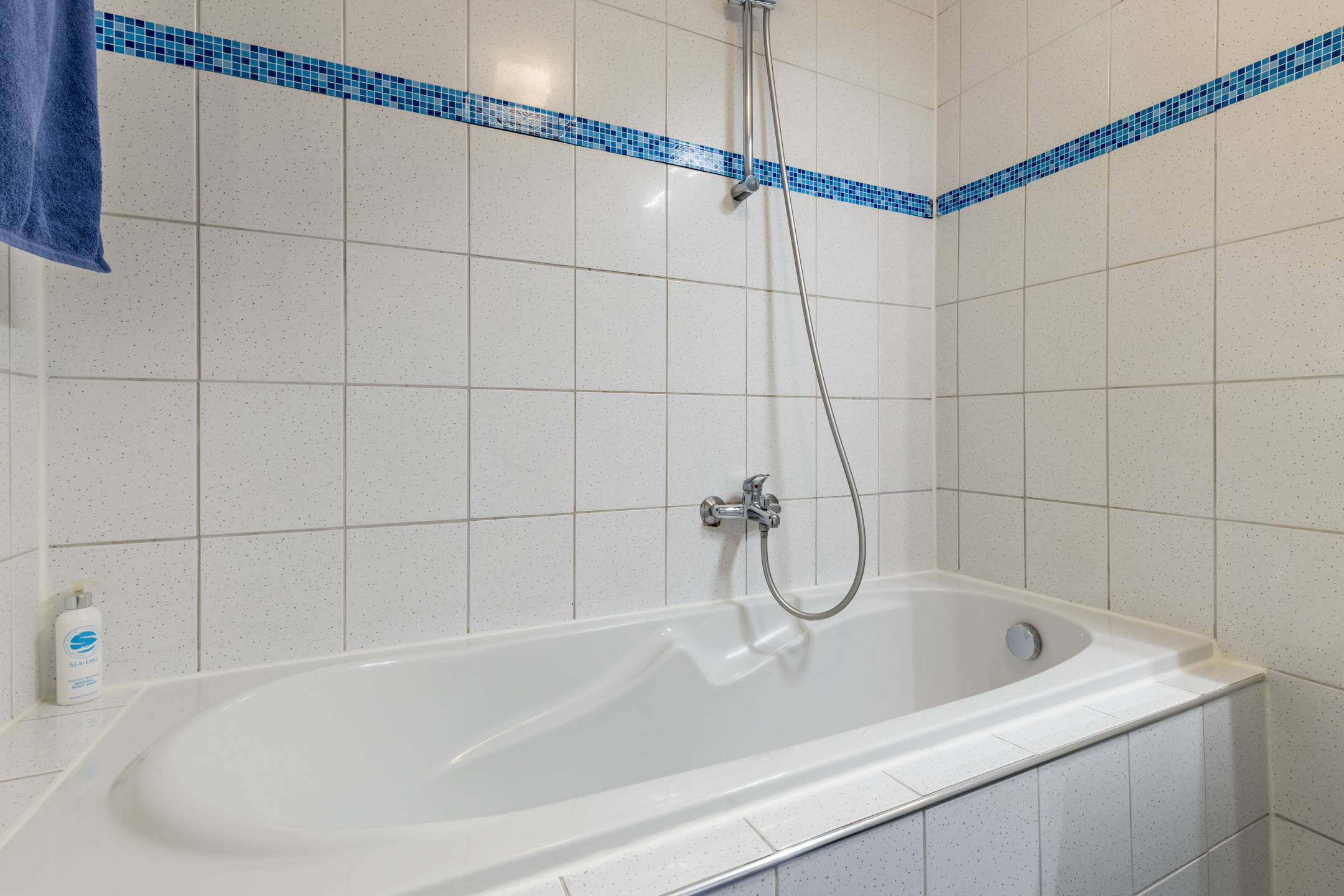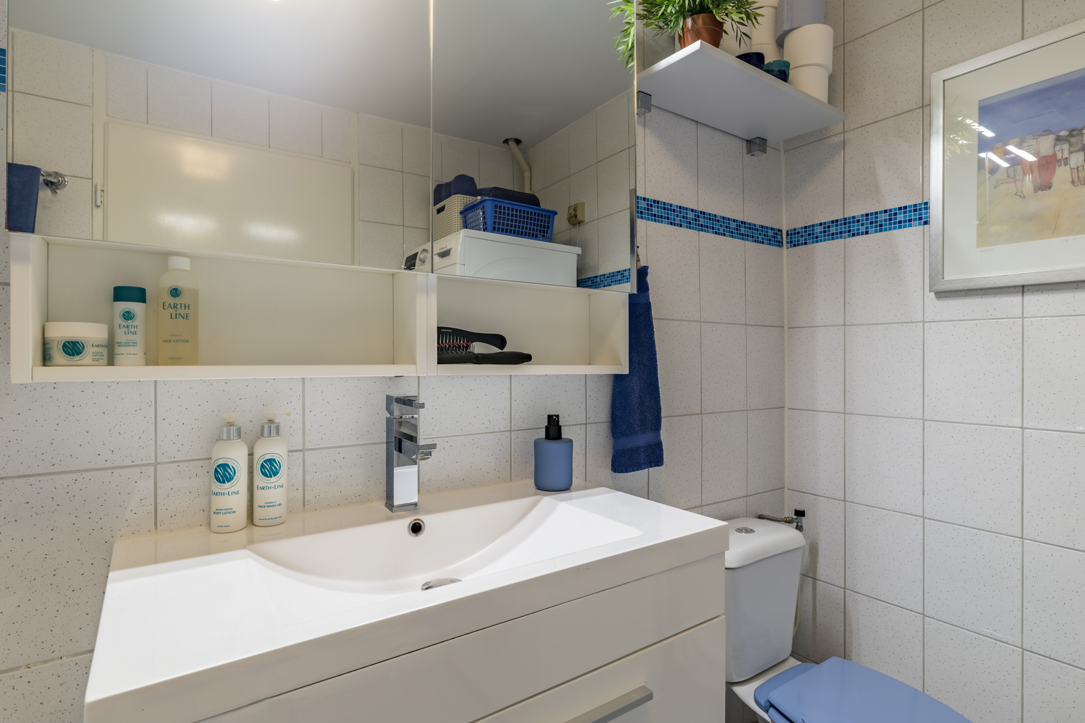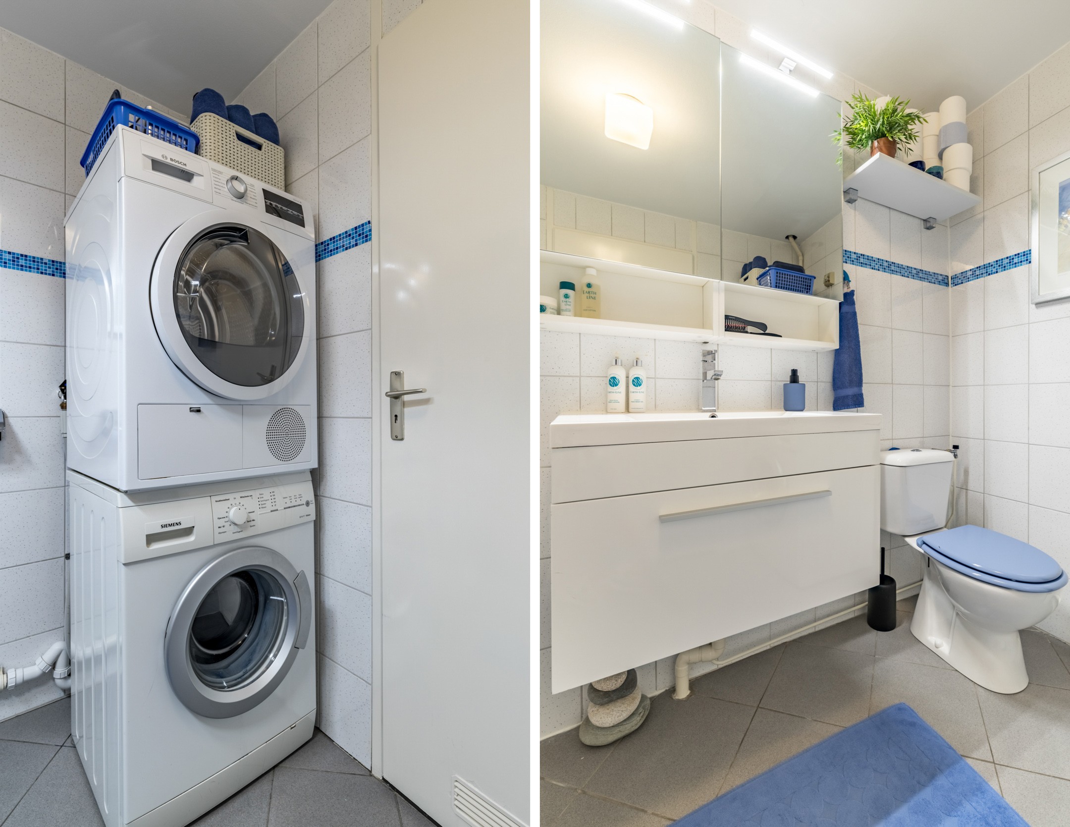 Tussen de twee kamers in bevindt zich de inpandige badkamer (ca. 4,9m2). Deze nette badkamer is voorzien van een ligbad, waar tevens in gedoucht kan worden. Het wastafelmeubel beschikt over een grote lade voor het opbergen van toiletartikelen en ook de spiegelkast erboven draagt ertoe bij dat alle spullen netjes uit het zicht opgeborgen kunnen worden. Daarnaast beschikt de badkamer over een tweede toilet en een opstelplaats voor de wasmachine en de droger.