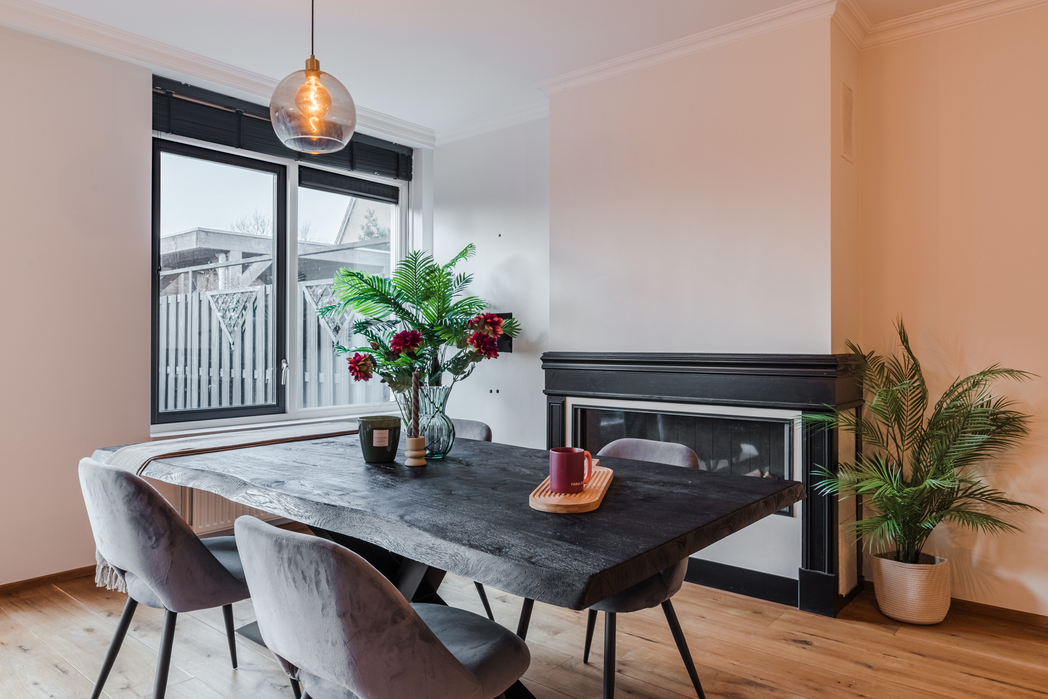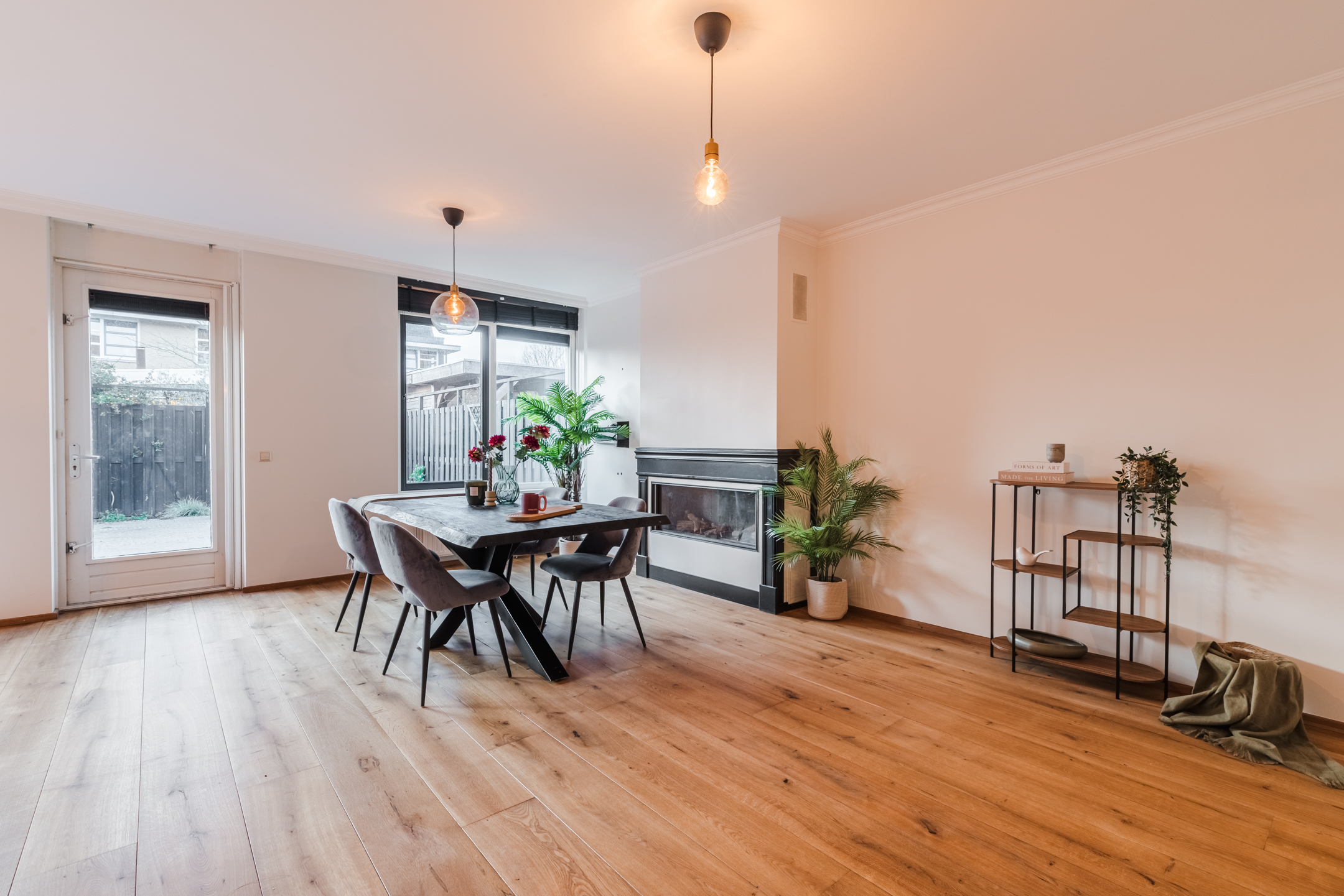 – Ruime, tuingerichte woonkamer met grote raampartijen en sfeervolle gashaard