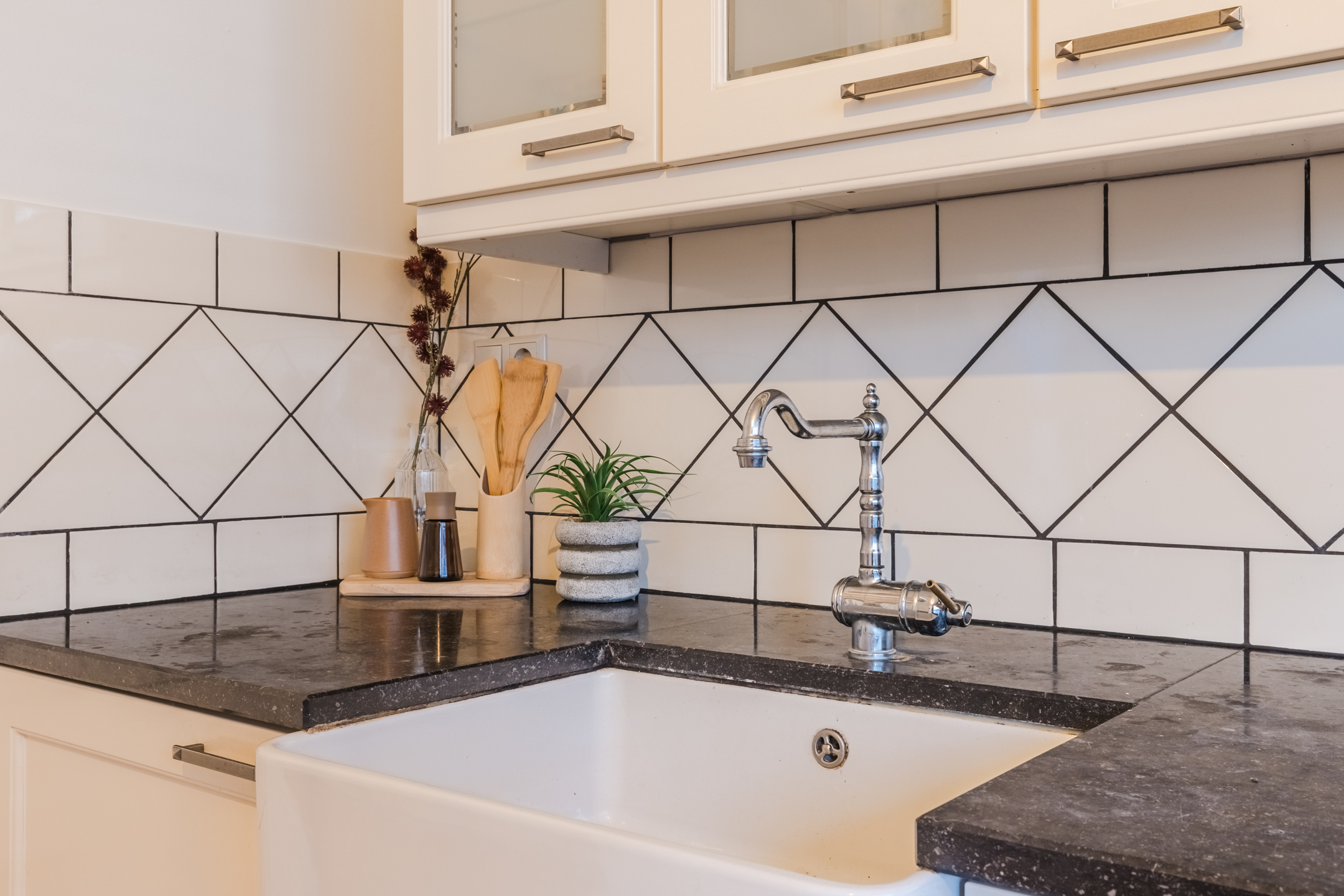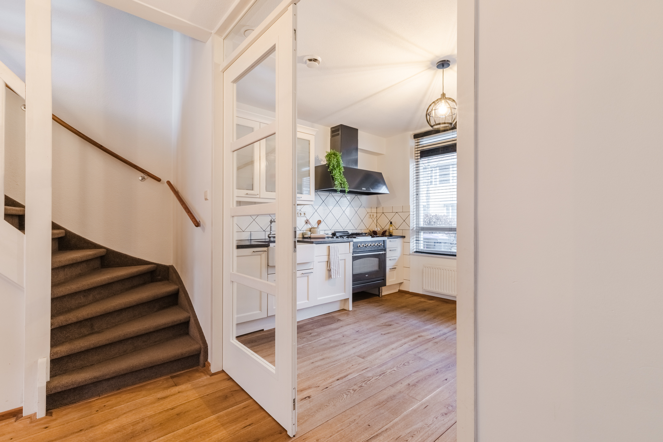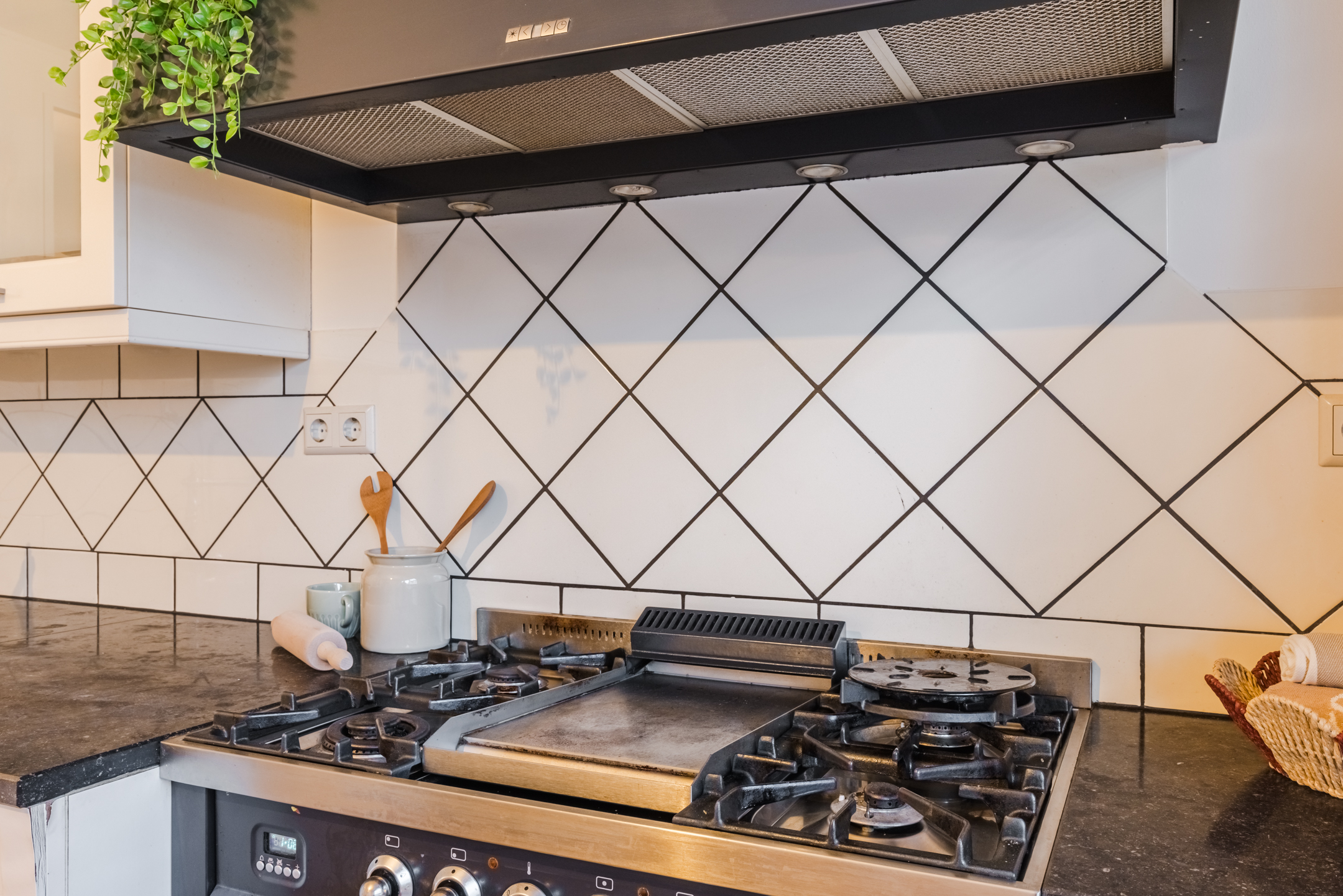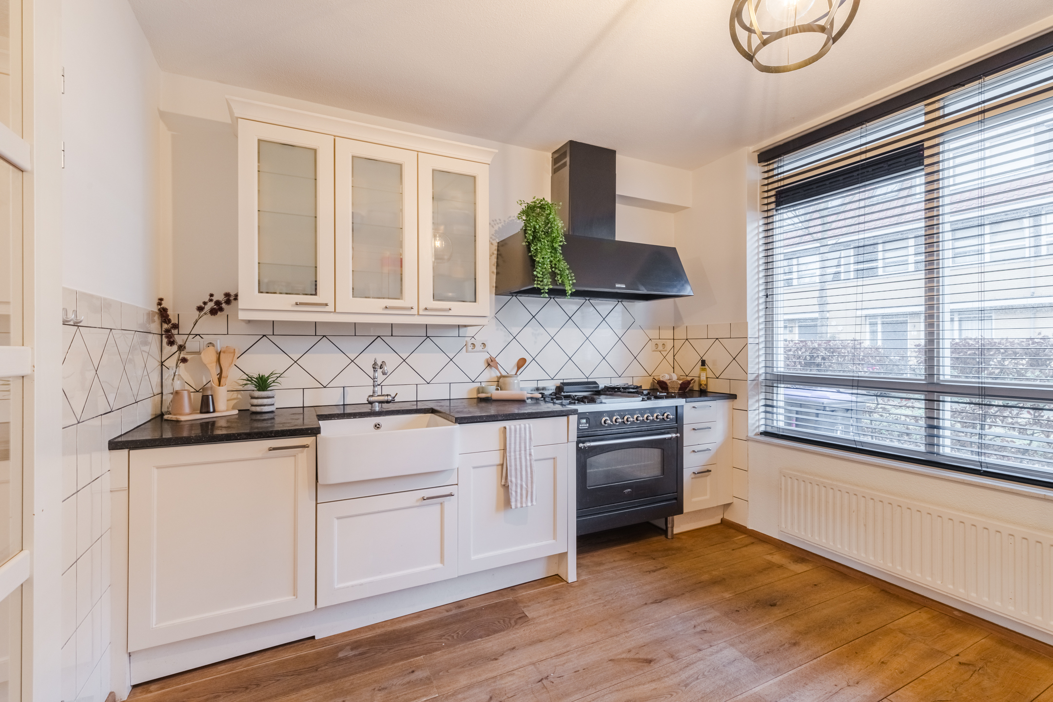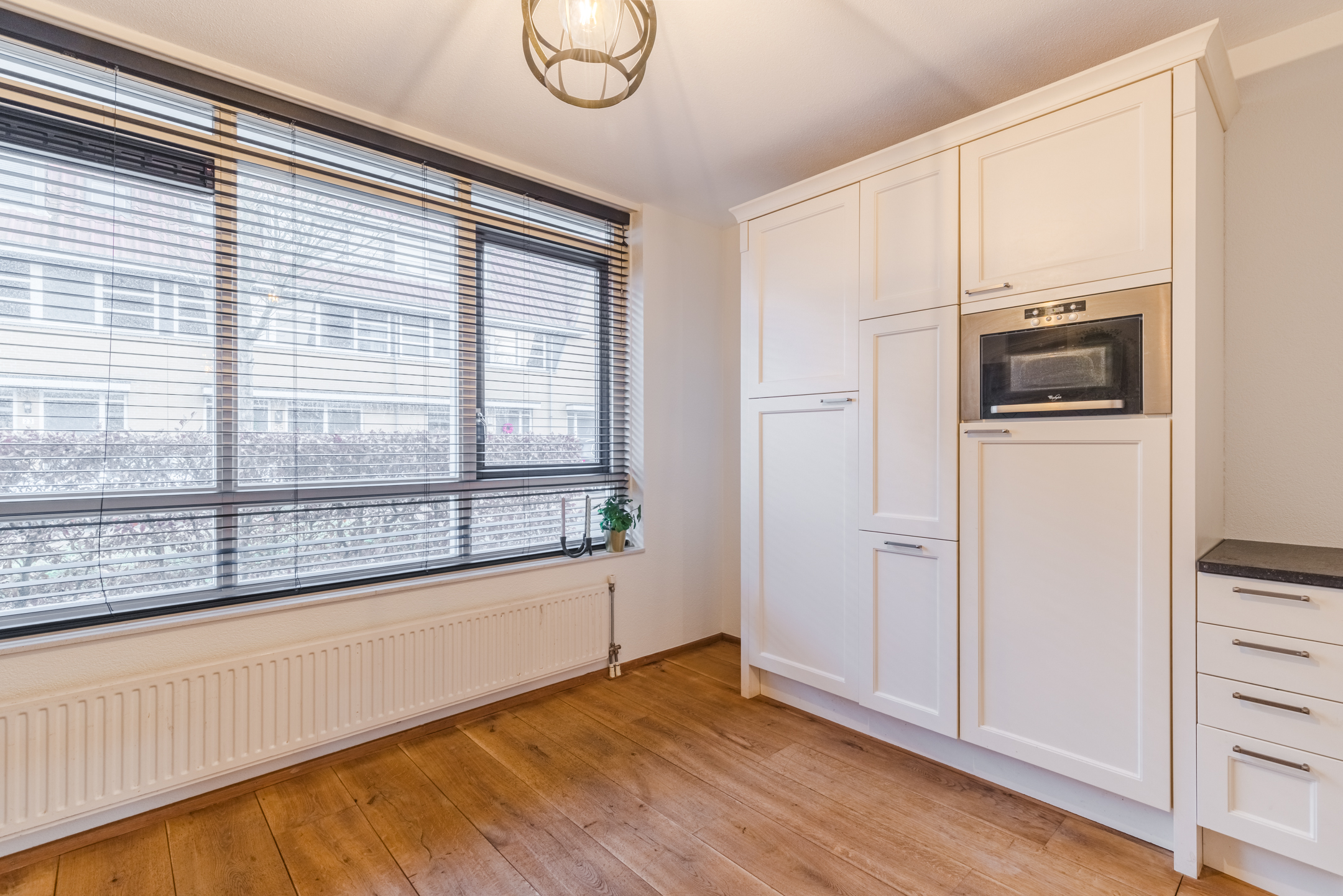 De keuken is voorzien van diverse (inbouw)apparatuur, waaronder een fraai 4-pits gasfornuis met grillplaat en oven, een stoere afzuigkap, een koel-/vriescombinatie en een magnetron. Dankzij de vele kasten beschikt de keuken over volop bergruimte. De grote raampartij zorgt bovendien voor een leuk uitzicht op de straat.