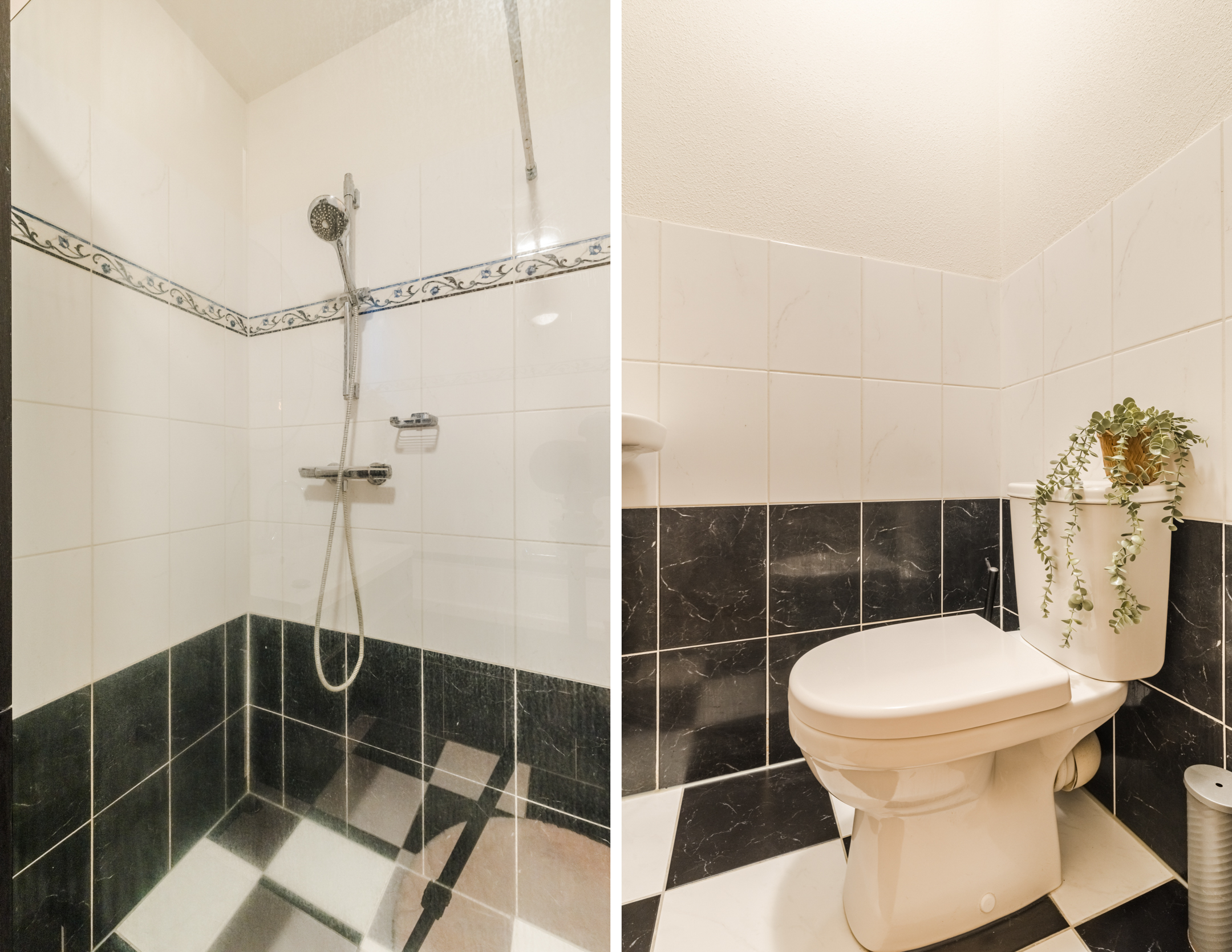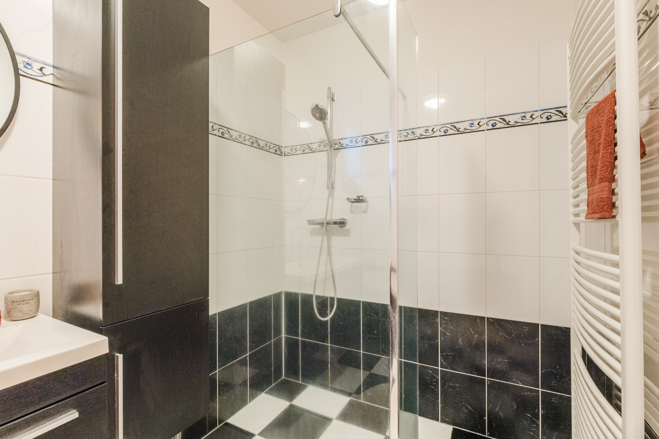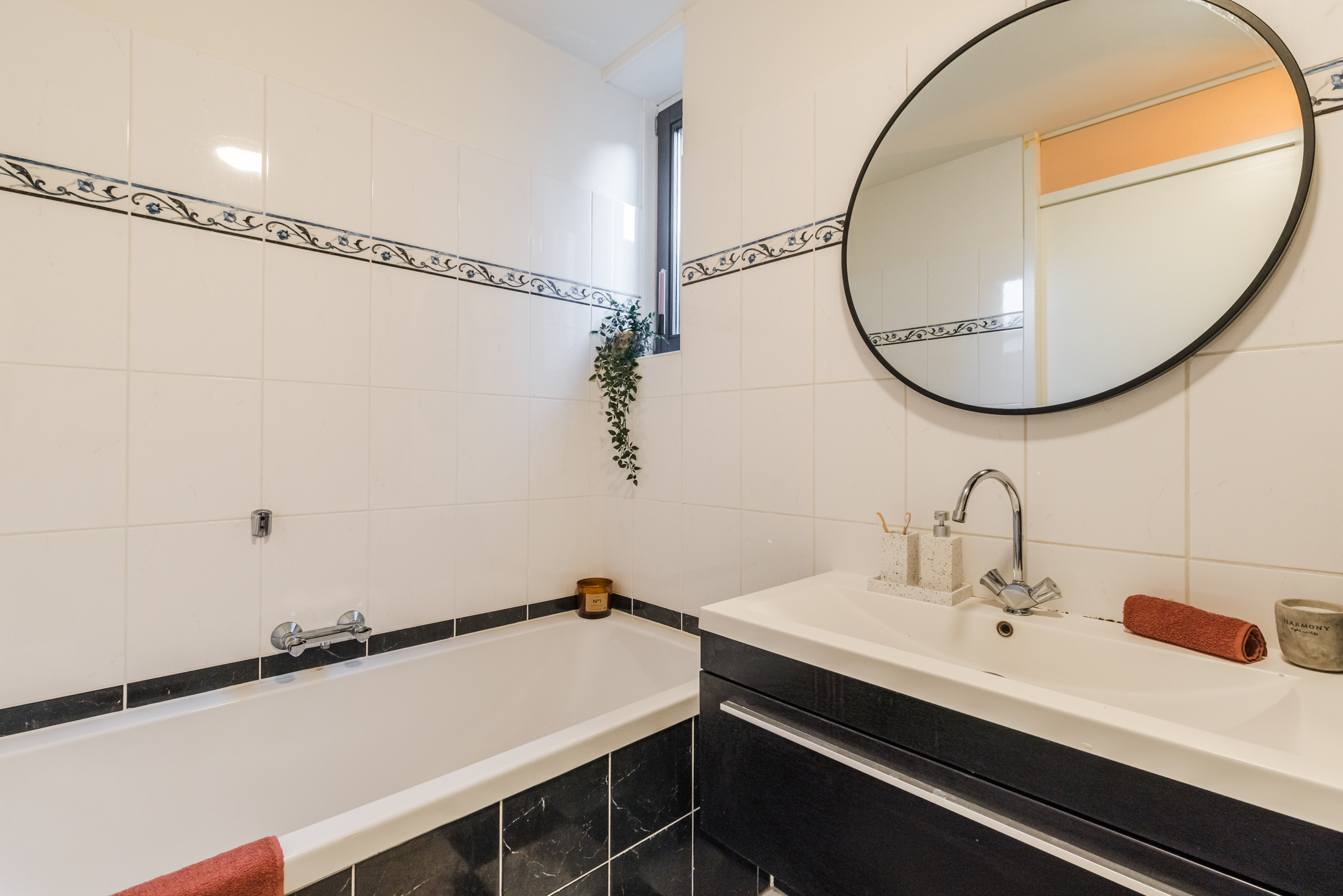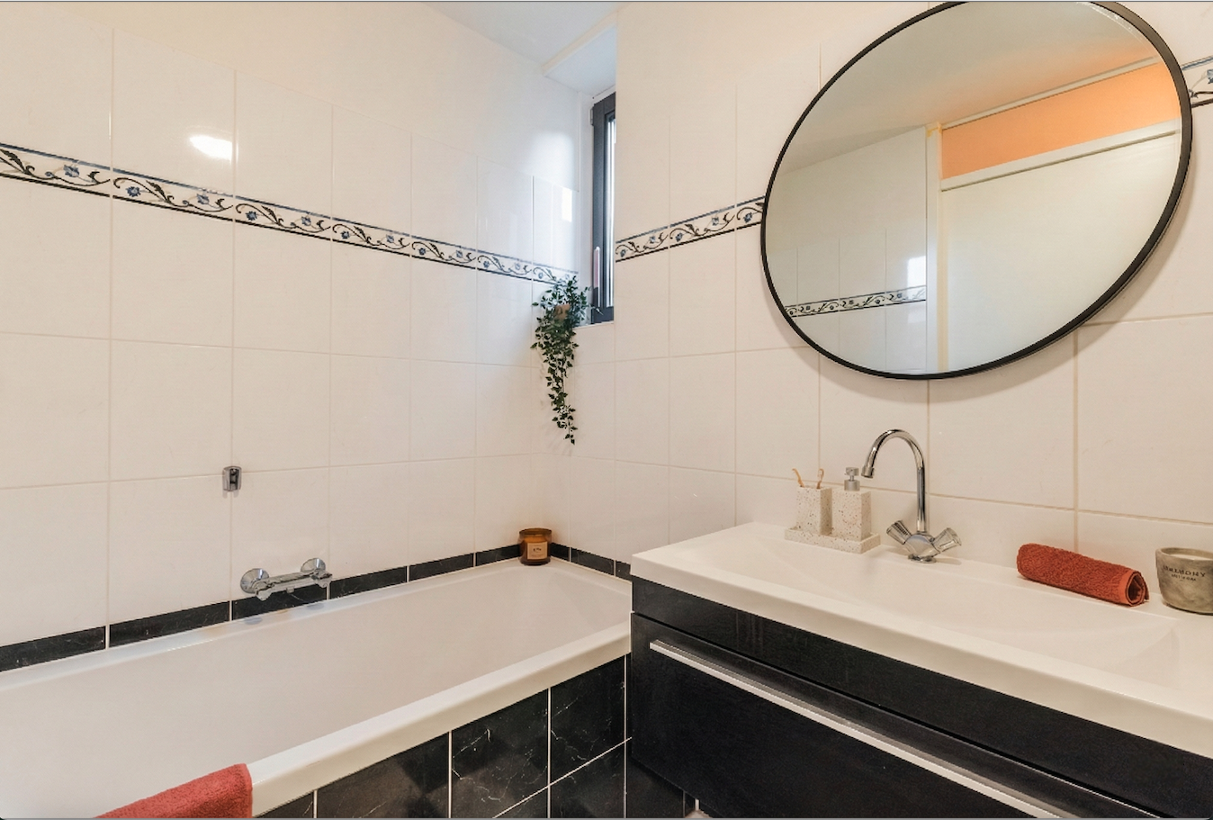 Aan de voorzijde bevindt zich één slaapkamer met leuk uitzicht op de brede straat. In het midden van de verdieping bevindt zich de inpandige badkamer, geheel betegeld in een stijlvolle wit-zwarte kleurstelling en voorzien van een ligbad, een inloopdouche, wastafel met meubel en kast, een handdoekradiator en mechanische ventilatie.