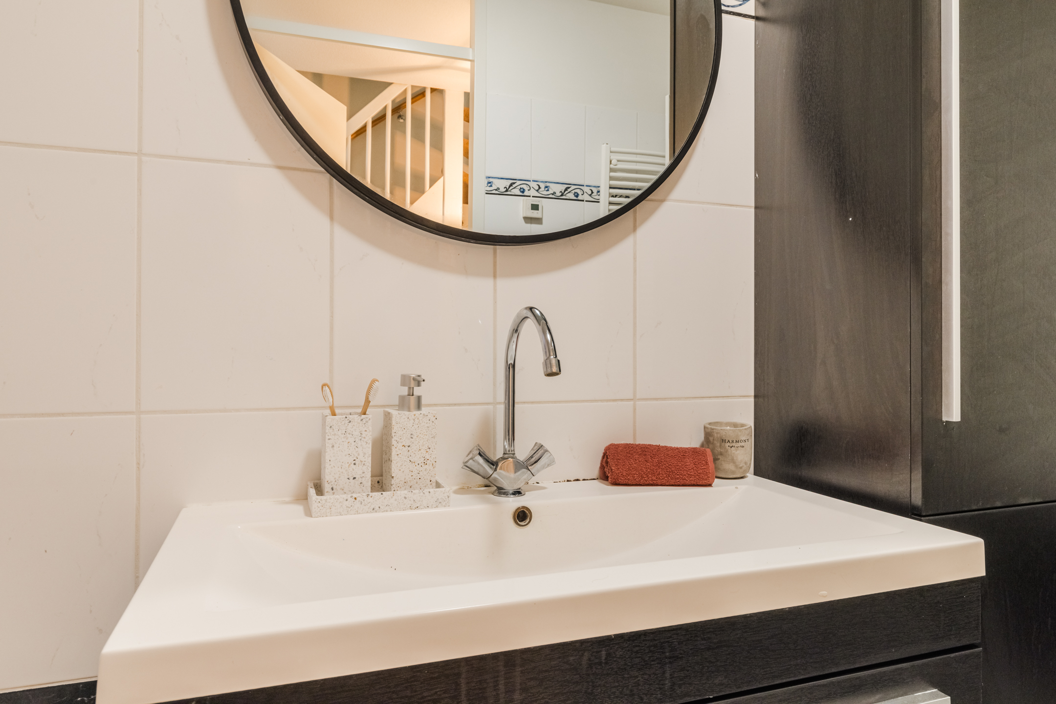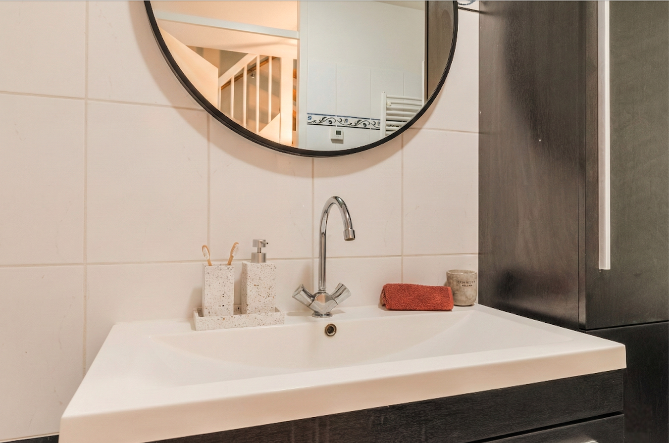 De separate toiletruimte, eveneens centraal gelegen op de woonlaag, is geheel betegeld en voorzien van een staand toilet en fontein.