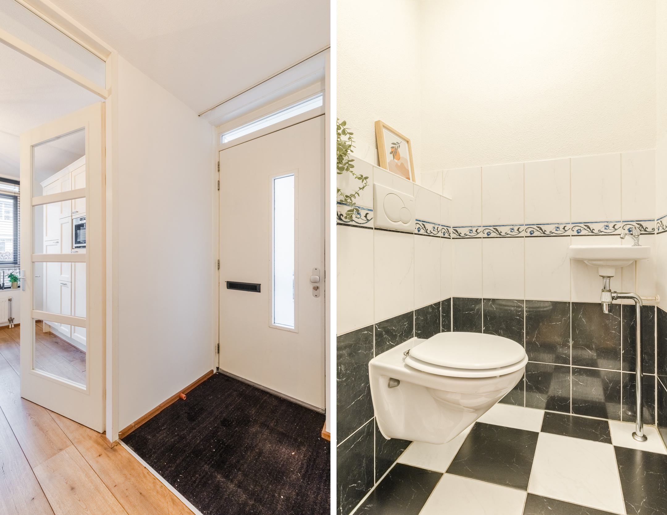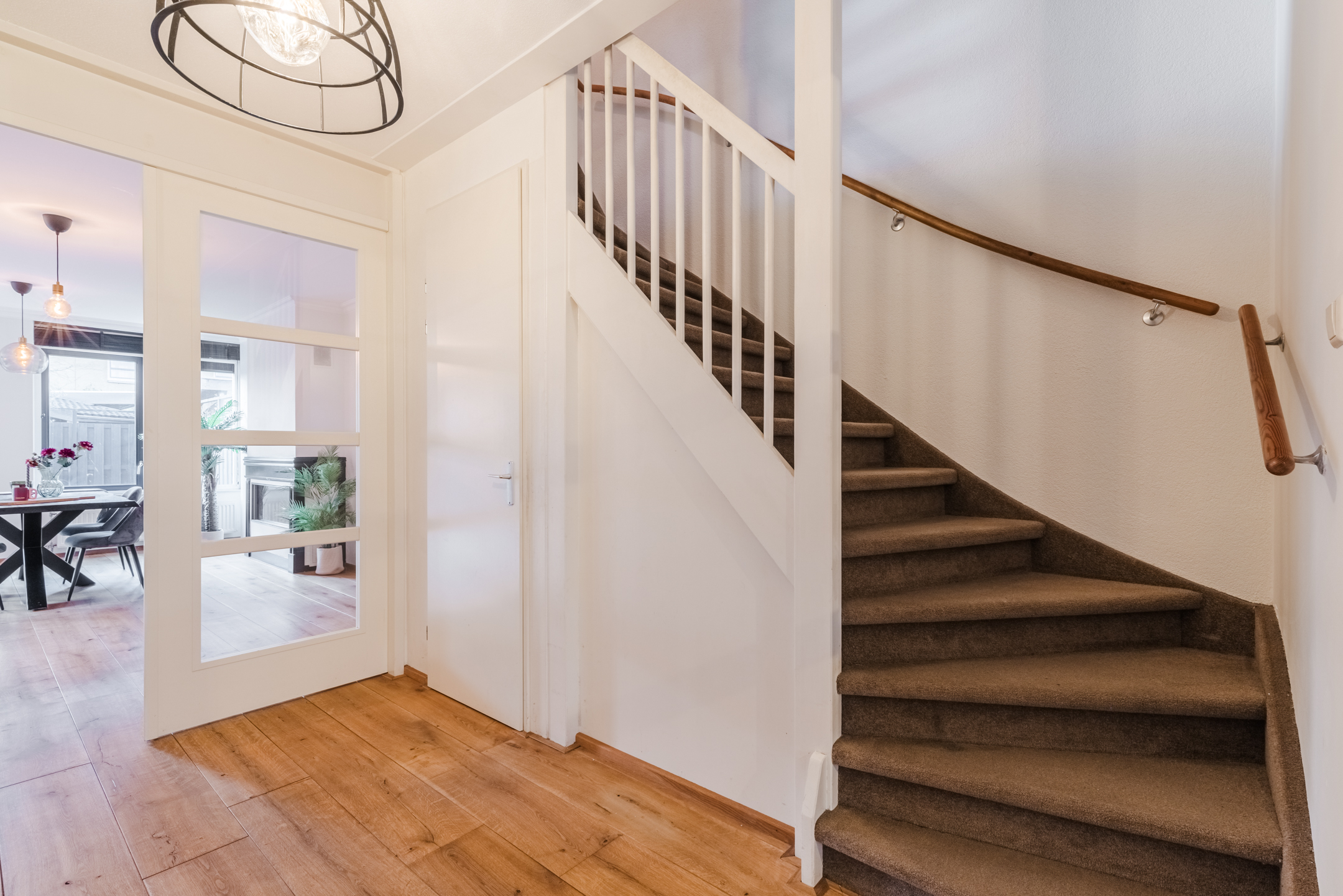Entree via de zijkant van de woning. Royale hal met meterkast, toiletruimte met hangend toilet en fontein, trapopgang naar de eerste verdieping en een handige trapkast.